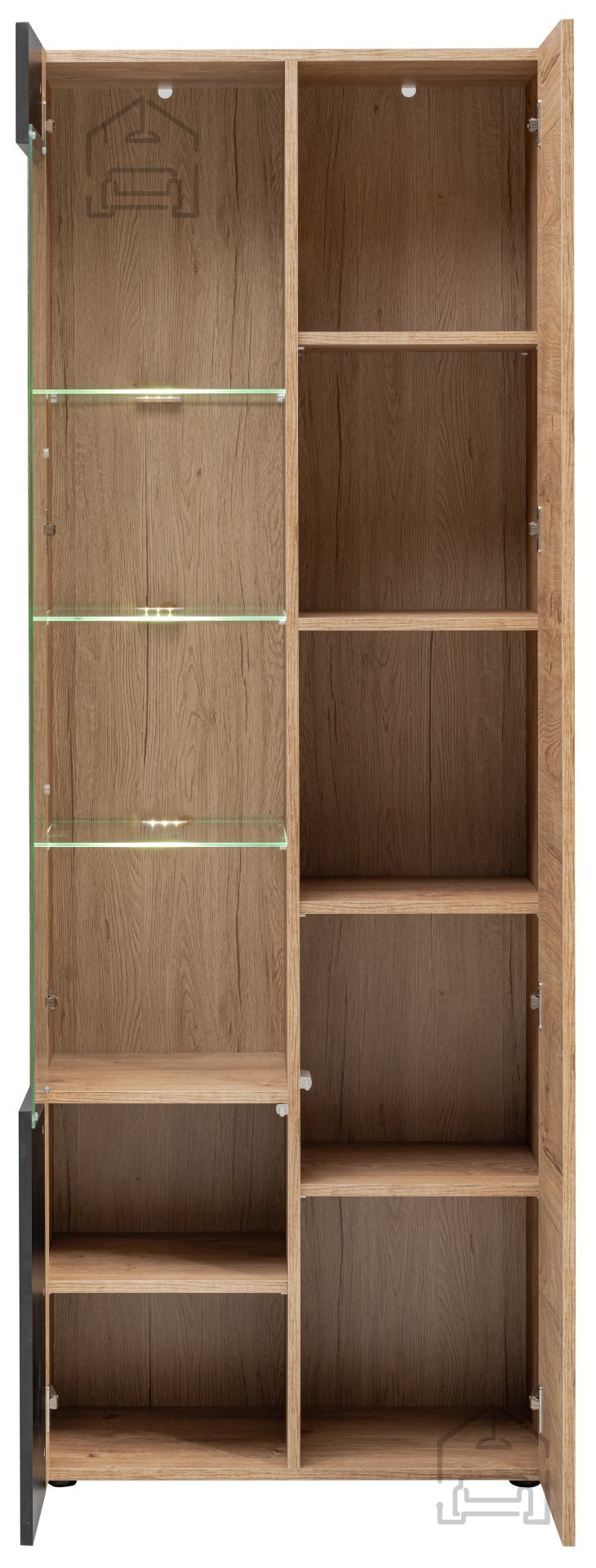 Die Vitrine Aron ist die perfekte Wahl für alle, die ihrem Zuhause einen Hauch moderner Eleganz und Praktikabilität verleihen möchten. Mit den Maßen 70x40x190 cm bietet sie genau das richtige Verhältnis zwischen Geräumigkeit und ästhetischer Attraktivität. Hergestellt aus hochwertiger Spanplatte, vereint diese Vitrine die natürliche Schönheit der Eiche Ribbeck mit modernen schwarzen Paneelen, was einen harmonischen Kontrast schafft, der zu jedem Innendesign passt.
