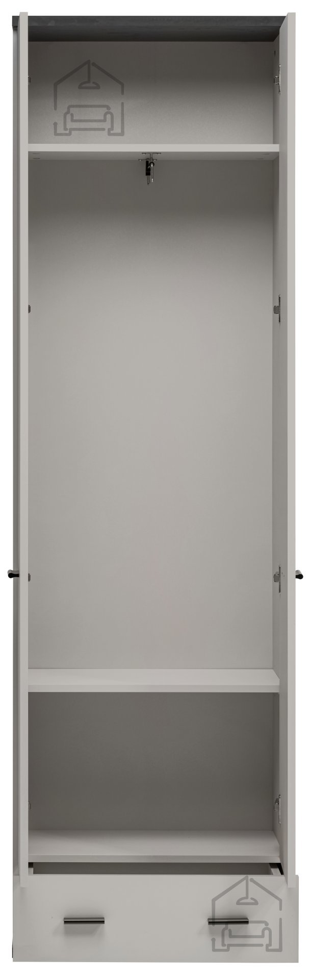 Der Schrank Hugo Typ A ist für eine optimale Raumnutzung konzipiert. Er enthält zwei praktische Türen und eine Schublade am Boden, in der Sie kleinere Gegenstände oder Accessoires aufbewahren können. Hinter den Türen erwartet Sie ein Regal oben, ideal zum Stapeln von Boxen oder saisonaler Kleidung, während die Kleiderstange ein ordentliches Aufhängen Ihrer Lieblingsstücke ermöglicht. Ein zusätzliches Regal am Boden bietet weitere Aufbewahrungsmöglichkeiten, sodass Ihr Raum stets aufgeräumt und organisiert bleibt.