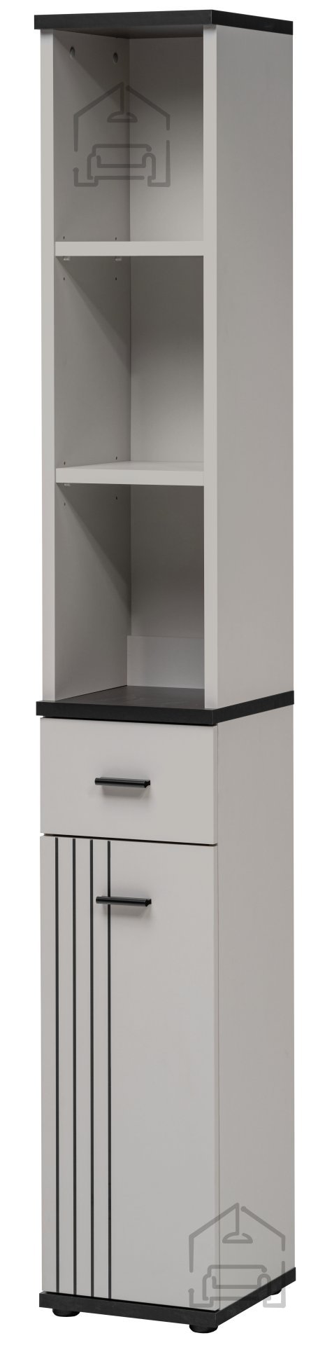Der Schrank Hugo Typ B+C ist aus hochwertiger Spanplatte gefertigt, die Haltbarkeit und eine lange Lebensdauer gewährleistet. Der Korpus in eleganter Kaschmirfarbe harmoniert perfekt mit den schwarzen Fronten und schafft so ein modernes und zugleich zeitloses Erscheinungsbild. Diese Farbkombination fügt sich mühelos in verschiedene Einrichtungsstile ein, von modern bis klassisch.