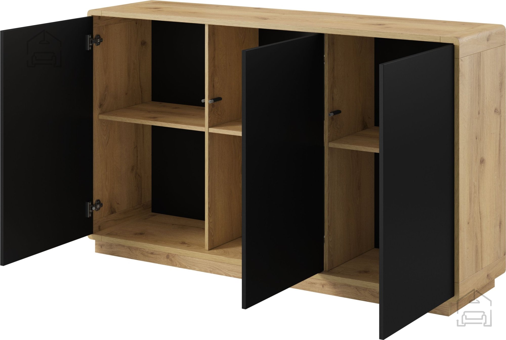 Die Kommode Aston überzeugt mit den Maßen 160x40x75 cm und bietet reichlich Stauraum, ohne dass Sie beim Design Kompromisse eingehen müssen. Gefertigt aus robustem Spanplattenmaterial, garantiert sie Langlebigkeit und Widerstandsfähigkeit im Alltag. Die Kombination aus Eiche Taurus und schwarzem Supermatt verleiht der Kommode einen modernen, eleganten Look, der sich harmonisch in verschiedenste Einrichtungsstile einfügt.
