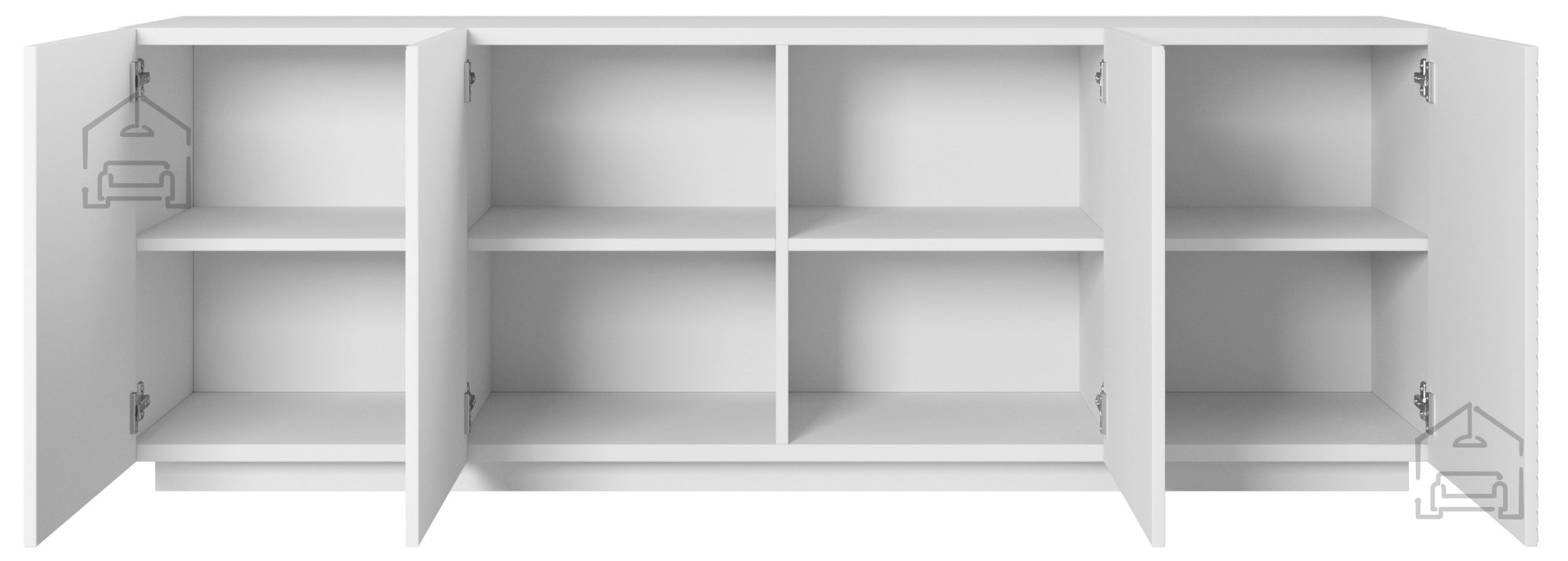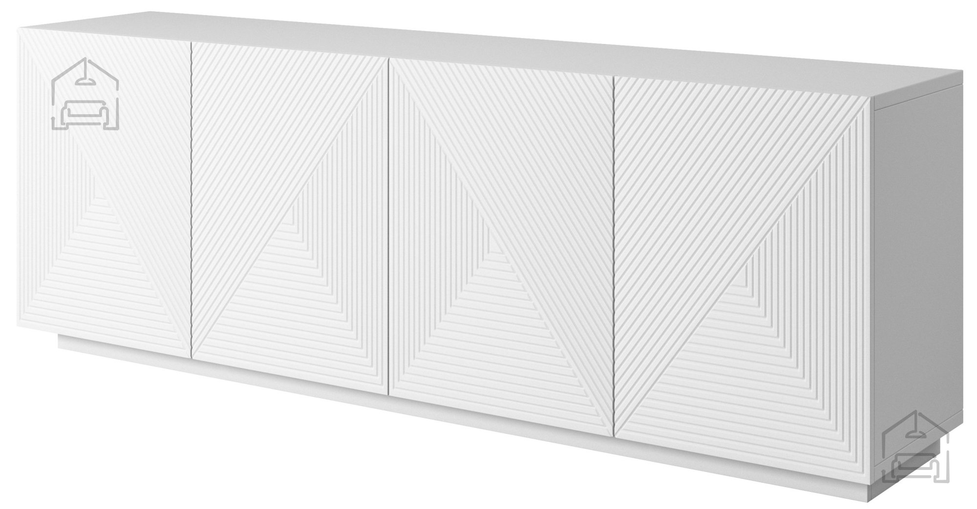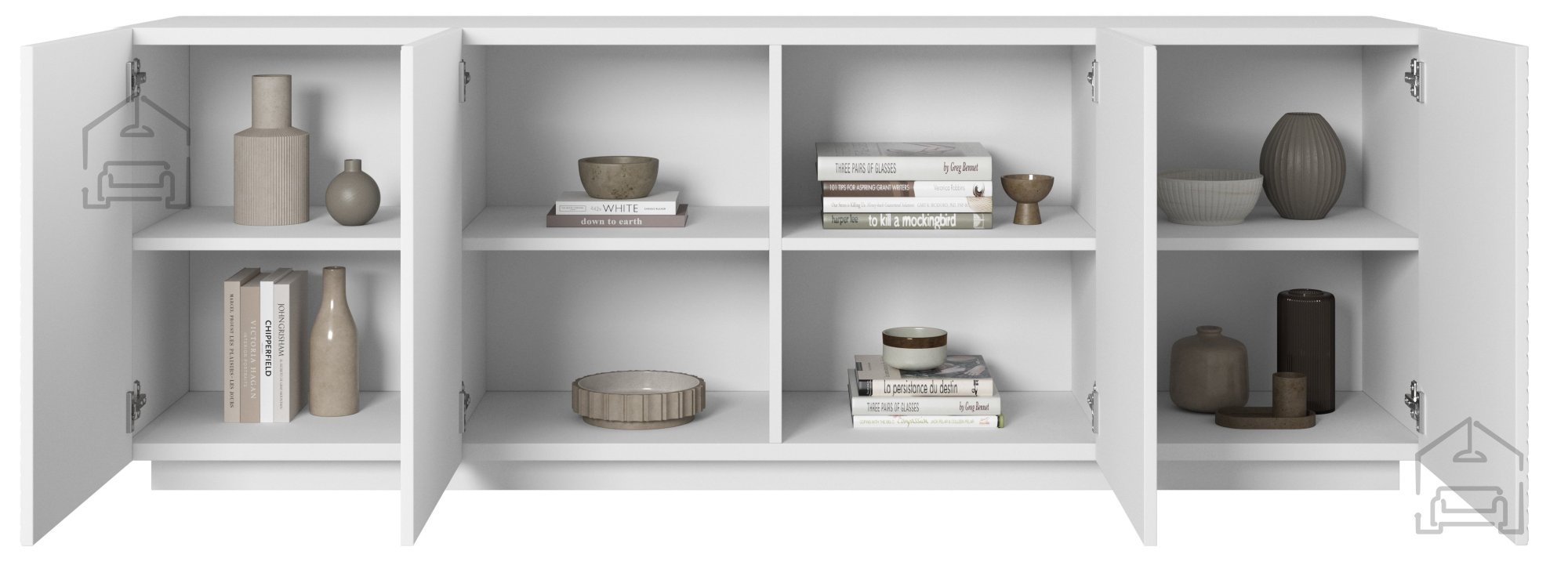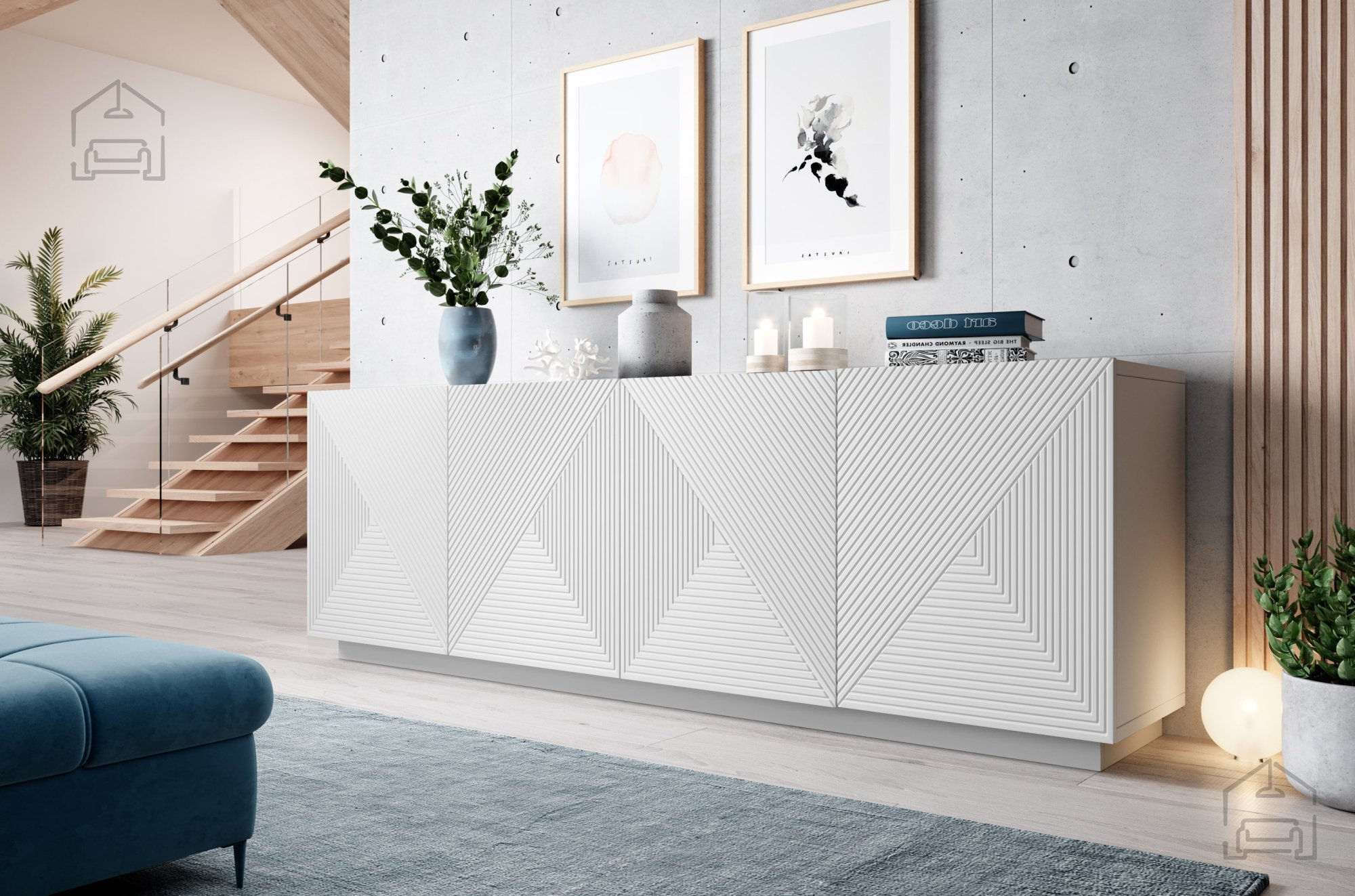 Verleihen Sie Ihrem Wohnraum mit der Kommode Asha 200 4D einen Hauch von Stil und Funktionalität. Sie wurde für alle entworfen, die Wert auf Schlichtheit und Eleganz legen, und bringt mit ihrer matten weißen Oberfläche und dem klaren Design frische Leichtigkeit in Ihr Zuhause.