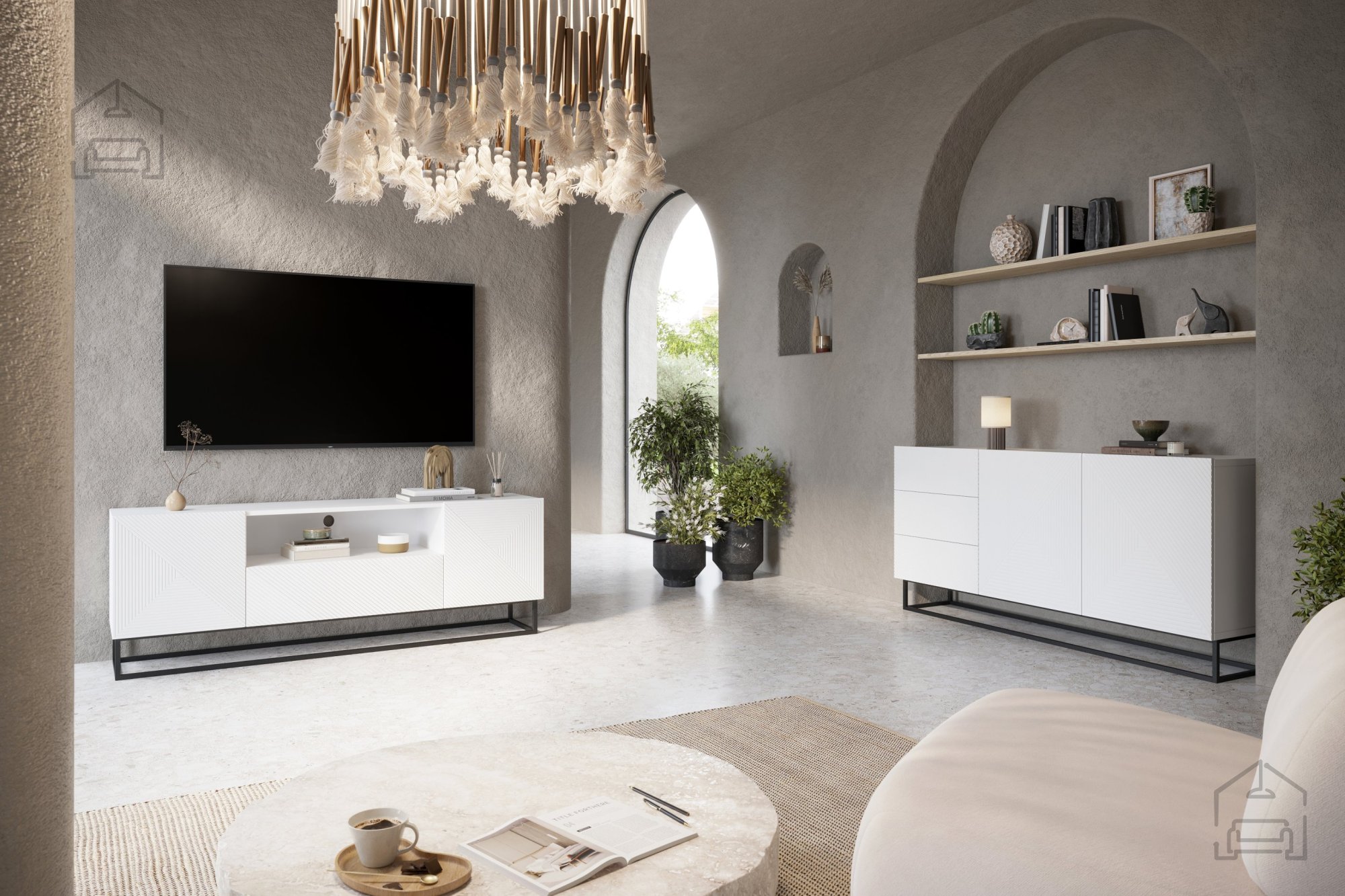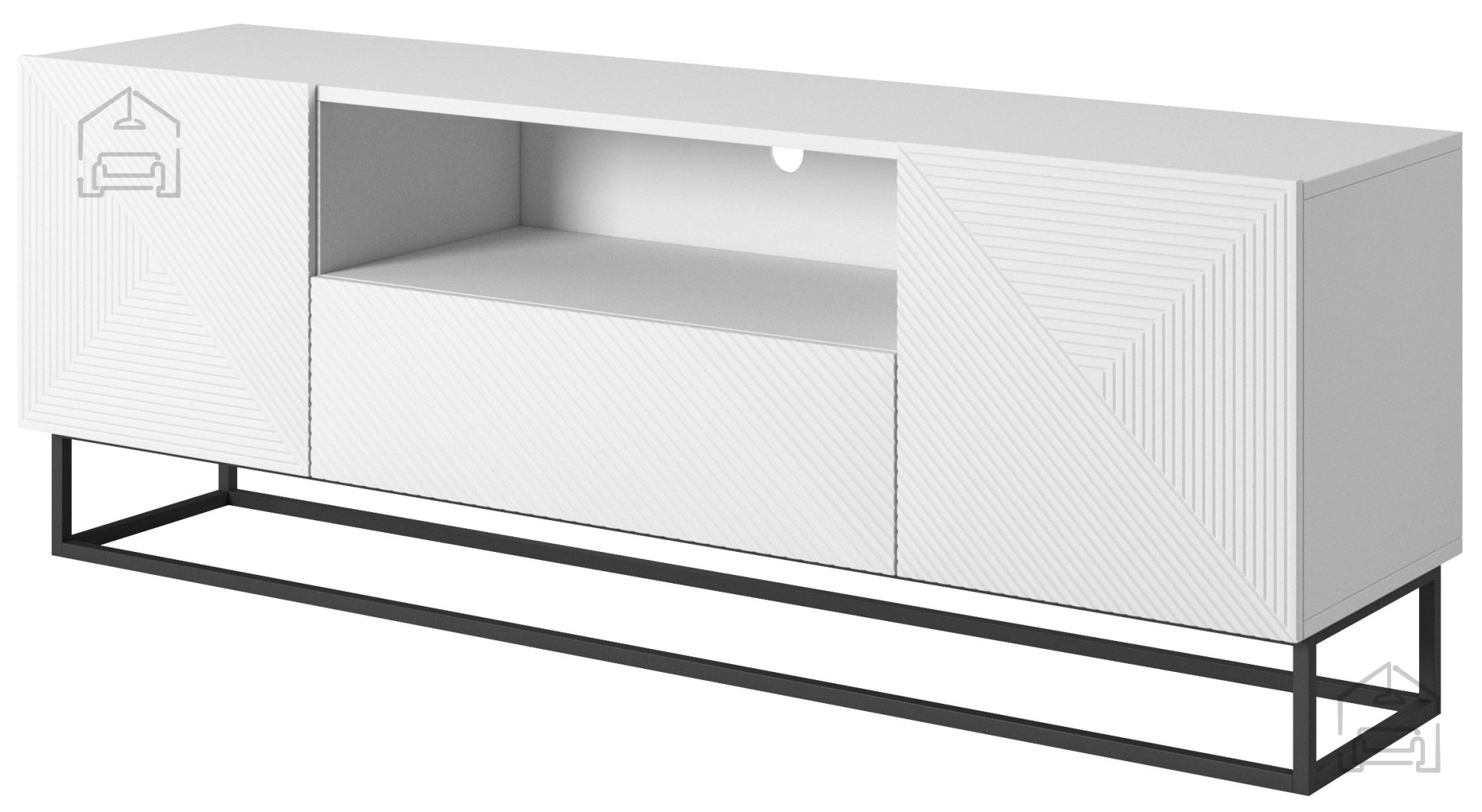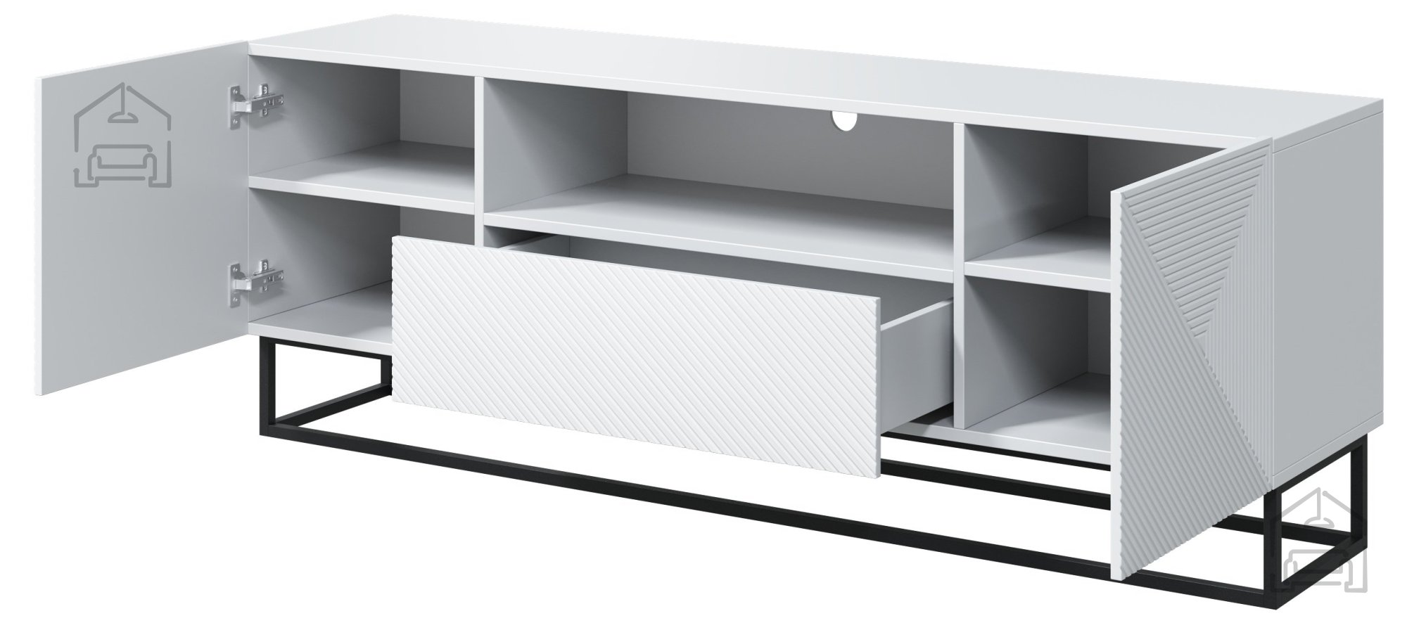 Wenn Sie auf der Suche nach dem perfekten Möbelstück sind, das Ihr Wohnzimmer ergänzt, ist die TV-Kommode Asha 167 2D1SZ genau die richtige Wahl. Dieses wunderschöne Möbelstück vereint modernes, minimalistisches Design mit hoher Funktionalität und fügt sich harmonisch in jedes Zuhause ein. Die matte, weiße Oberfläche in Kombination mit dem Metallgestell sorgt für ein elegantes Gesamtbild.