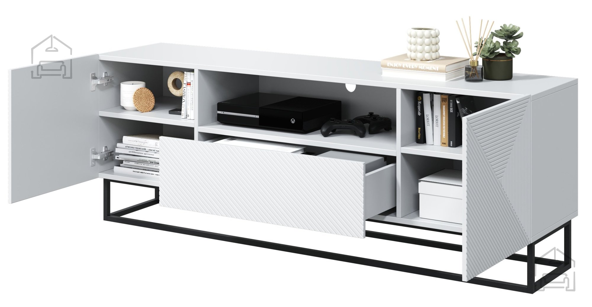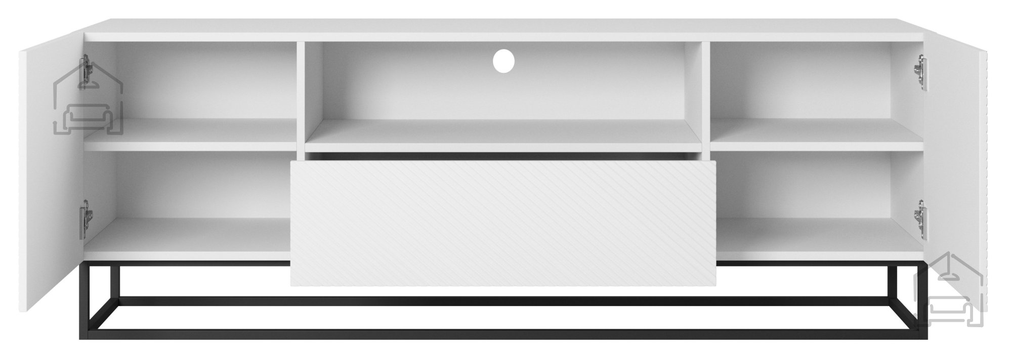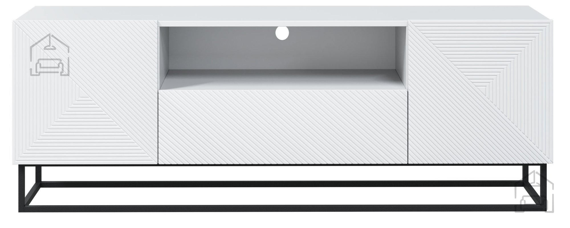 Die TV-Kommode wurde aus sorgfältig ausgewählten Materialien gefertigt, die Langlebigkeit und Stabilität gewährleisten. Der Korpus besteht aus einer 16 mm starken laminierten Platte, während die Fronten aus MDF-Platten mit PVC-Folie überzogen sind – das macht sie kratzfest und pflegeleicht. Die Kanten sind mit ABS versehen, was sie stoßfest macht und den makellosen Look über viele Jahre erhält. Das pulverbeschichtete Metallgestell sorgt nicht nur für Stabilität, sondern verleiht dem Möbelstück auch einen modernen, industriellen Charakter, wie er derzeit sehr beliebt ist. Die 16 cm hohen Füße erleichtern das Reinigen unter der Kommode und sorgen zudem für ein luftiges Raumgefühl.