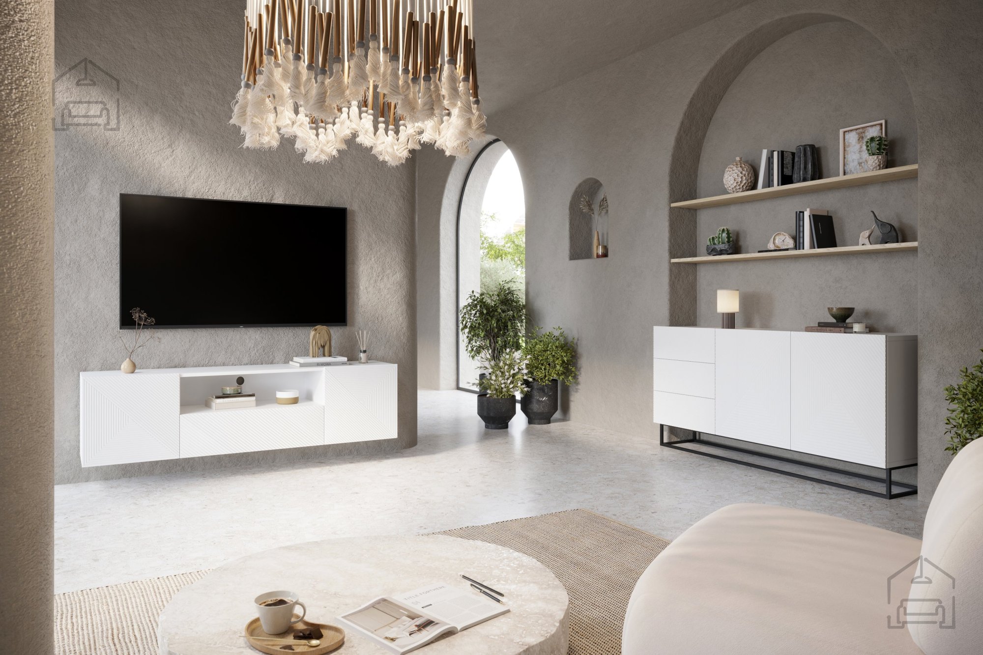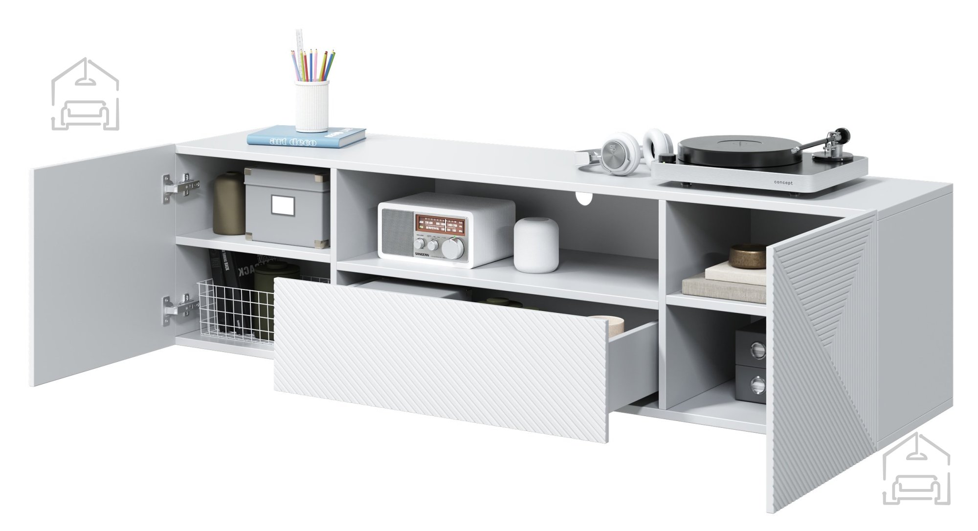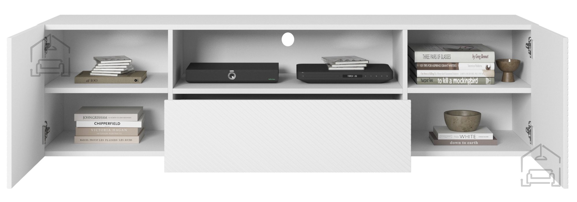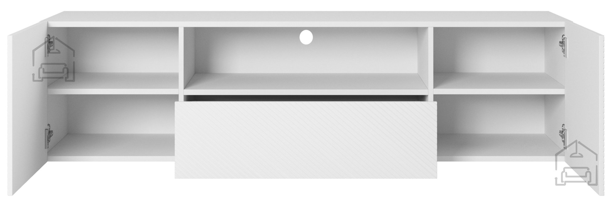 Wir präsentieren Ihnen die Wand-TV-Kommode Asha 167 2D1SZ in einem zeitlosen, mattweißen Farbton, der Ihrem Wohnzimmer einen modernen und eleganten Touch verleiht. Diese Kommode überzeugt nicht nur optisch, sondern auch durch hohe Alltagstauglichkeit, da sie viel Platz zur Aufbewahrung und Organisation Ihrer Multimedia-Geräte und Zubehörteile bietet.