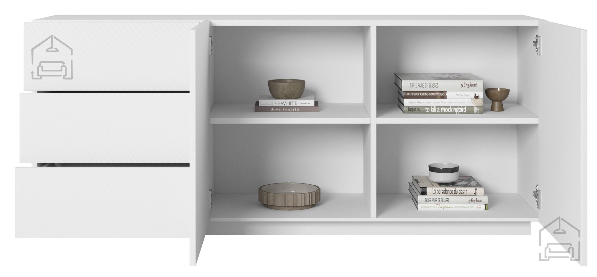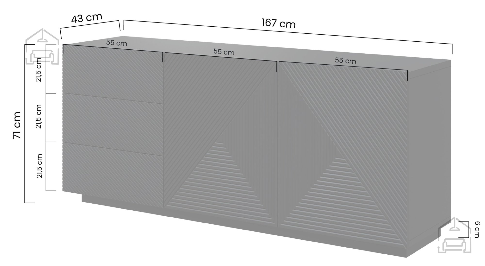 Der stabile niedrige Sockel unterstreicht das moderne Design und die klaren Linien der Kommode. Mit ihren großzügigen Maßen von 167x43x71 cm bietet sie reichlich Stauraum – perfekt für Alltagsgegenstände oder dekorative Accessoires.