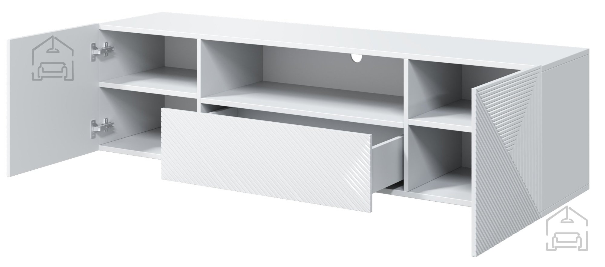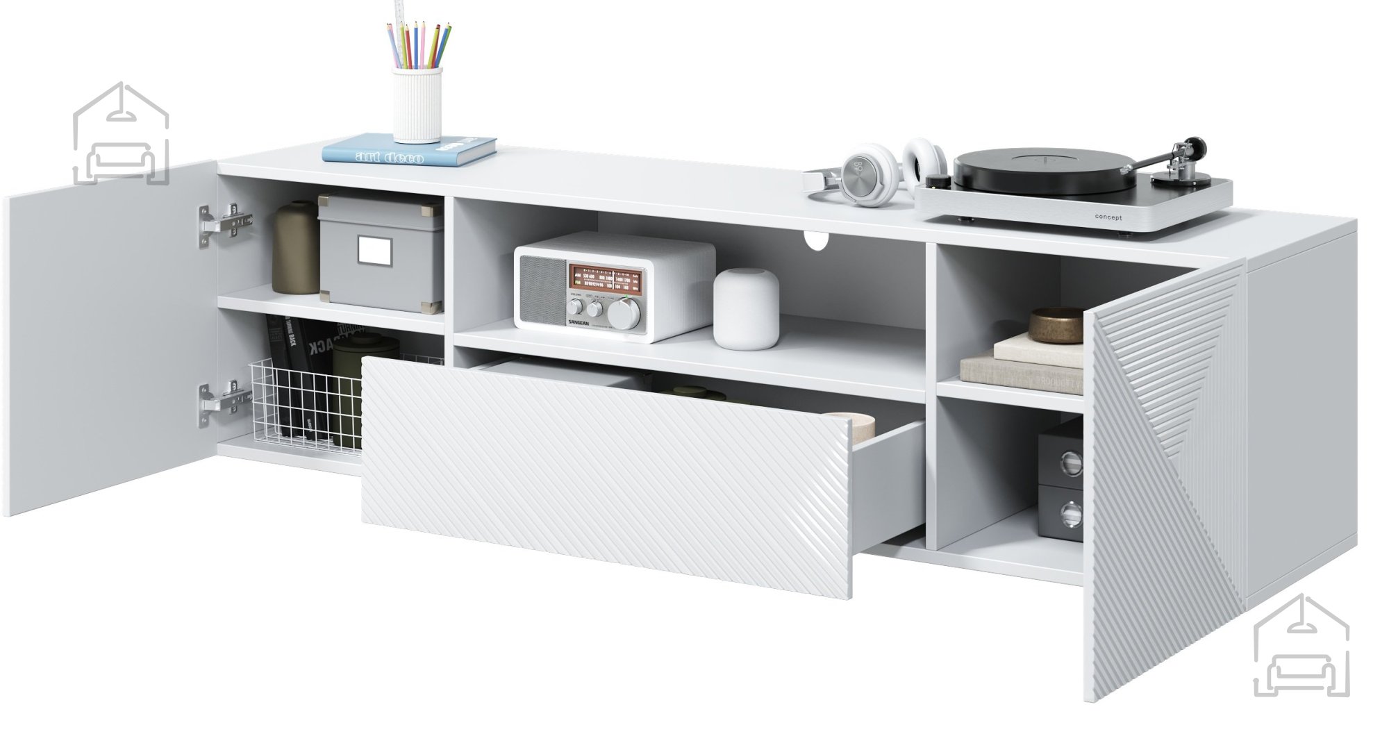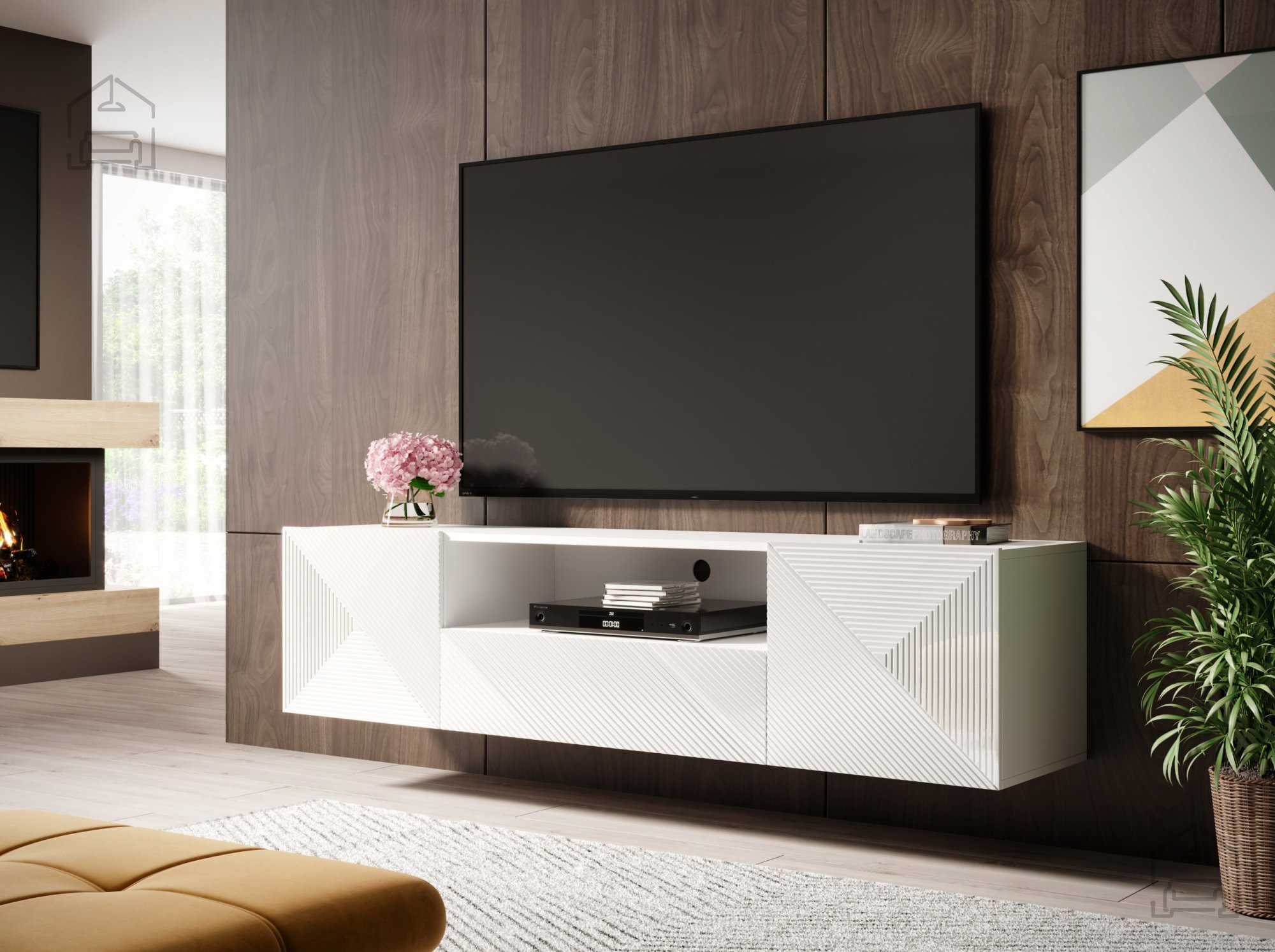 Verleihen Sie Ihrem Wohnzimmer einen modernen Touch mit der Wand-TV-Kommode Asha 167 2D1SZ, die Eleganz und Funktionalität in einem stilvollen Möbelstück vereint. Mit ihrer hochglänzenden weißen Oberfläche und dem klaren, minimalistischen Design wird sie schnell zum Blickfang in jedem modernen Wohnraum.