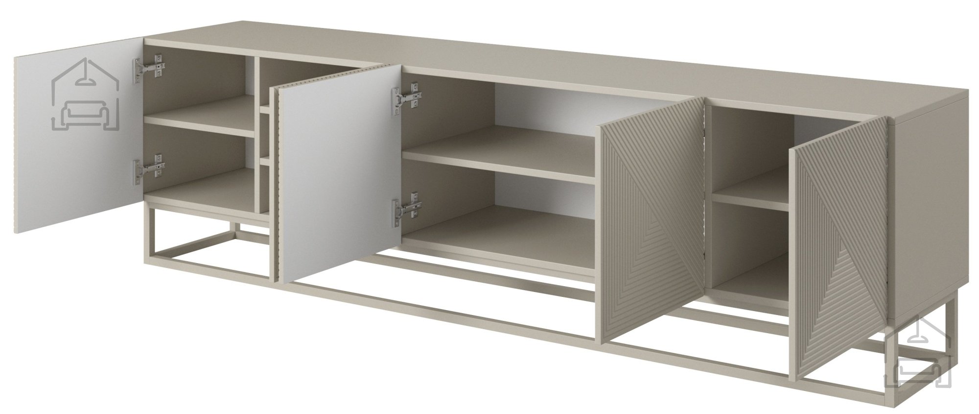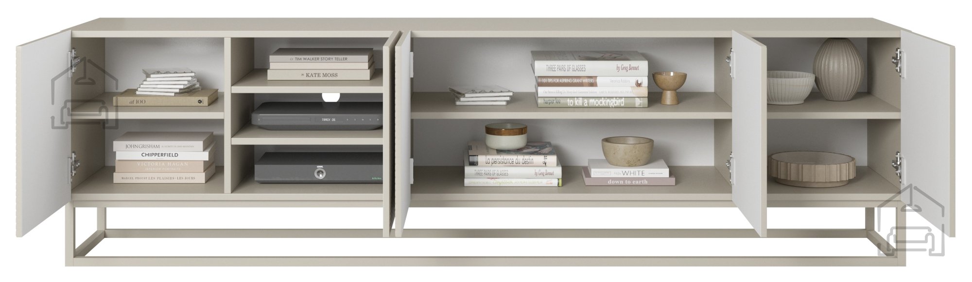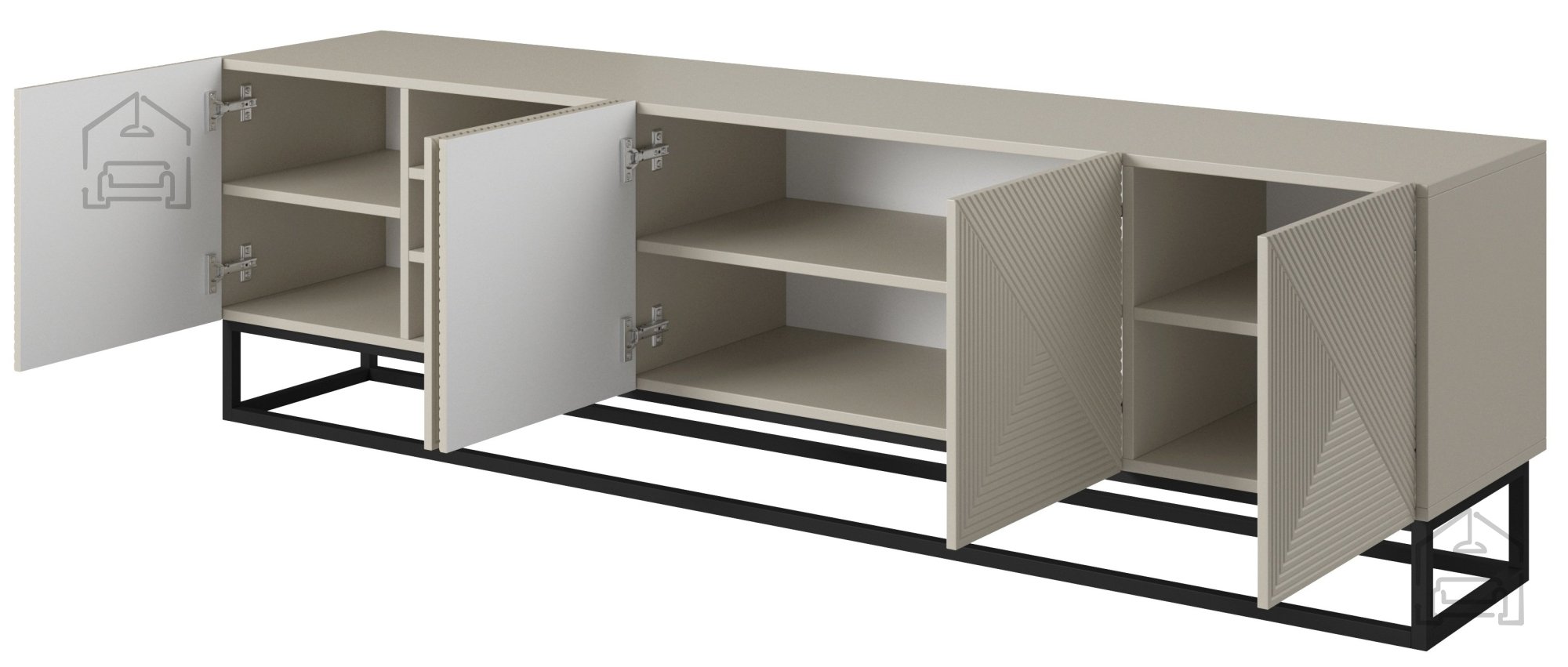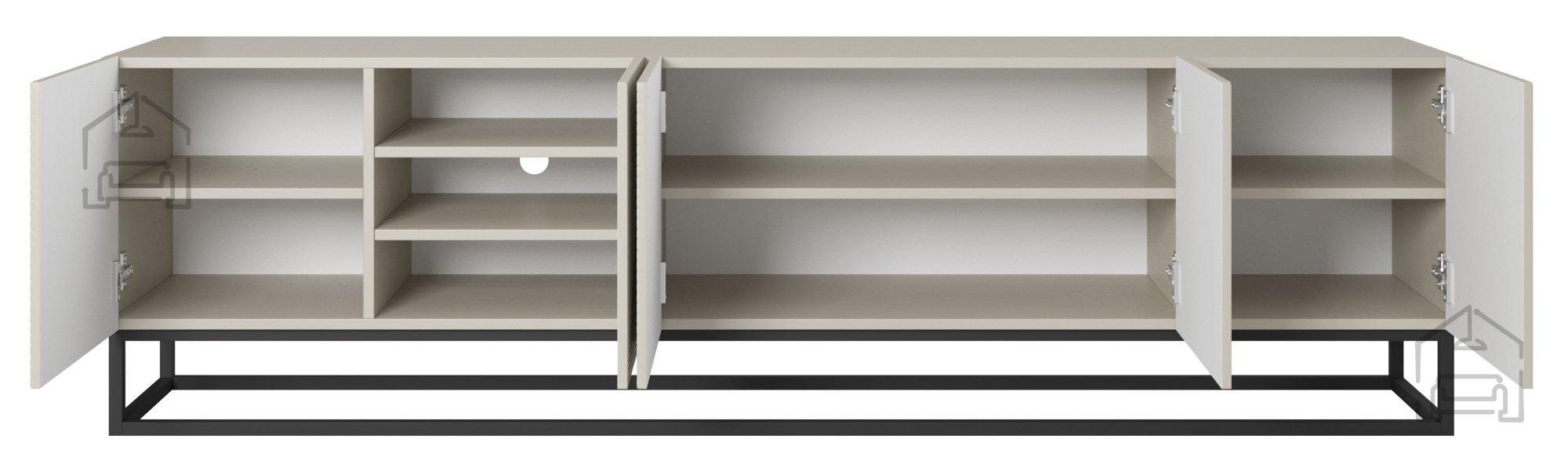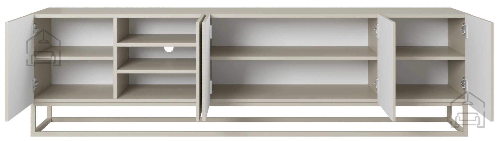 Die TV-Kommode wird von einem pulverbeschichteten Metallrahmen in Schwarz oder Kaschmir getragen, der nicht nur für besondere Stabilität sorgt, sondern ihr auch einen modernen Look verleiht. Der stabile Rahmen macht das Möbel langlebig und erleichtert zudem die Reinigung unter der Kommode – ein praktischer Vorteil für jedes Zuhause.