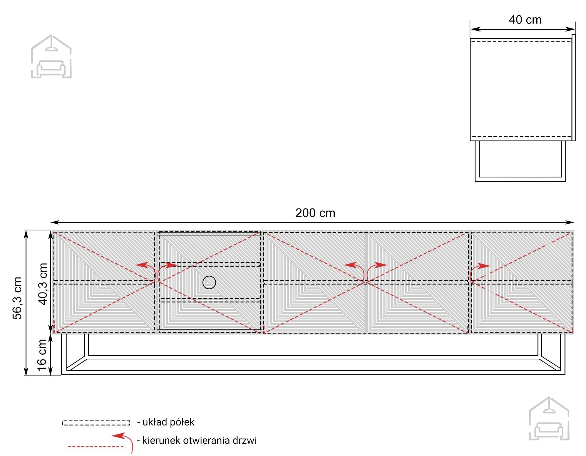 Die TV-Kommode Asha 200 5D wird aus hochwertigen Materialien gefertigt, die Langlebigkeit und Stabilität garantieren. Der Korpus besteht aus einer 16 mm starken laminierten Platte, die für Robustheit und Standfestigkeit sorgt. Die Fronten sind aus MDF gefertigt und mit PVC-Folie überzogen – das ergibt eine glatte, elegante Oberfläche. Alle Kanten sind mit ABS-Band geschützt, was die Widerstandsfähigkeit gegen Beschädigungen und Abnutzung erhöht.
