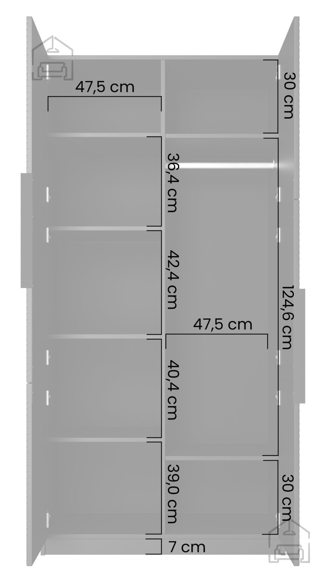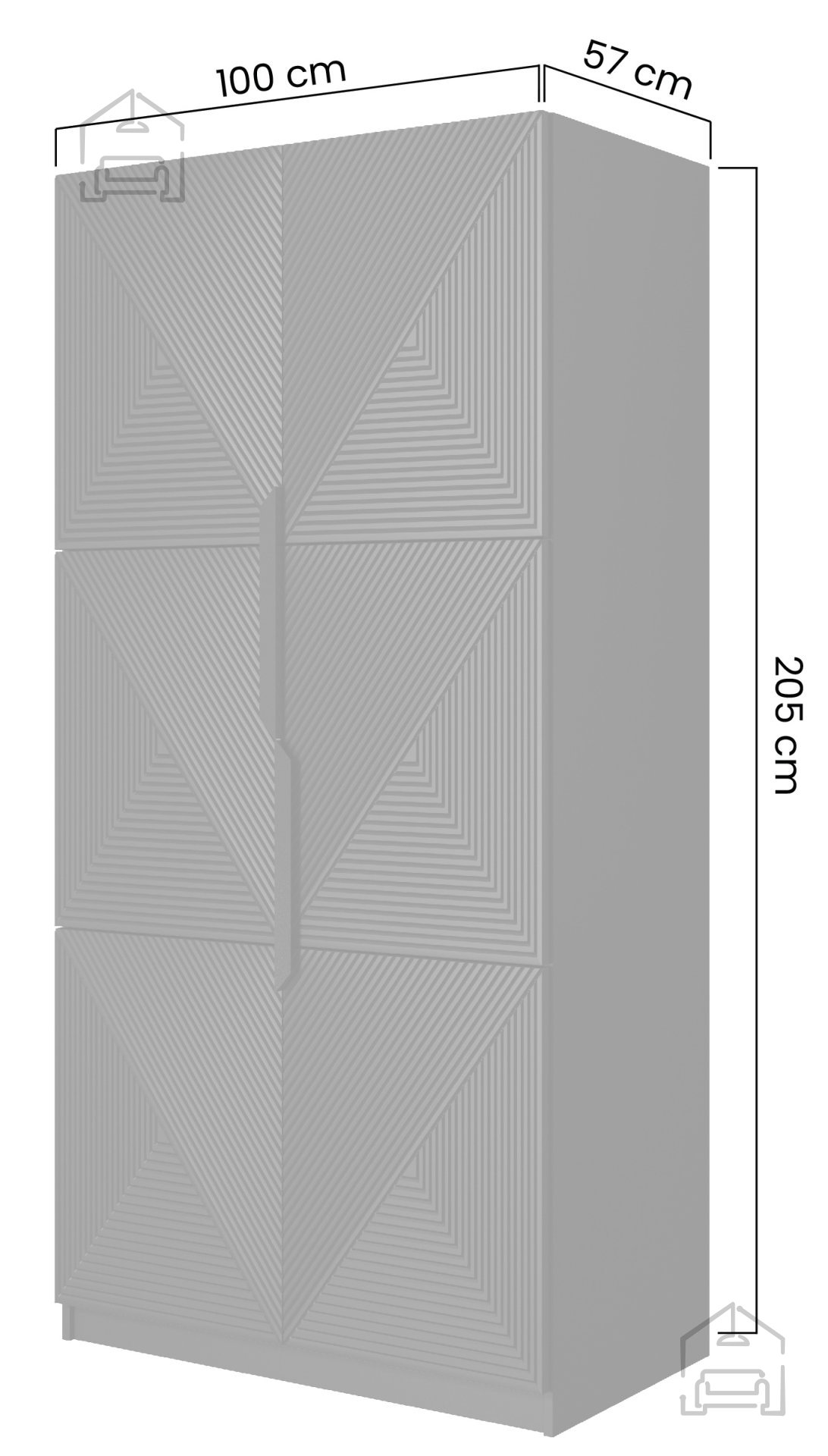 Mit den Abmessungen 100x57x205 cm bietet der Asha 100 2D reichlich Platz für Kleidung und Accessoires, ohne zu viel Raum einzunehmen. Das durchdachte Innenleben ermöglicht eine einfache Organisation mit genügend Platz für Kleiderstangen, Regale und Schubladen.