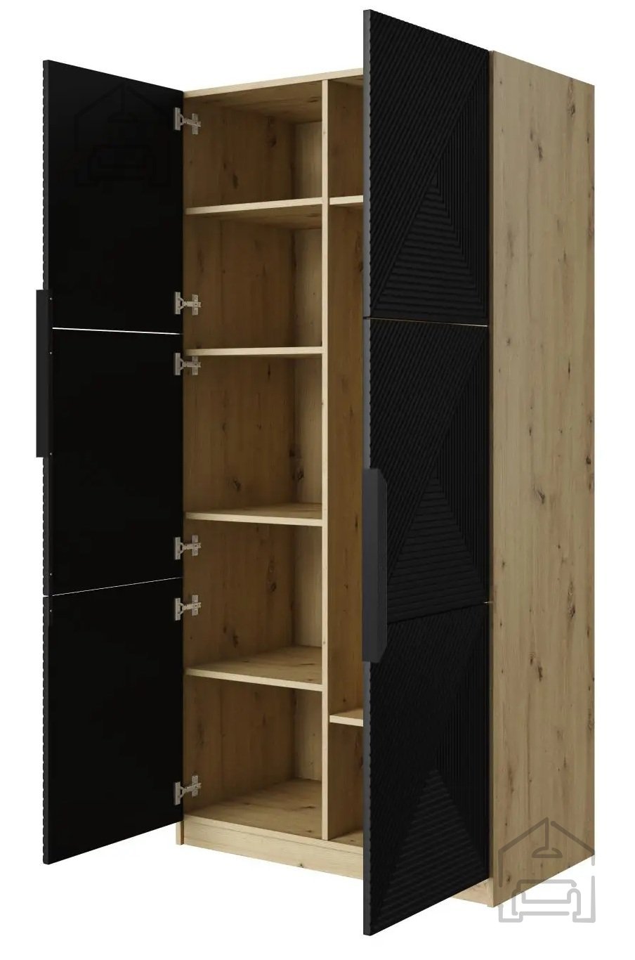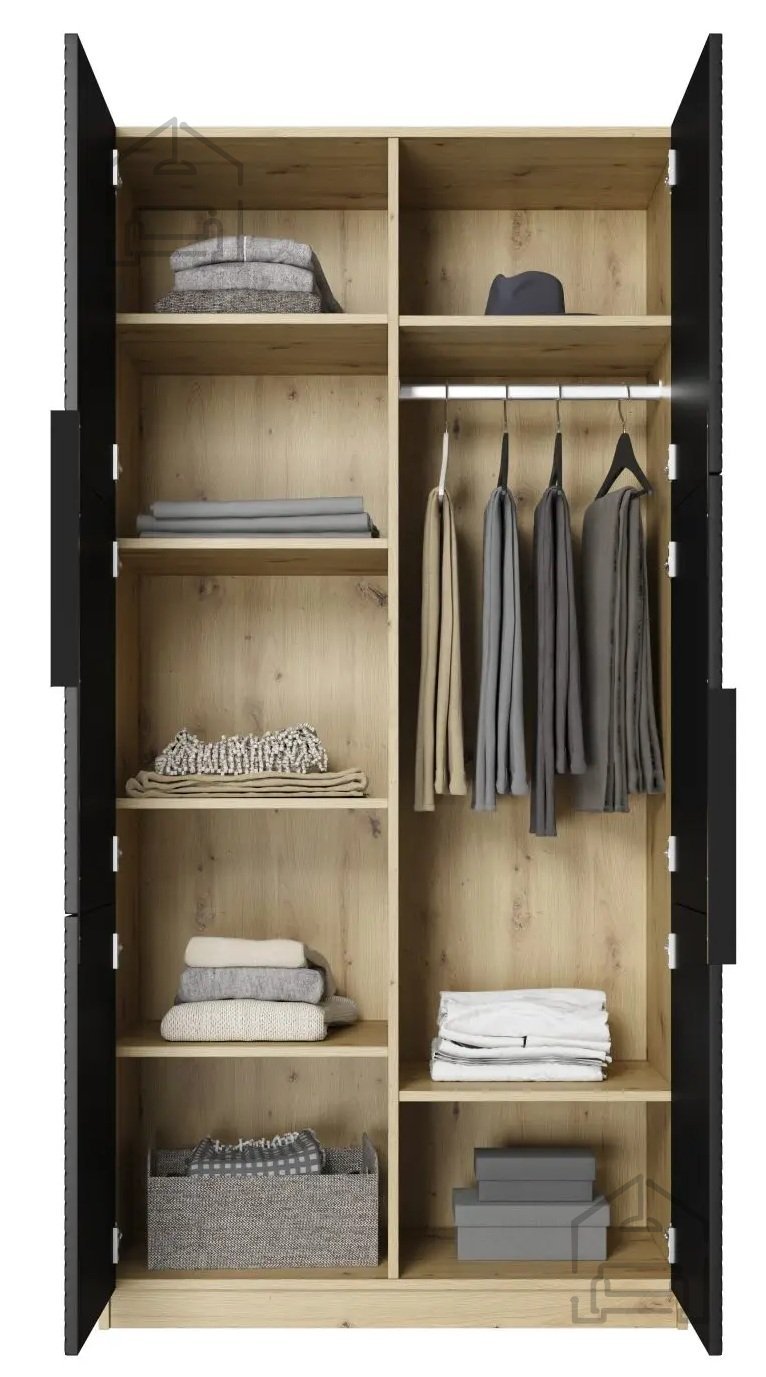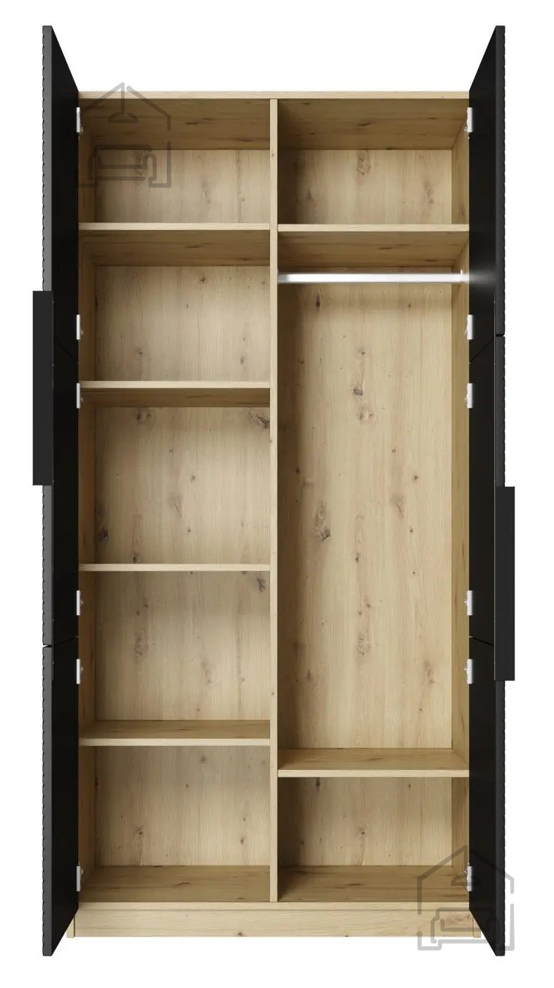 Die Kombination aus Schwarz und Artisan-Eiche verleiht dem Schrank ein modernes, elegantes Aussehen, das in jeden Raum passt. Der Kleiderschrank ist nicht nur praktisch, sondern bereichert optisch Ihr Schlafzimmer oder Ihren Vorraum.
