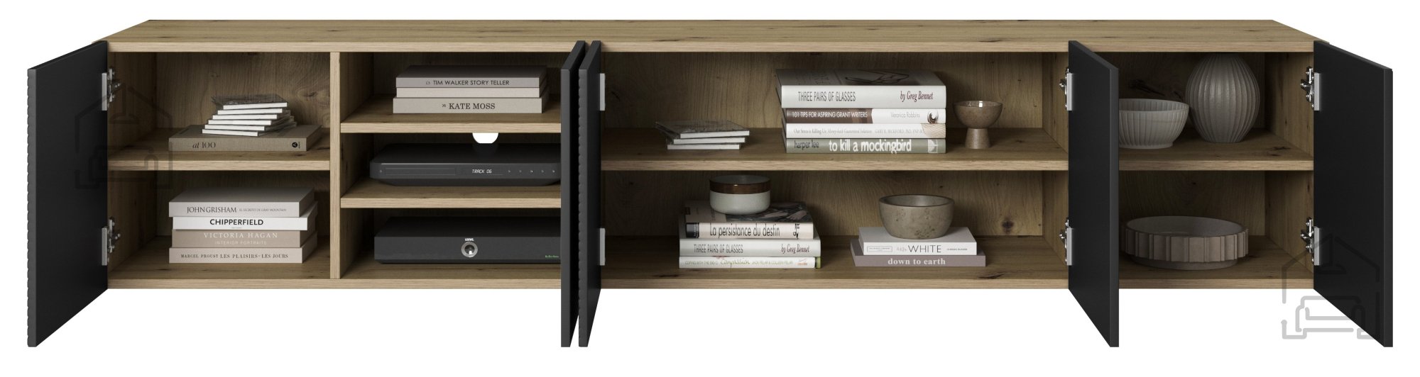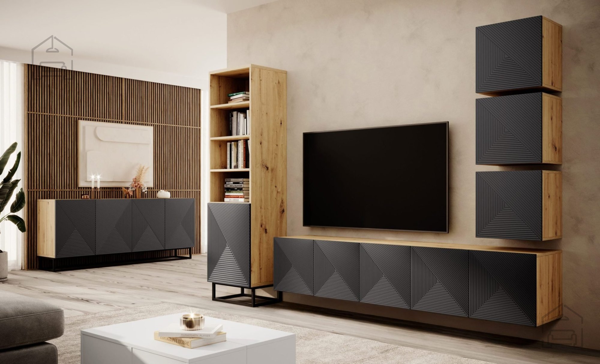 Wir präsentieren Ihnen die Wand-TV-Kommode Asha 200 5D in einer stilvollen Kombination aus Schwarz und Artisan-Eiche – ein Möbelstück, das Ihrem Wohnzimmer einen modernen Touch verleiht. Mit ihrem klaren, minimalistischen Design und der hochwertigen Verarbeitung ist diese Kommode die ideale Wahl für alle, die Eleganz und Funktionalität in einem suchen.
