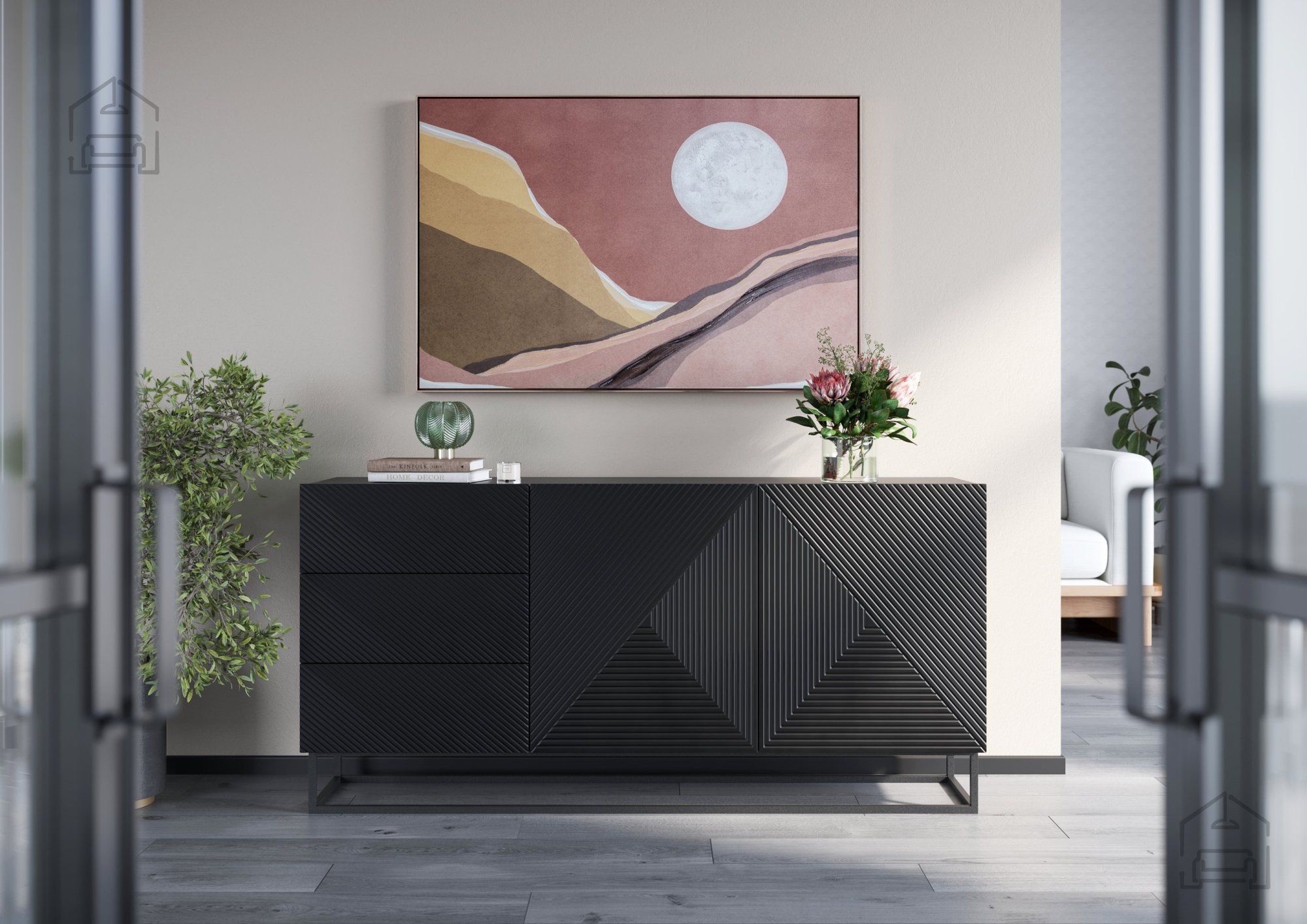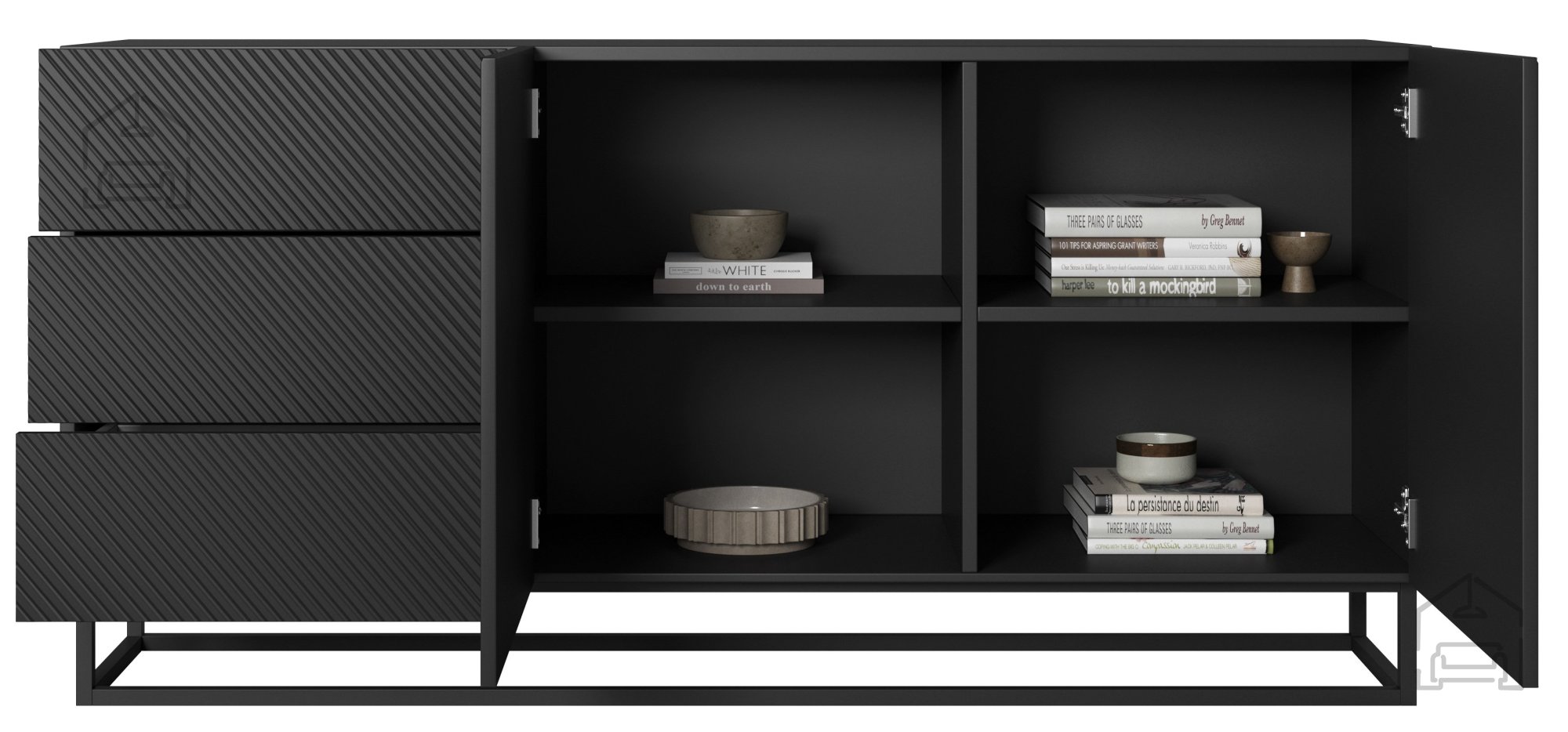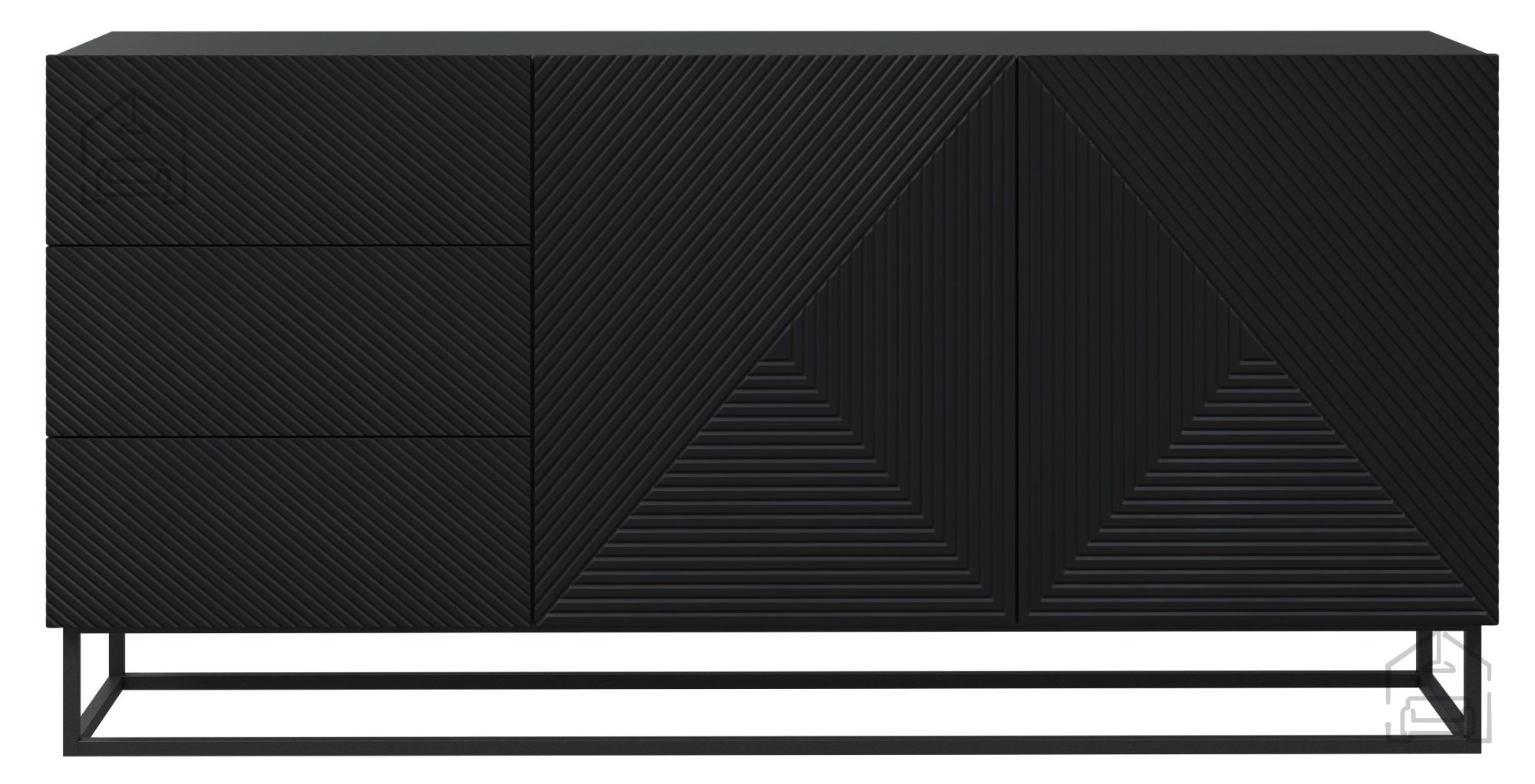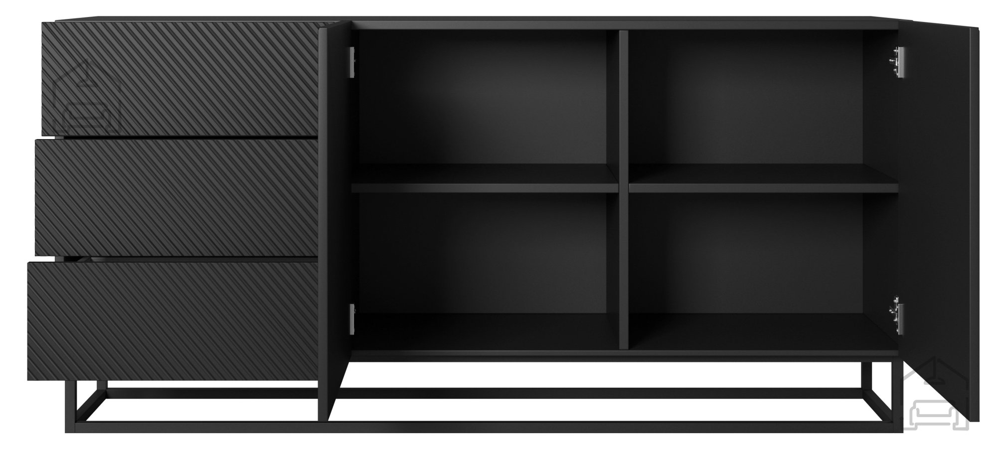 Wir präsentieren Ihnen die Kommode mit Metallrahmen Asha 167 2D3SZ in edlem Schwarz – eine gelungene Verbindung aus modernem Design und praktischer Alltagstauglichkeit. Dieses Möbelstück ist die ideale Wahl für alle, die ihrem Zuhause einen Hauch von Raffinesse verleihen möchten, ohne dabei auf Funktionalität zu verzichten.