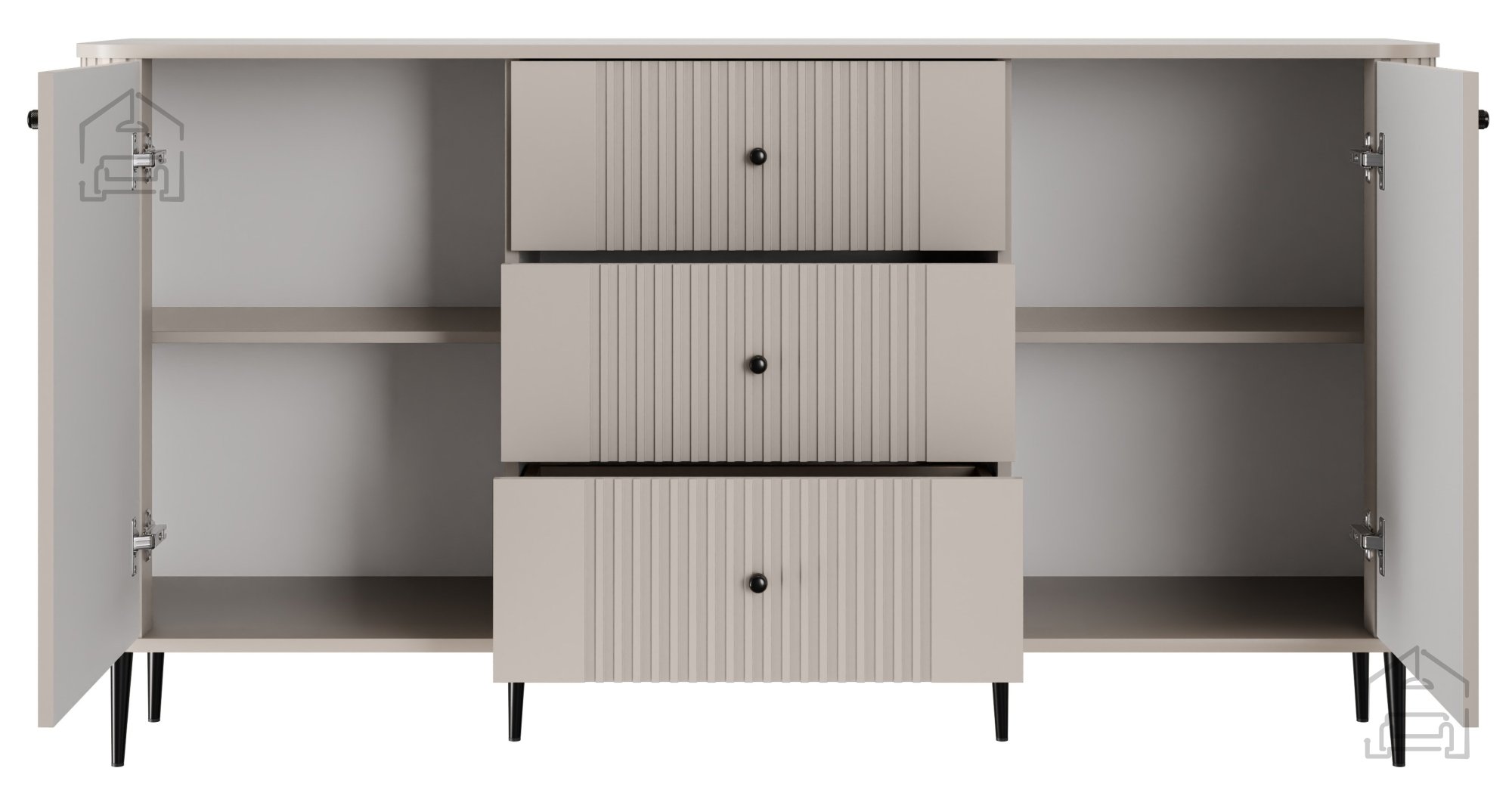 Wir präsentieren Ihnen die Kommode Vesper in der edlen Farbe Kaschmir, die Ihrem Zuhause einen Hauch von Stil und Raffinesse verleiht. Diese wunderschöne Kommode ist nicht nur ein optisches Highlight, sondern auch eine praktische Lösung für mehr Ordnung im Wohnraum. Mit den Maßen 160x38x85 cm passt sie ideal in größere wie auch kleinere Räume und bietet zugleich großzügigen Stauraum für Ihre persönlichen Dinge.