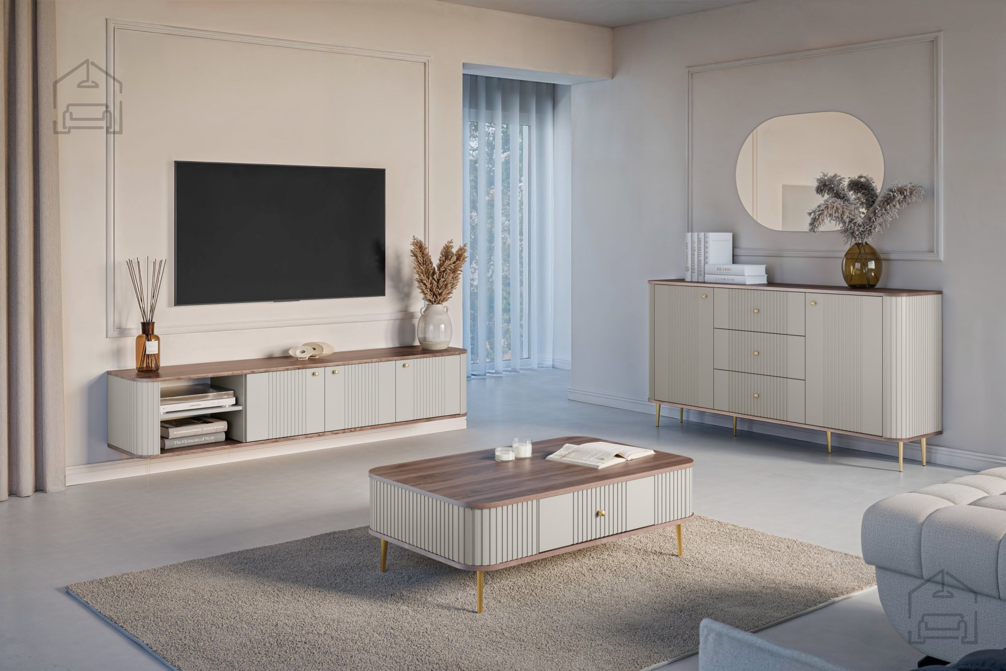 Die Kombination aus Kaschmir und Nussbaum sorgt für ein warmes, luxuriöses Ambiente, während die runden goldfarbenen Griffe einen Hauch von Eleganz hinzufügen. Diese neutrale, aber edle Farbpalette lässt sich mühelos mit verschiedenen Einrichtungsstilen – von modern bis klassisch – kombinieren.