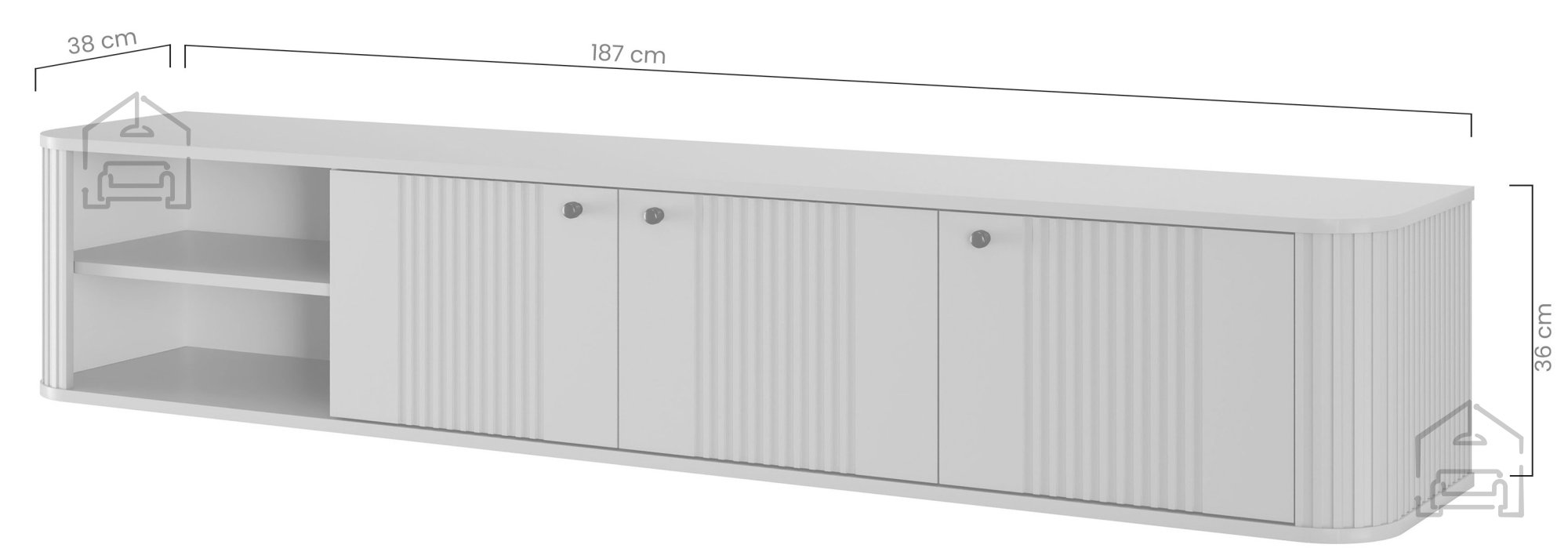 Mit den Maßen 187x38x36 cm bietet die Kommode ausreichend Platz für Ihre Multimedia-Geräte, Bücher oder Dekorationen. Sie passt sich unterschiedlichen Räumen bestens an und ermöglicht eine aufgeräumte Gestaltung ohne Abstriche beim Stil.
