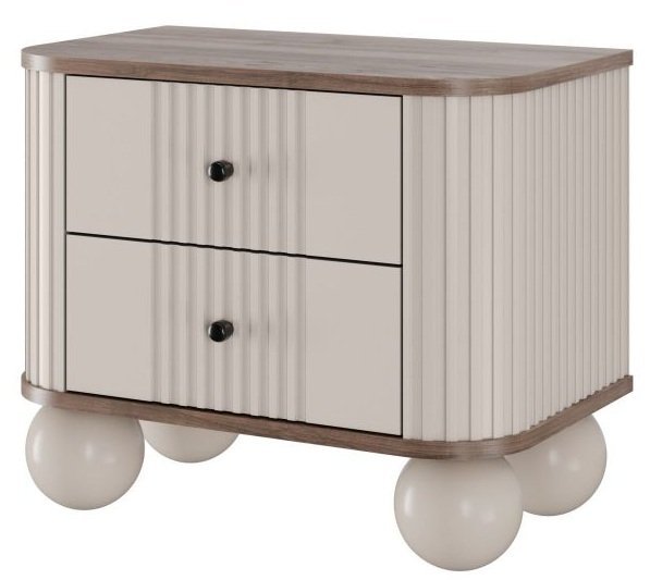 Die Vesper-Nachtkästchen vereinen Funktionalität und ansprechendes Design. Runde Holzbeine in Kaschmirfarbe, 12 cm hoch, sorgen für Stabilität und erleichtern das Reinigen des Bodens darunter. Schwarze runde Griffe setzen einen modernen Akzent und ermöglichen ein bequemes Öffnen der Laden.