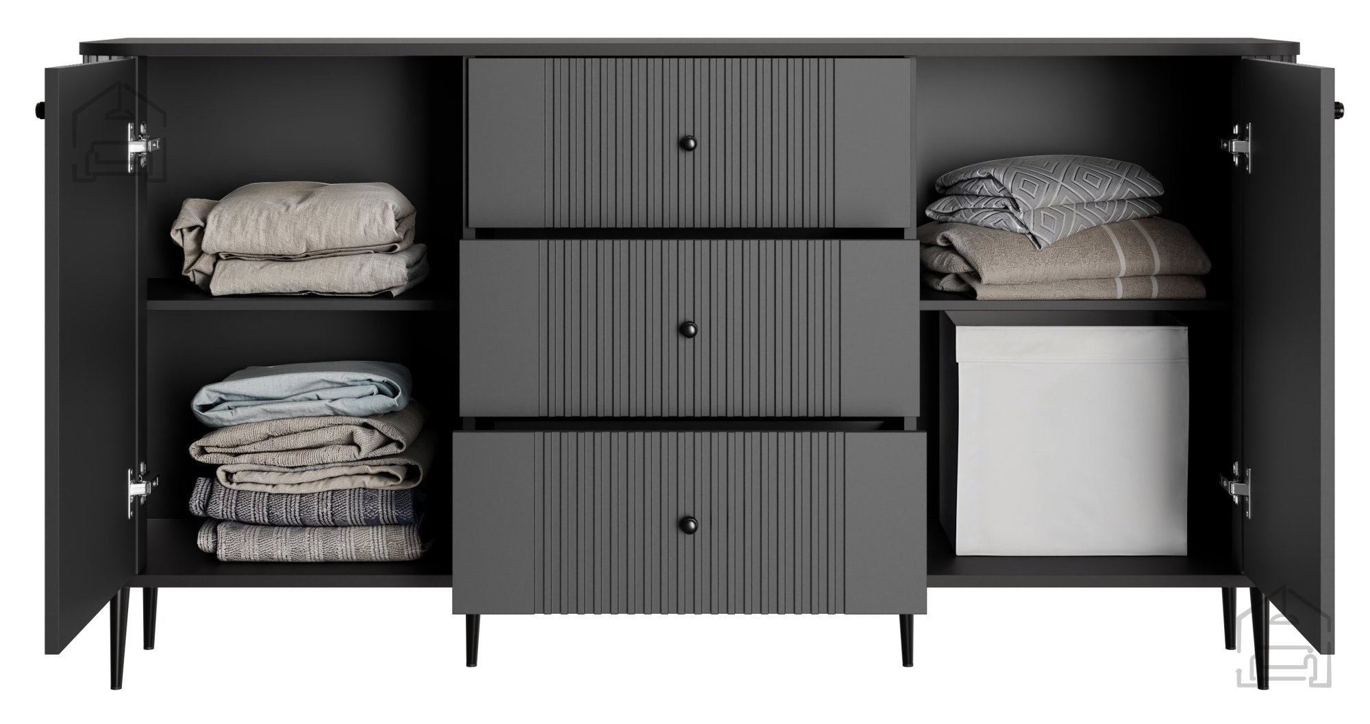 Das 2D3SZ-Design umfasst zwei großzügige Fächer mit Türen und drei Schubladen, die für Ordnung und Übersicht sorgen. Egal ob Kleidung, Bücher oder Elektronik – alles findet seinen Platz und bleibt griffbereit.