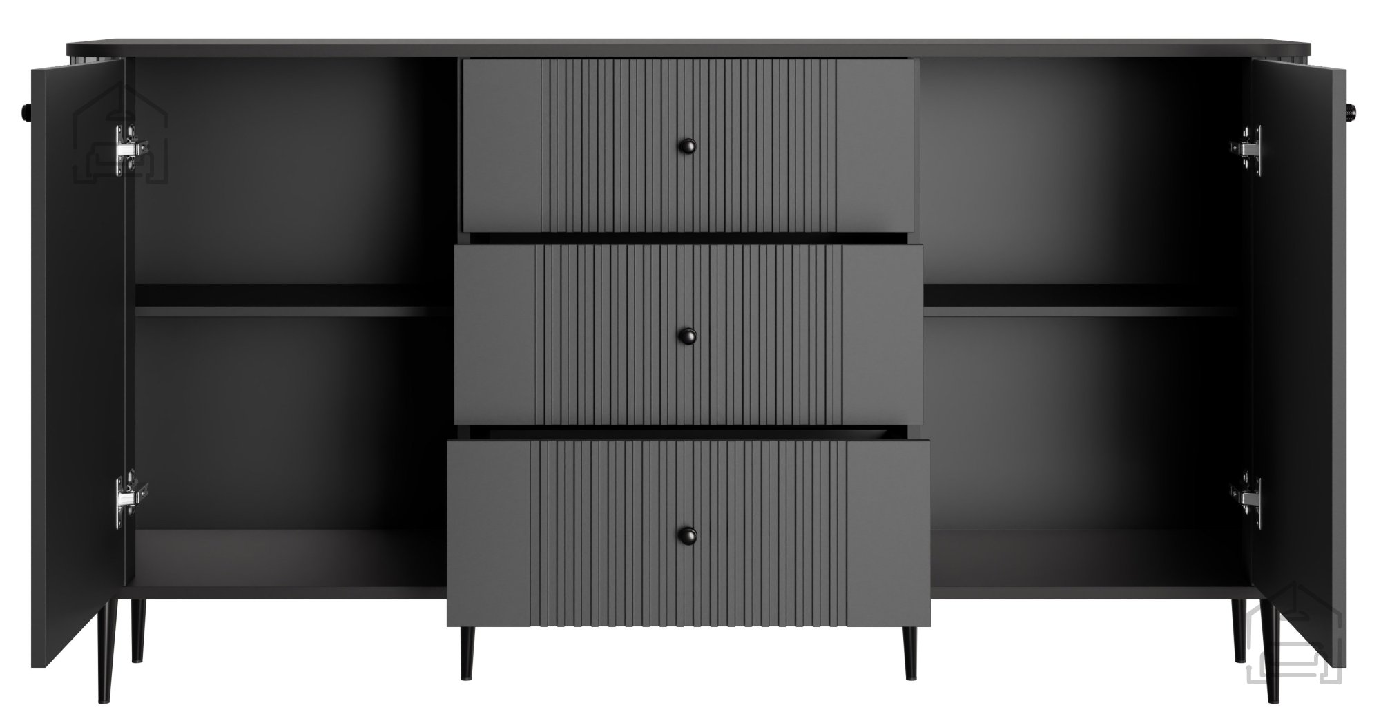 Wenn Sie Möbel suchen, die modernes Design, hochwertige Materialien und praktische Nutzung vereinen, ist die Kommode Vesper 160 2D3SZ die perfekte Wahl. Dieses edle schwarze Möbelstück auf schwarzen Metallbeinen erfüllt nicht nur, sondern übertrifft die Erwartungen selbst anspruchsvoller Kundinnen und Kunden.