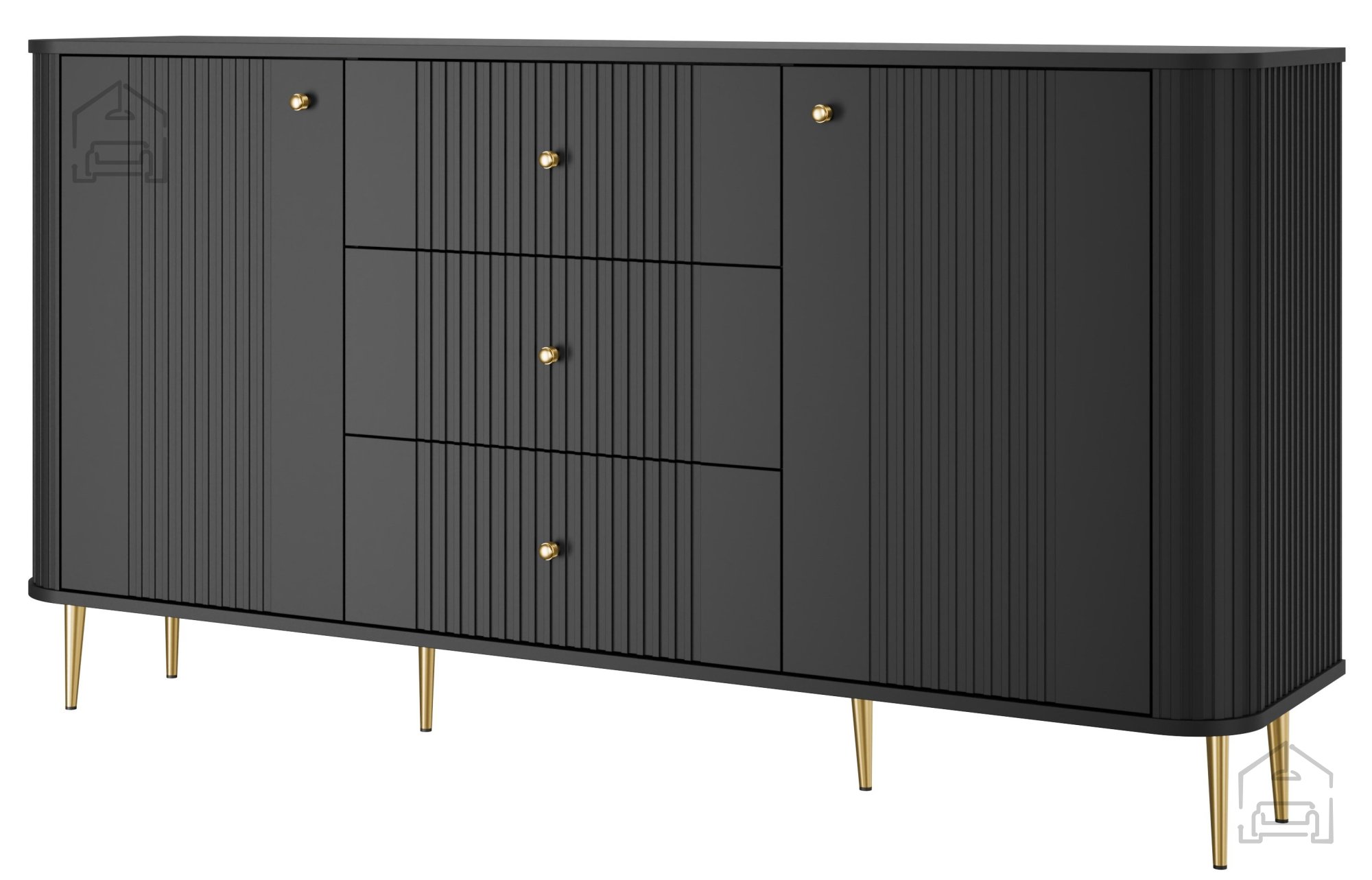Das matte Schwarz sorgt für einen zeitlosen Look, während die goldfarbenen Metallfüße mit einer Höhe von 15 cm einen Hauch von Luxus verleihen. Runde goldene Griffe runden das Design harmonisch ab und schaffen ein stimmiges Gesamtbild.