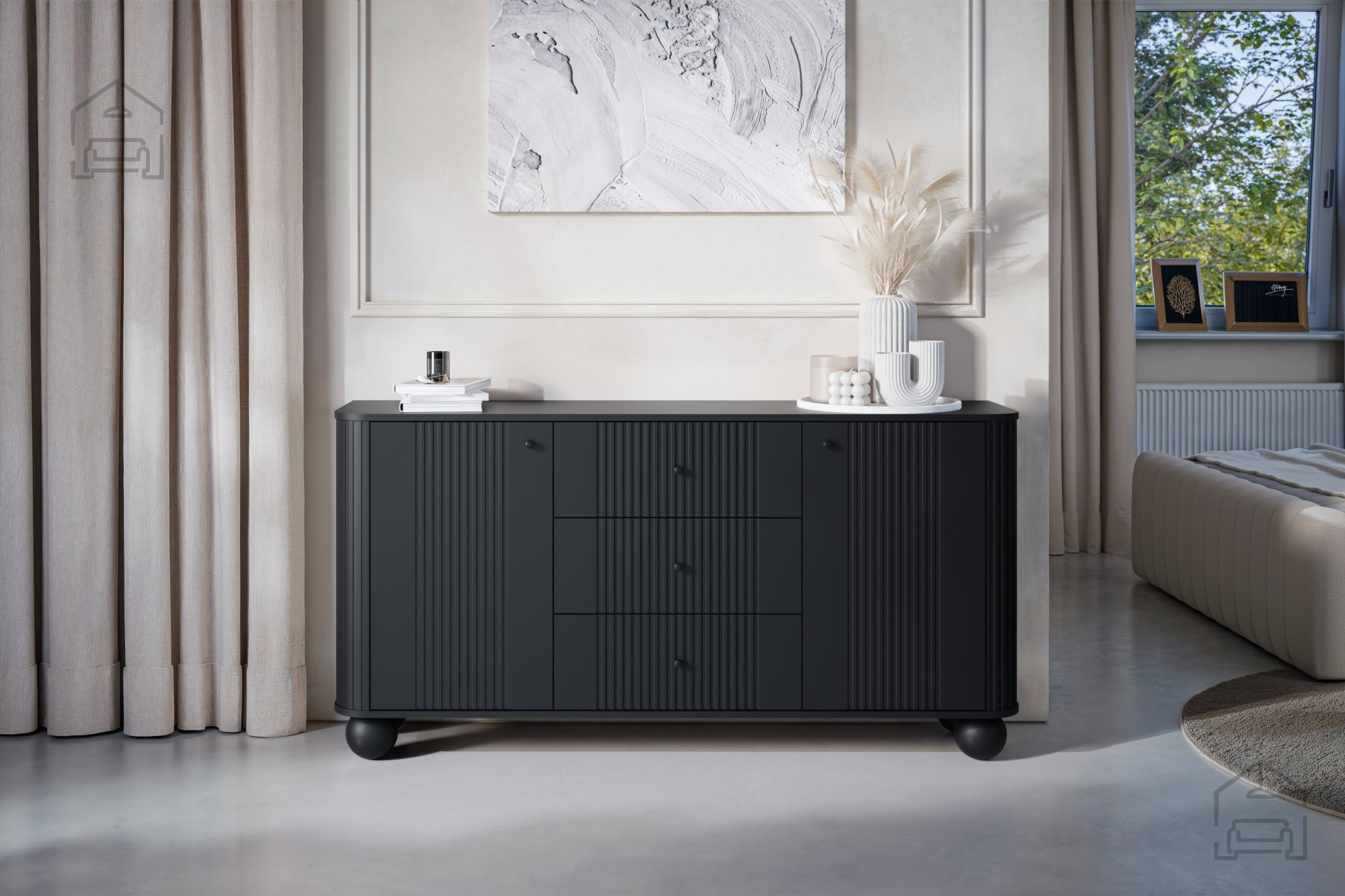 Die Kommode Vesper 160 2D3SZ ist das perfekte Möbelstück für jedes moderne Zuhause. Sie vereint minimalistisches Design mit praktischer Funktionalität. Diese schwarze Kommode mit runden Beinen und stilvollen schwarzen Griffen bringt einen Hauch von Eleganz und Modernität in Ihren Wohnraum.