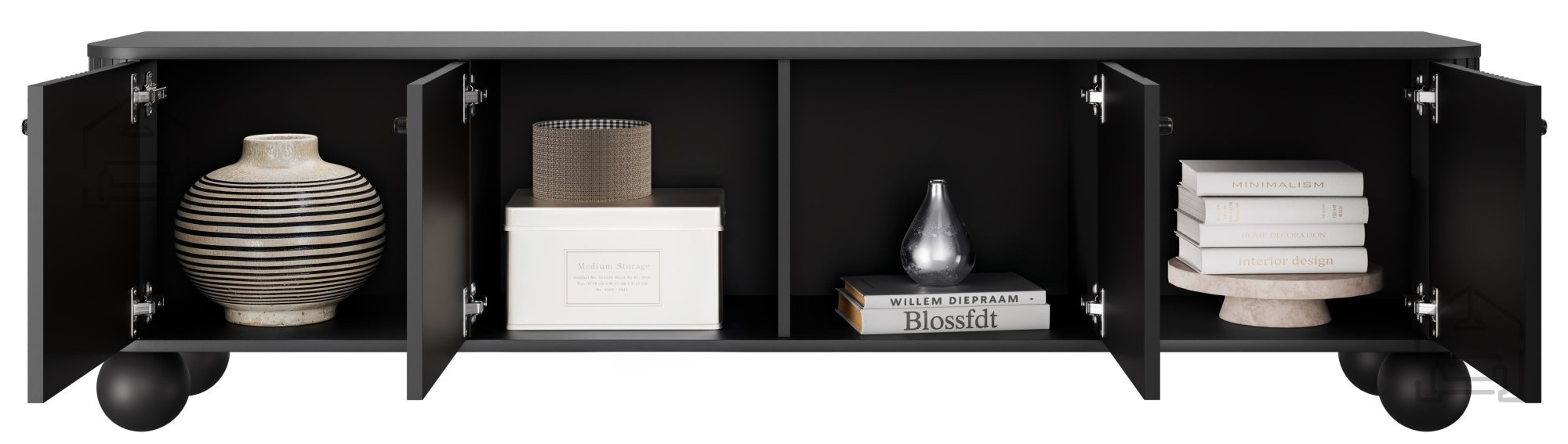 Größe und Stauraum: Vier Türen bieten ausreichend Platz für Geräte, Zubehör und Kabel – alles bleibt ordentlich verstaut und unsichtbar.
