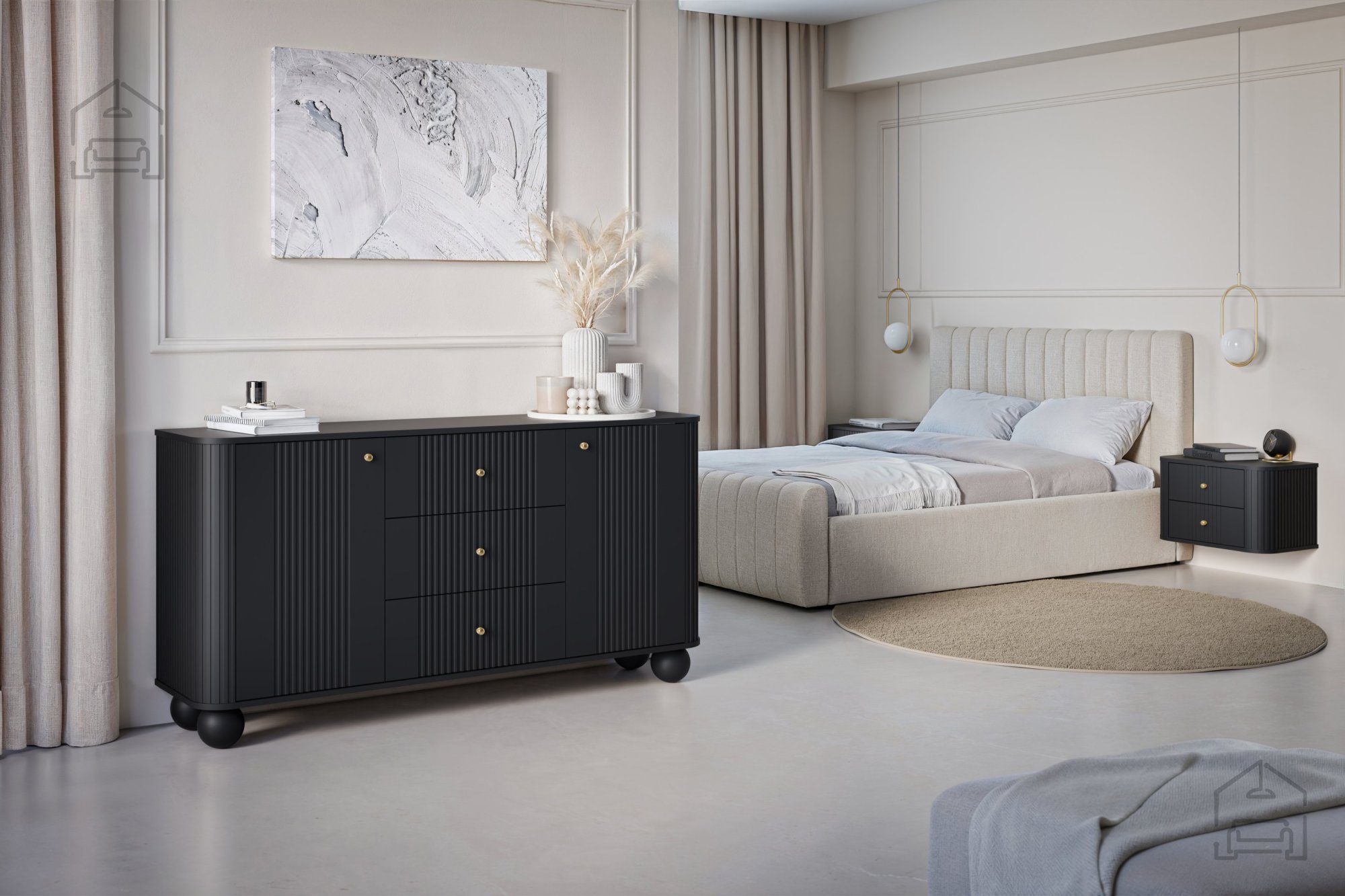 Verleihen Sie Ihrem Zuhause mit der eleganten und modernen Möbelkollektion Vesper einen neuen Look. Diese stilvolle Serie für Wohn- und Schlafzimmer vereint Raffinesse mit Funktionalität und ist perfekt für alle, die modernes Design mit einem Hauch von Luxus schätzen. Mit ihrem tiefschwarzen Farbton, abgerundeten Holzbeinen und goldfarbenen Griffen bringt Vesper eine edle Note in jedes Zuhause.