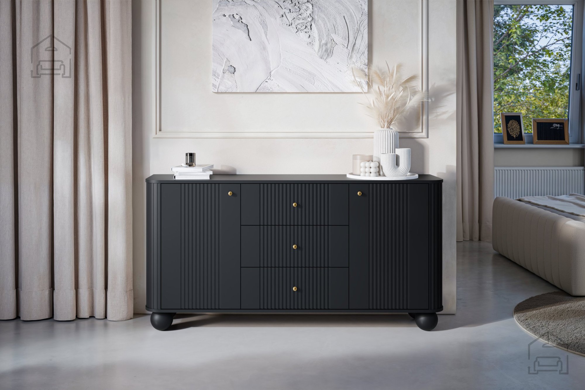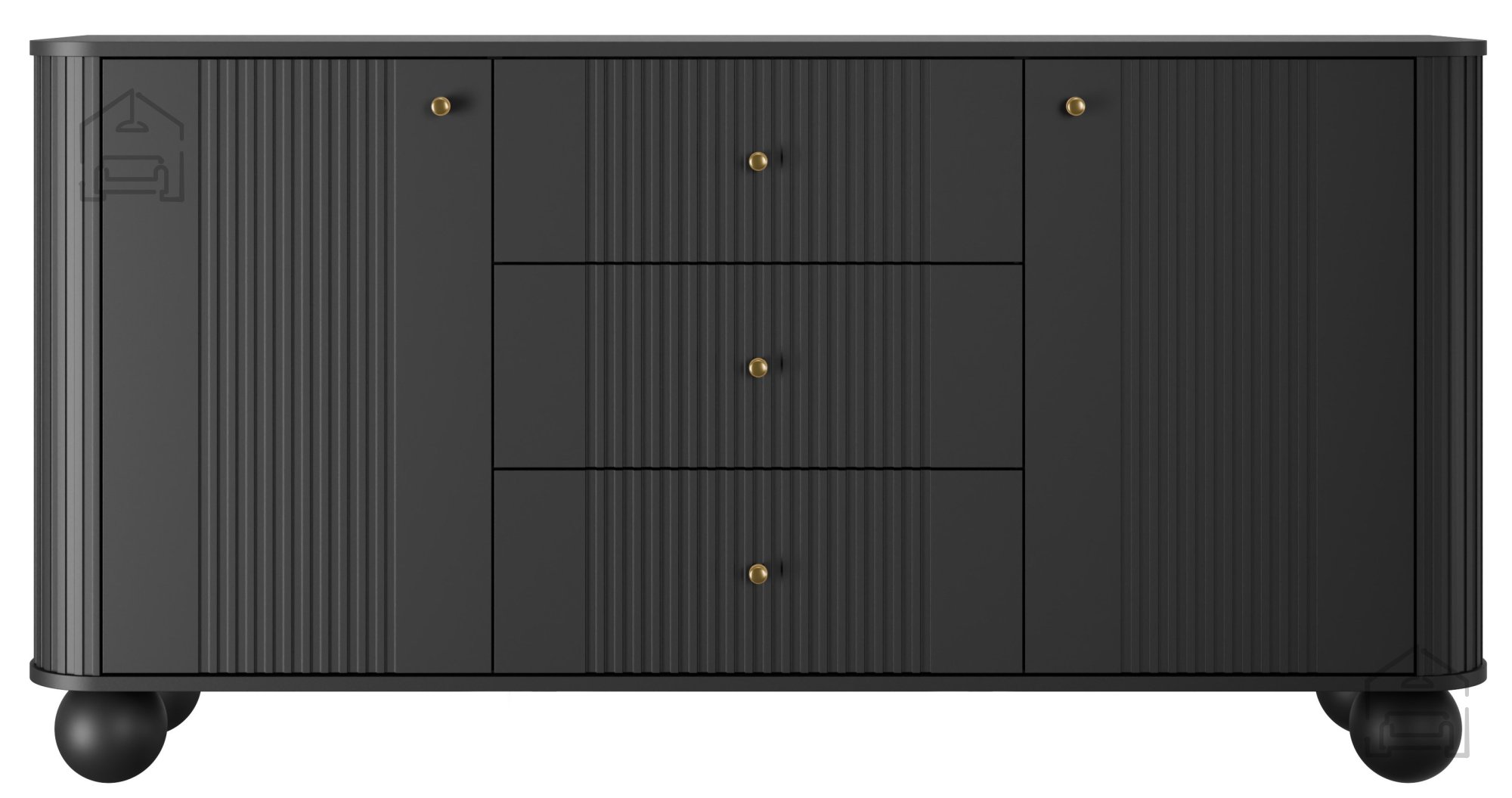 Wenn es darum geht, ein stilvolles und modernes Zuhause zu gestalten, ist die Kommode Vesper 160 2D3SZ die ideale Wahl für alle, die Wert auf hochwertiges Design und Qualität legen. Mit ihrem eindrucksvollen Schwarz und den goldfarbenen Akzenten bringt sie einen Hauch von Luxus in jeden Raum. Sie vereint Ästhetik und Funktionalität und passt perfekt ins Wohnzimmer oder Schlafzimmer.