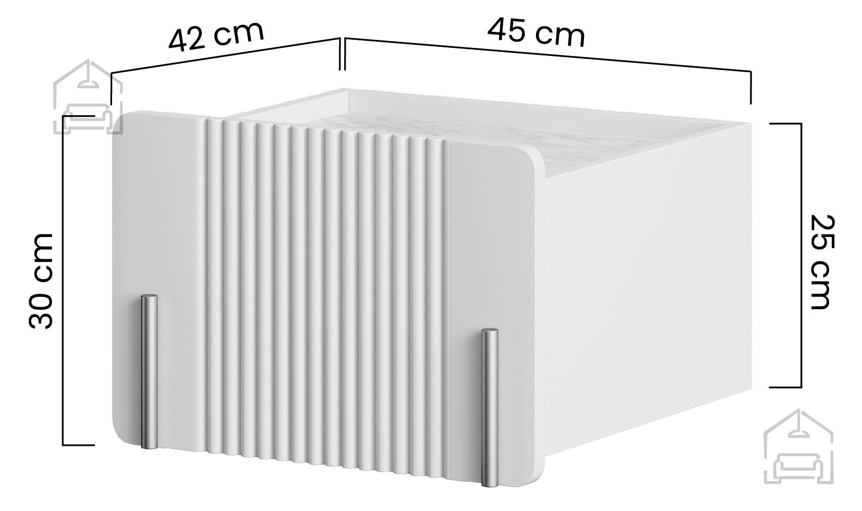 Mit den Maßen 45x42x30 cm bietet das Kästchen ausreichend Platz für Bücher, Brillen, persönliche Gegenstände oder eine Nachttischlampe – und nimmt dabei kaum Raum ein.