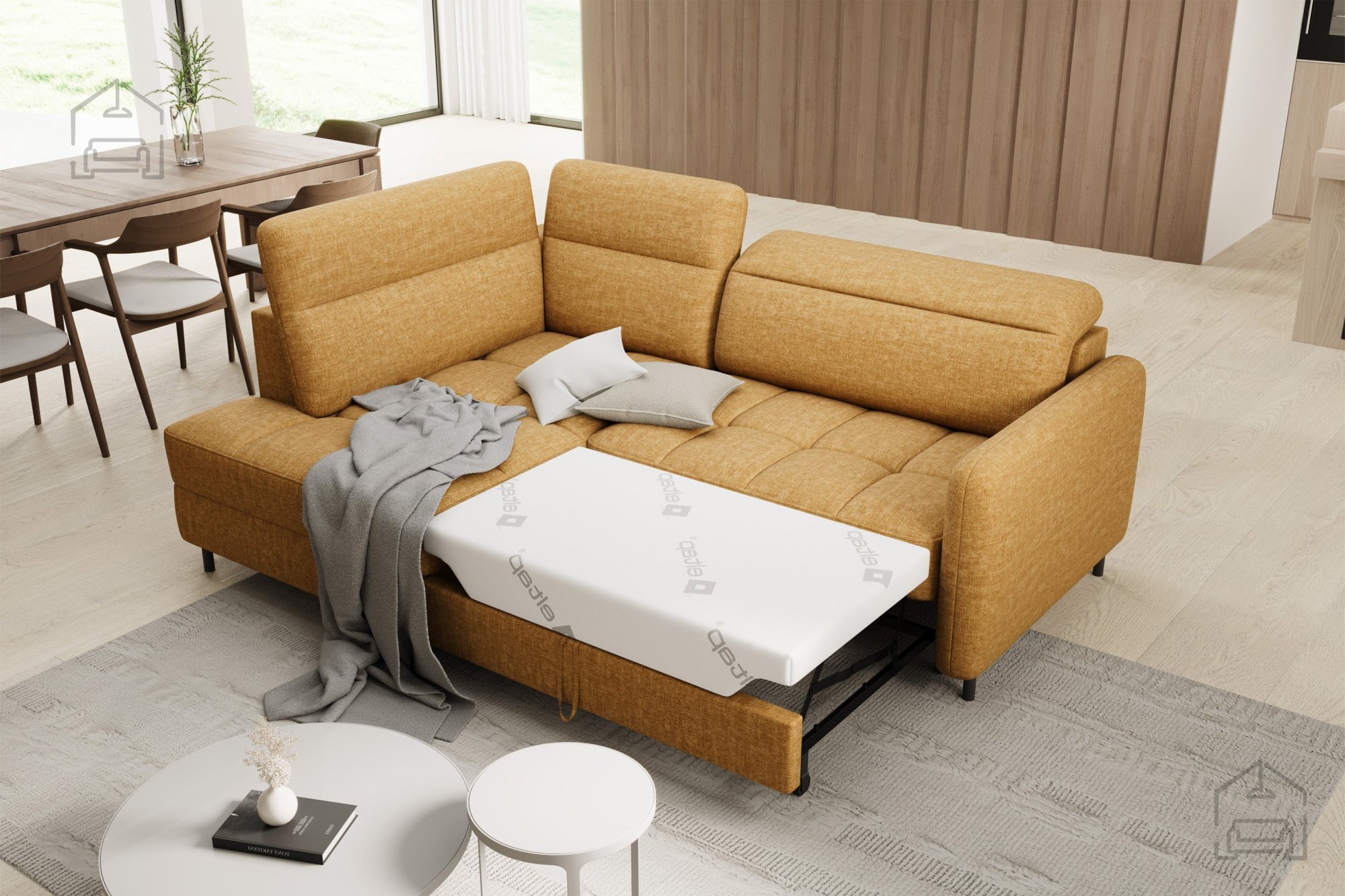 Flexibilität und Funktionalität: Der Dolphin-Mechanismus ermöglicht eine einfache Umwandlung des Sofas in ein bequemes Bett mit den Maßen 160x128 cm, was ideal für Gäste oder Familienmitglieder ist, die übernachten. Darüber hinaus verfügt das Sofa über eine Bettkasten, die zusätzlichen Stauraum bietet, was entscheidend für die Aufrechterhaltung eines aufgeräumten Raums ist.