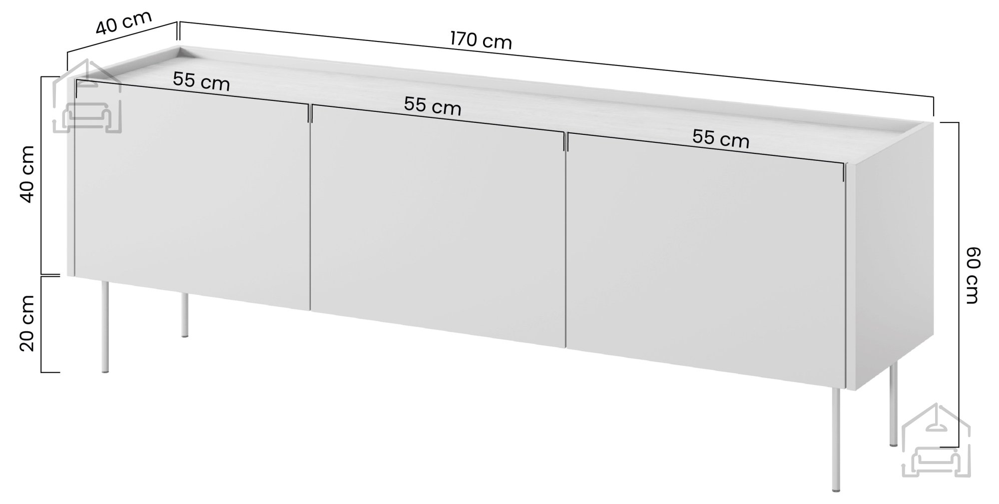 Mit den Maßen 170x40x60 cm eignet sich diese Kommode ideal für größere Fernseher und bietet gleichzeitig ausreichend Platz für Geräte und Zubehör. Die Rückwand aus 3 mm starker HDF-Platte ist so gestaltet, dass sie eine gute Belüftung sowie einen einfachen Zugang zu den Kabeln ermöglicht. Die 20 cm hohen Metallfüße sorgen für Stabilität und erleichtern das Saubermachen unter dem Möbel – besonders praktisch im Alltag.