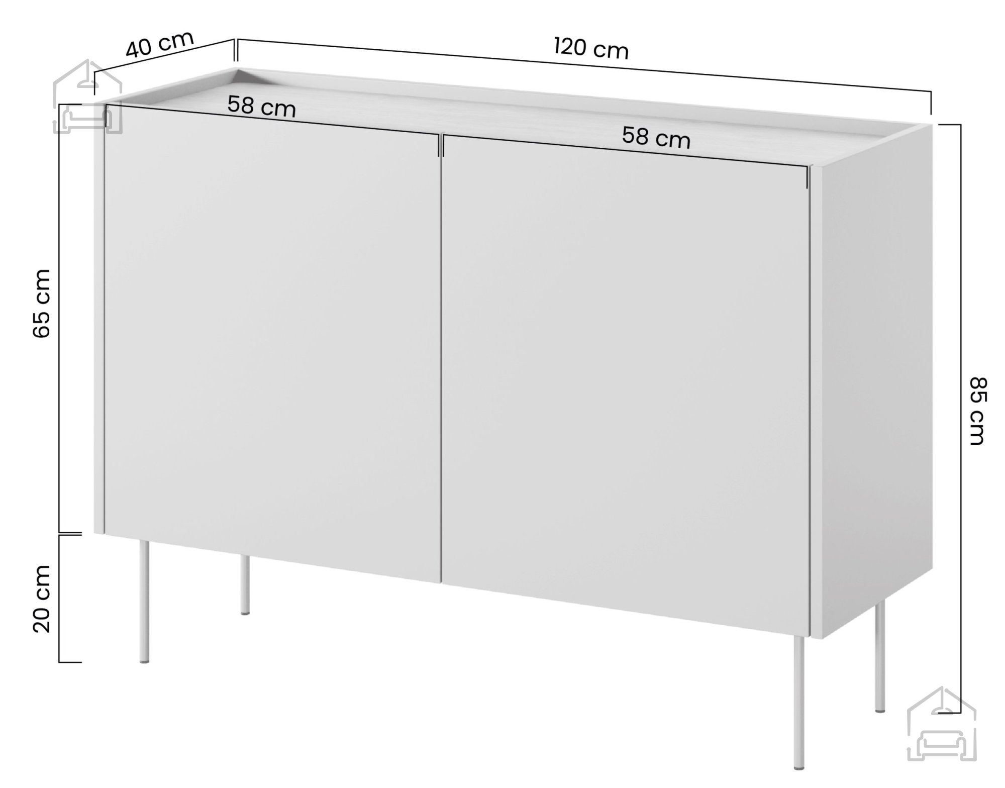 Das elegante Design wird durch 20 cm hohe Metallfüße ergänzt, die einen modernen Touch setzen und das Reinigen unter der Kommode erleichtern. Das Soft-Close-System ermöglicht ein leises und angenehmes Schließen der Türen – besonders geschätzt in ruhigen, entspannten Wohnbereichen.