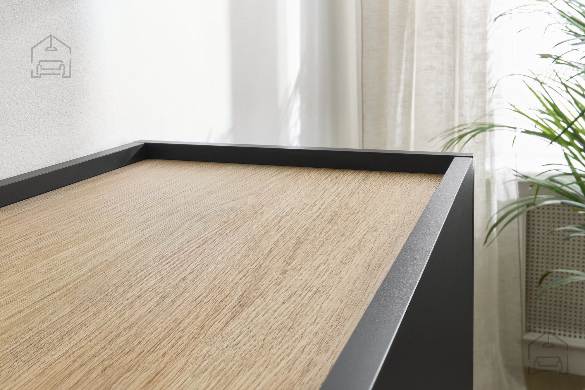 Die schwarze Farbe verleiht der Kommode einen Hauch von Raffinesse und lässt sich wunderbar mit unterschiedlichen Farbkonzepten kombinieren. Metallfüße mit einer Höhe von 20 cm sorgen nicht nur für ein modernes Erscheinungsbild, sondern erleichtern auch die Reinigung unter dem Möbelstück. Das Soft-Close-System ermöglicht ein leises und sanftes Schließen – ideal für Familienhaushalte oder Arbeitsräume.