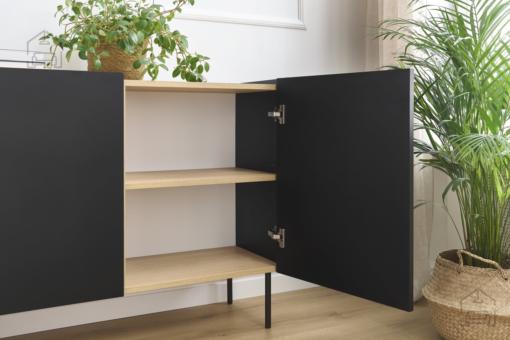 Die Grundkonstruktion der Kommode besteht aus einer 18 mm starken Möbelplatte, die Stabilität und Langlebigkeit garantiert. Die Kanten sind mit einem ABS-Band versehen, das zusätzlichen Schutz vor Beschädigungen bietet und der Kommode ein gepflegtes Erscheinungsbild verleiht. Die obere Platte in Nagano-Eichenoptik sorgt für eine warme, natürliche Note, die wunderbar mit dem eleganten Schwarz der restlichen Kommode harmoniert.