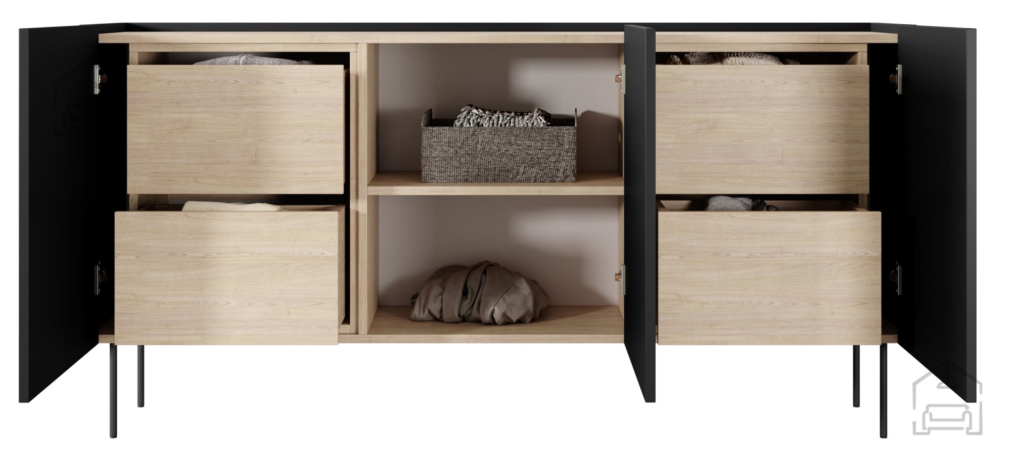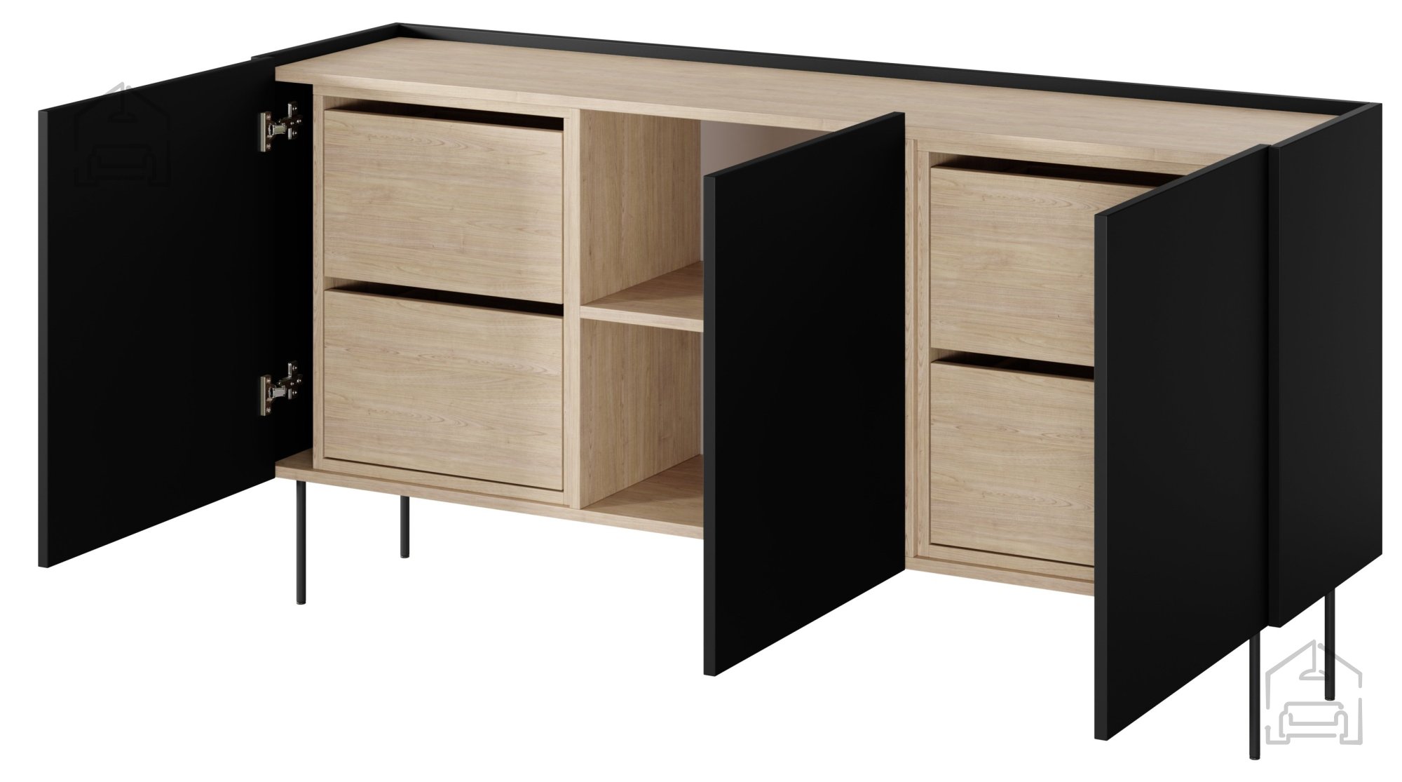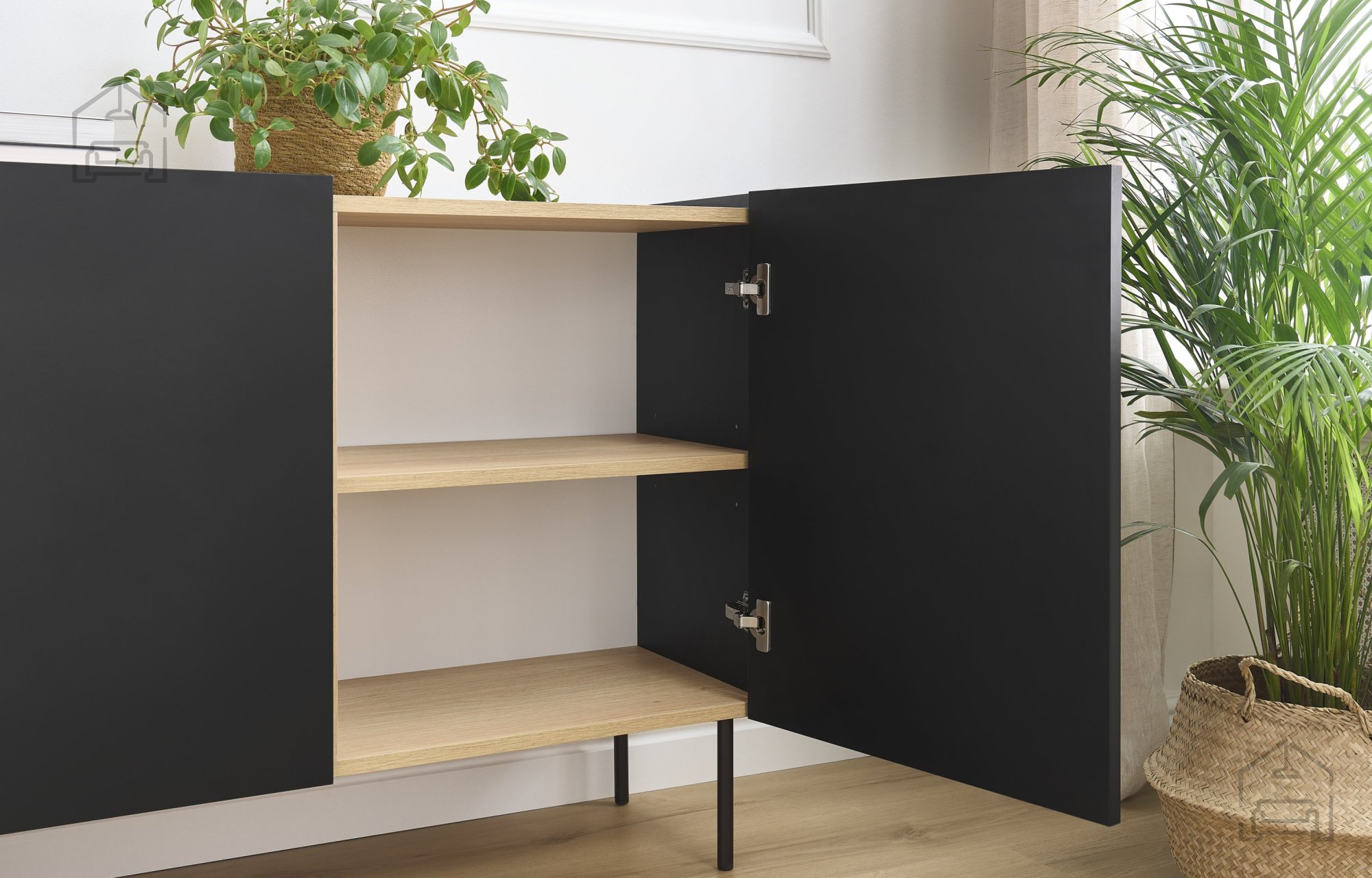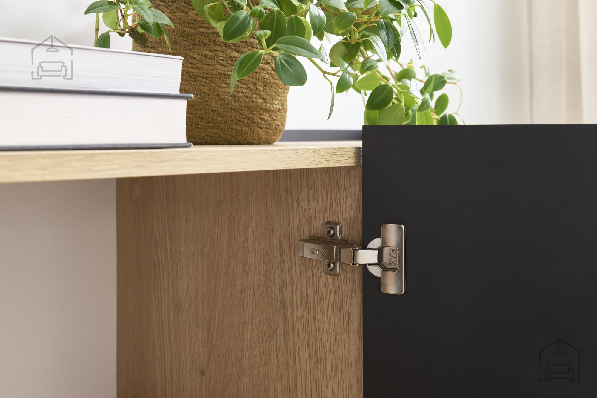 Die Kommode Desin 170 3D4SZ besteht aus einer hochwertigen Möbelplatte mit 18 mm Stärke, die für Stabilität und Langlebigkeit sorgt. Die obere Platte in Nagano-Eiche verleiht dem Möbelstück eine warme, natürliche Note, die wunderbar mit dem schwarzen Korpus harmoniert. Die Kanten sind mit ABS-Technologie verarbeitet, was sie besonders widerstandsfähig gegen Stöße und Abnutzung macht.