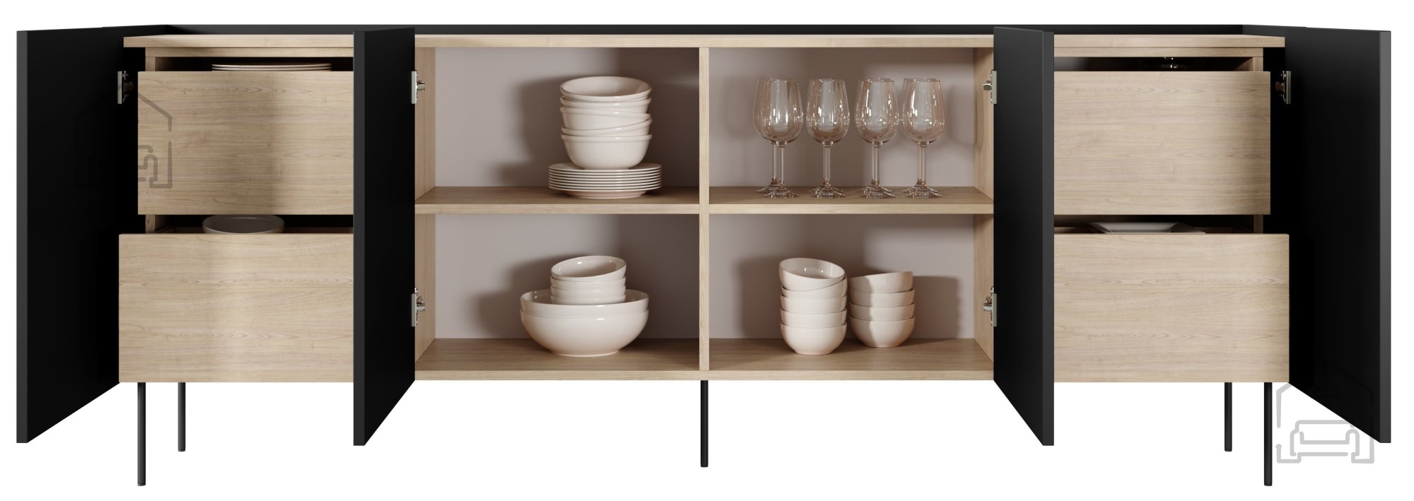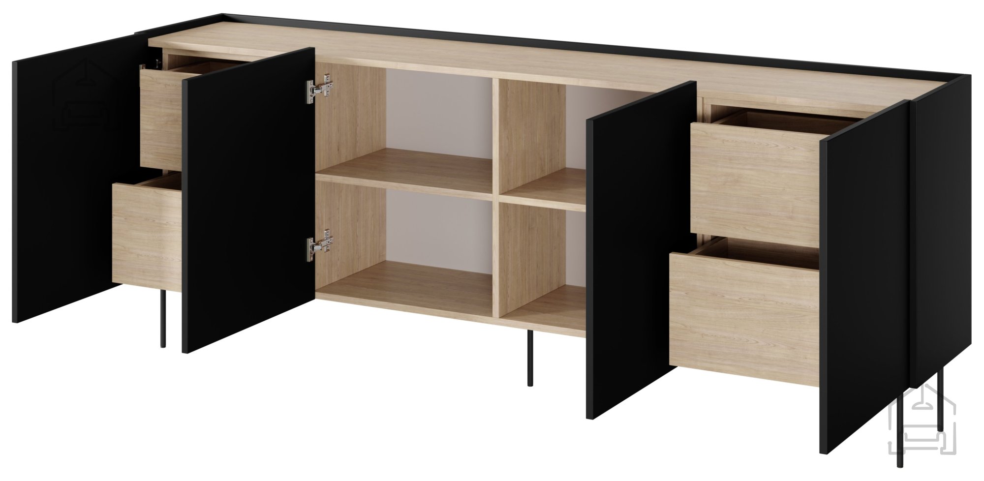 Wenn Sie Möbel suchen, die sowohl praktisch als auch optisch ansprechend sind, ist die Kommode Desin 220 4D4SZ eine hervorragende Wahl. Gefertigt aus hochwertiger Möbelplatte mit einer Stärke von 18 mm, steht sie für Stabilität und Langlebigkeit. Die Kombination aus schwarzer Oberfläche und Details in Eiche Nagano auf der Deckplatte macht sie zum stilvollen Mittelpunkt jedes Raumes.