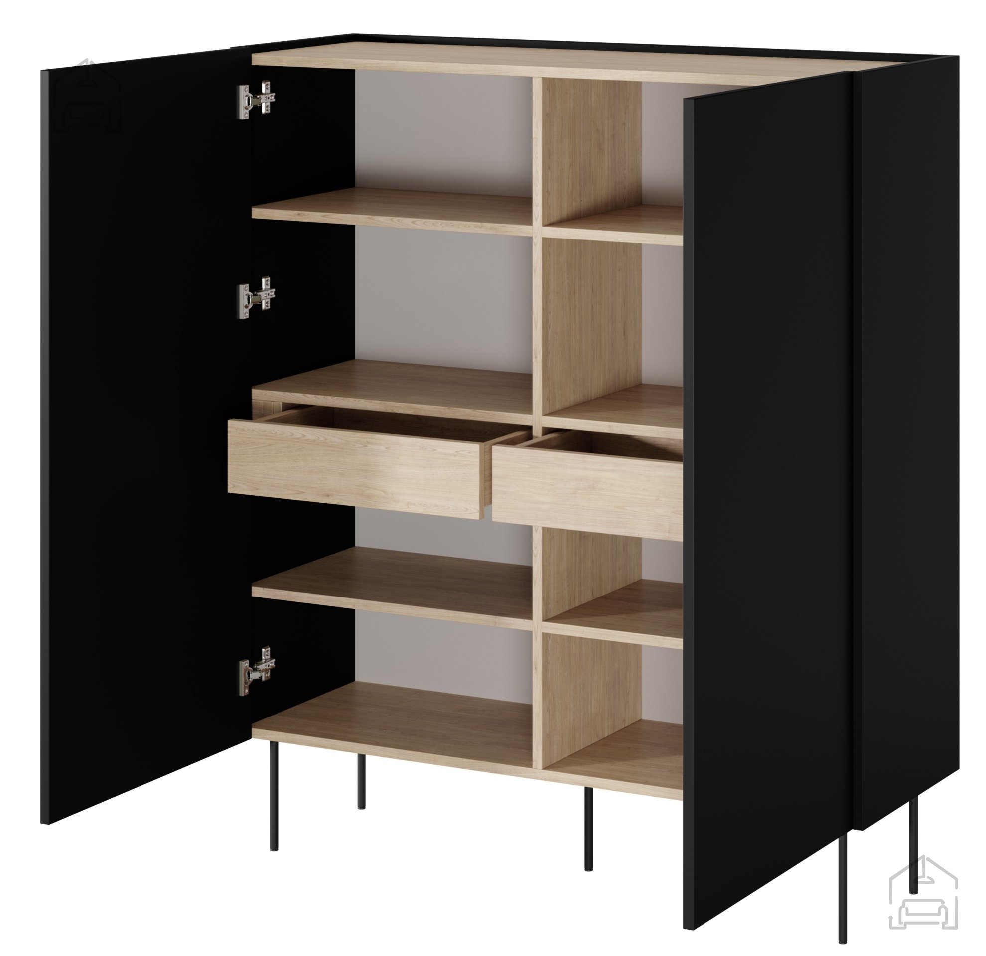 Gefertigt aus hochwertiger Möbelplatte mit einer Stärke von 18 mm überzeugt die Kommode durch Stabilität und Langlebigkeit. Die ebenfalls 18 mm starke Oberplatte ist mit edlem Eichenfurnier in Nagano-Optik veredelt und bringt eine natürliche, warme Note in Ihren Wohnraum. Die schwarze Oberfläche sorgt für zeitlose Eleganz und lässt sich mühelos mit verschiedensten Einrichtungsstilen kombinieren. Dank des Soft-Close-Systems schließen Schubladen und Türen sanft und leise – das schont die Mechanik und verlängert die Lebensdauer. Das grifflose Push-to-Open-System ermöglicht eine moderne, elegante Handhabung und unterstreicht den minimalistischen Charakter des Möbels.