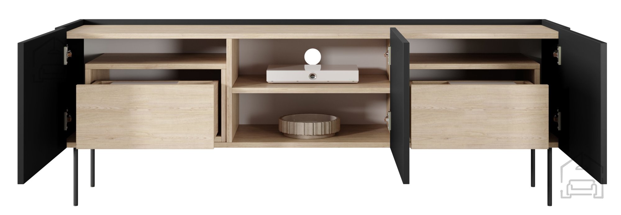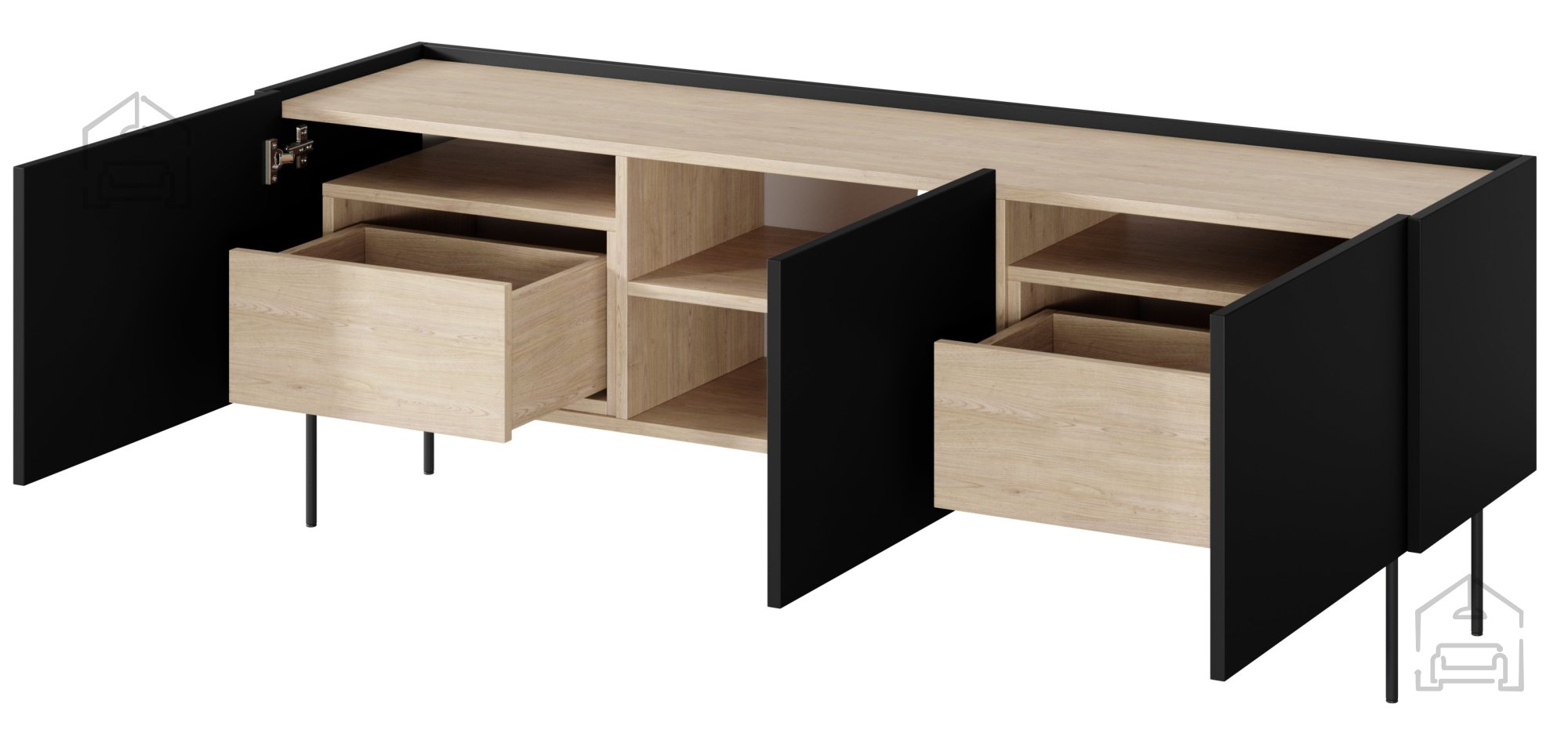 Eine der größten Stärken dieser TV-Kommode liegt in der sorgfältigen Materialwahl. Gefertigt aus einer 18 mm starken Möbelplatte, überzeugt sie durch Stabilität und Langlebigkeit. Die Kanten sind mit ABS-Band geschützt, was die Widerstandsfähigkeit gegen Abnutzung und Beschädigungen erhöht. Die obere Platte im Farbton Eiche Nagano bringt eine warme, natürliche Note ins Spiel, die wunderbar mit dem schwarzen Korpus harmoniert. Die 3 mm starke Rückwand aus HDF sorgt für zusätzliche Stabilität und ein sauberes Erscheinungsbild. Schwarze Metallfüße mit einer Höhe von 20 cm bieten nicht nur sicheren Stand, sondern verleihen dem Möbelstück auch eine leichte, moderne Optik – und erleichtern zugleich das Reinigen darunter.
