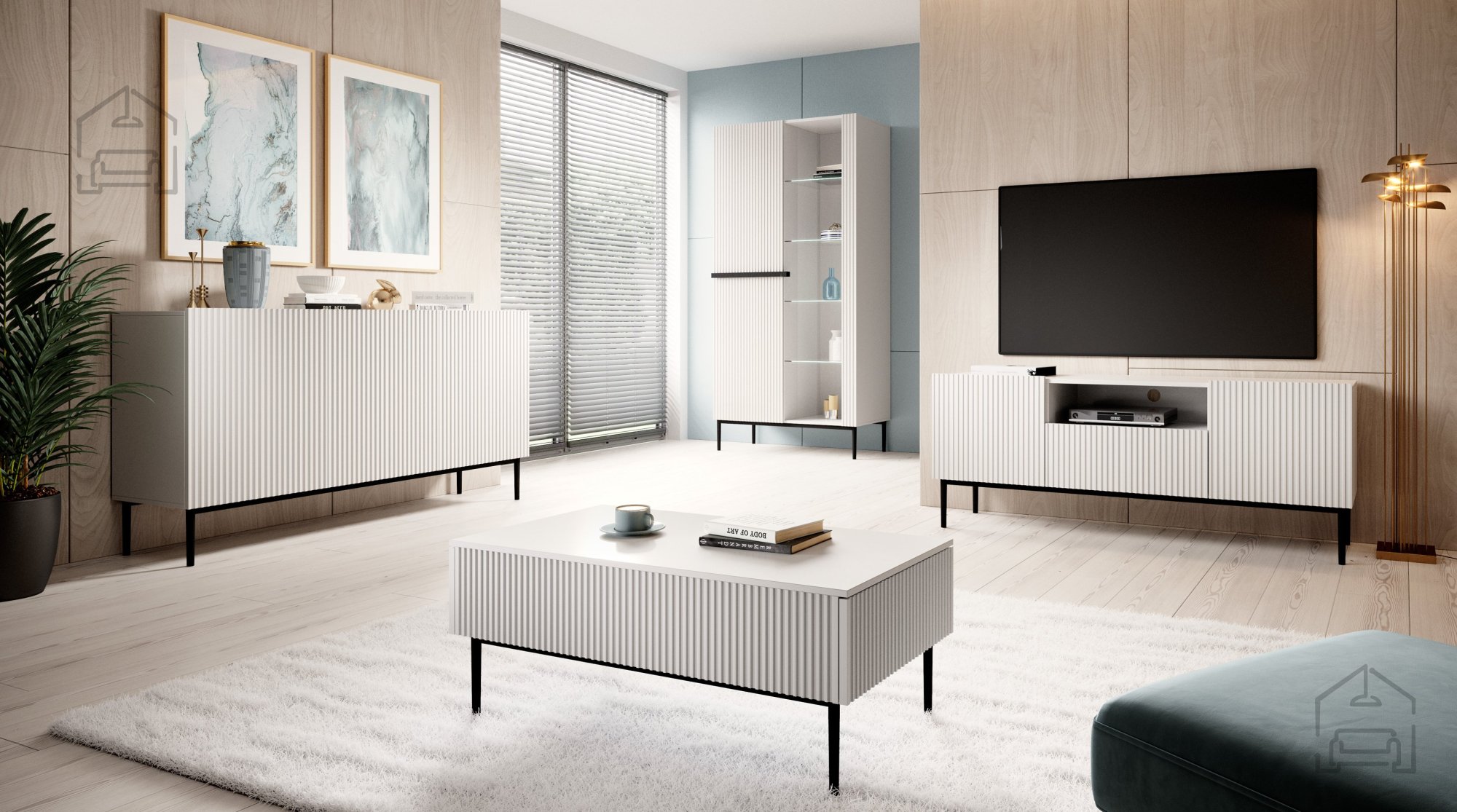 Die Rückwand aus HDF-Platte sorgt für Stabilität und strukturelle Festigkeit, während das markante, vertikal strukturierte Rillenmuster auf den Fronten einen besonderen optischen Akzent setzt, der dieses Möbelstück zu einem echten Blickfang macht.