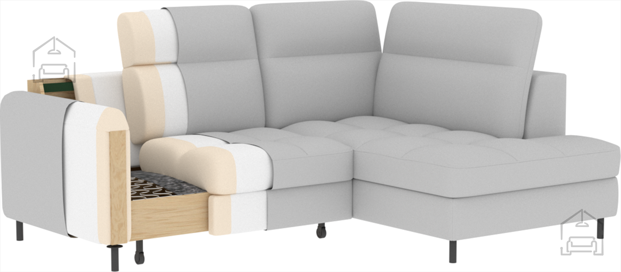 Flexibilität und Funktionalität: Der Dolphin-Mechanismus ermöglicht eine einfache Umwandlung des Sofas in ein bequemes Bett mit den Maßen 160x128 cm, ideal für Gäste oder Familienmitglieder, die über Nacht bleiben. Darüber hinaus verfügt das Sofa über eine Bettwäsche-Schublade, die zusätzlichen Stauraum bietet – entscheidend für die Aufrechterhaltung eines ordentlichen Raumes.