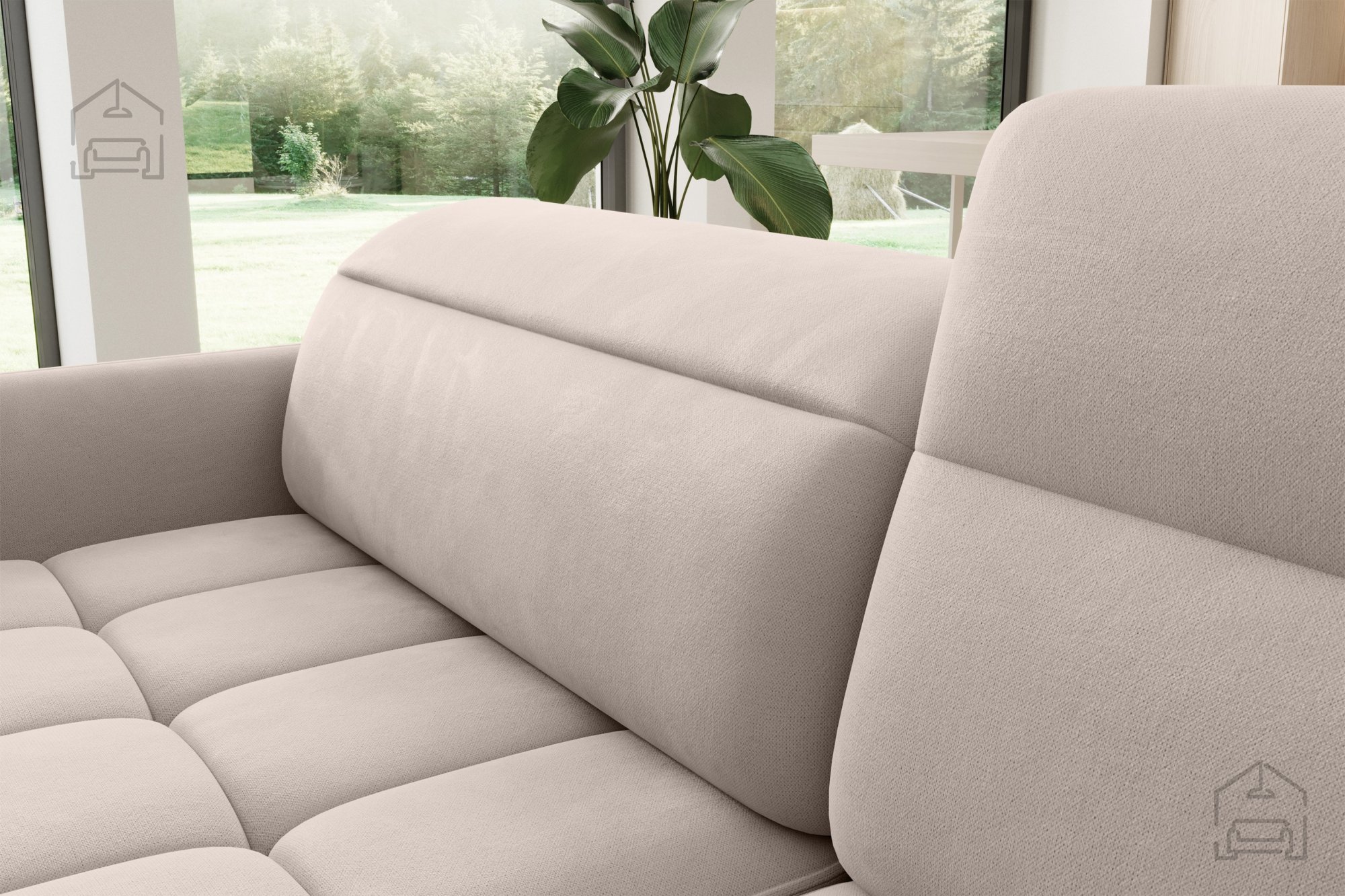 Moderne Ästhetik: Das Ecksofa Barea besticht durch seinen modernen Stil, der sich mühelos in verschiedene Einrichtungsstile einfügt, von minimalistisch bis anspruchsvoll. Es ist in mehreren Farbkombinationen und Stoffen erhältlich, wie dem gezeigten Stoff Sola 18, was eine Anpassung an Ihre persönlichen Vorlieben und die Raumdekoration ermöglicht.