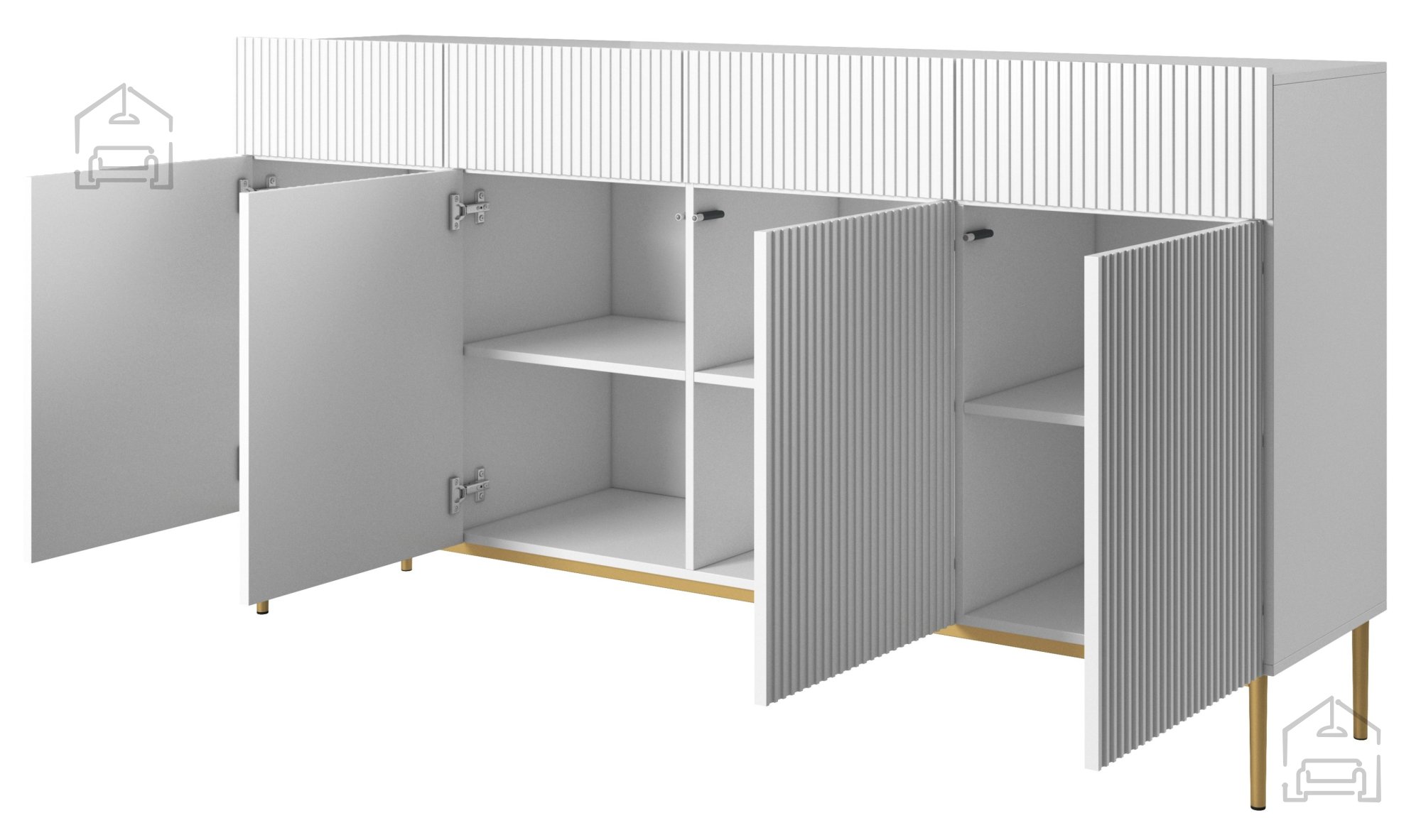 Die Kommode Nicole 200 4D4SZ ist die ideale Wahl für alle, die Wert auf stilvolles Design und Funktionalität legen. Dieses wunderschöne weiße Möbelstück mit markanter Rillenstruktur an den Fronten verleiht Ihrem Zuhause einen Hauch von Eleganz und Modernität. Durch das minimalistische Design und die kontrastierenden schwarzen oder goldfarbenen Metallbeine wird sie garantiert zum Blickfang in Ihrem Wohnzimmer.