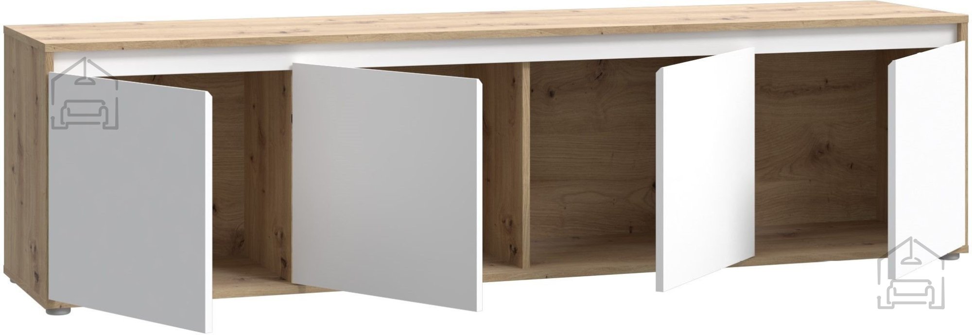 Die Kommode verfügt über vier gleich große Fächer mit grifflosen Türen, die eine diskrete Aufbewahrung Ihrer persönlichen Gegenstände ermöglichen. Ob zur Aufbewahrung von Mediengeräten wie DVDs und Fernbedienungen, Büchern oder anderen Haushaltsutensilien – alles wird sicher verstaut und leicht zugänglich sein.