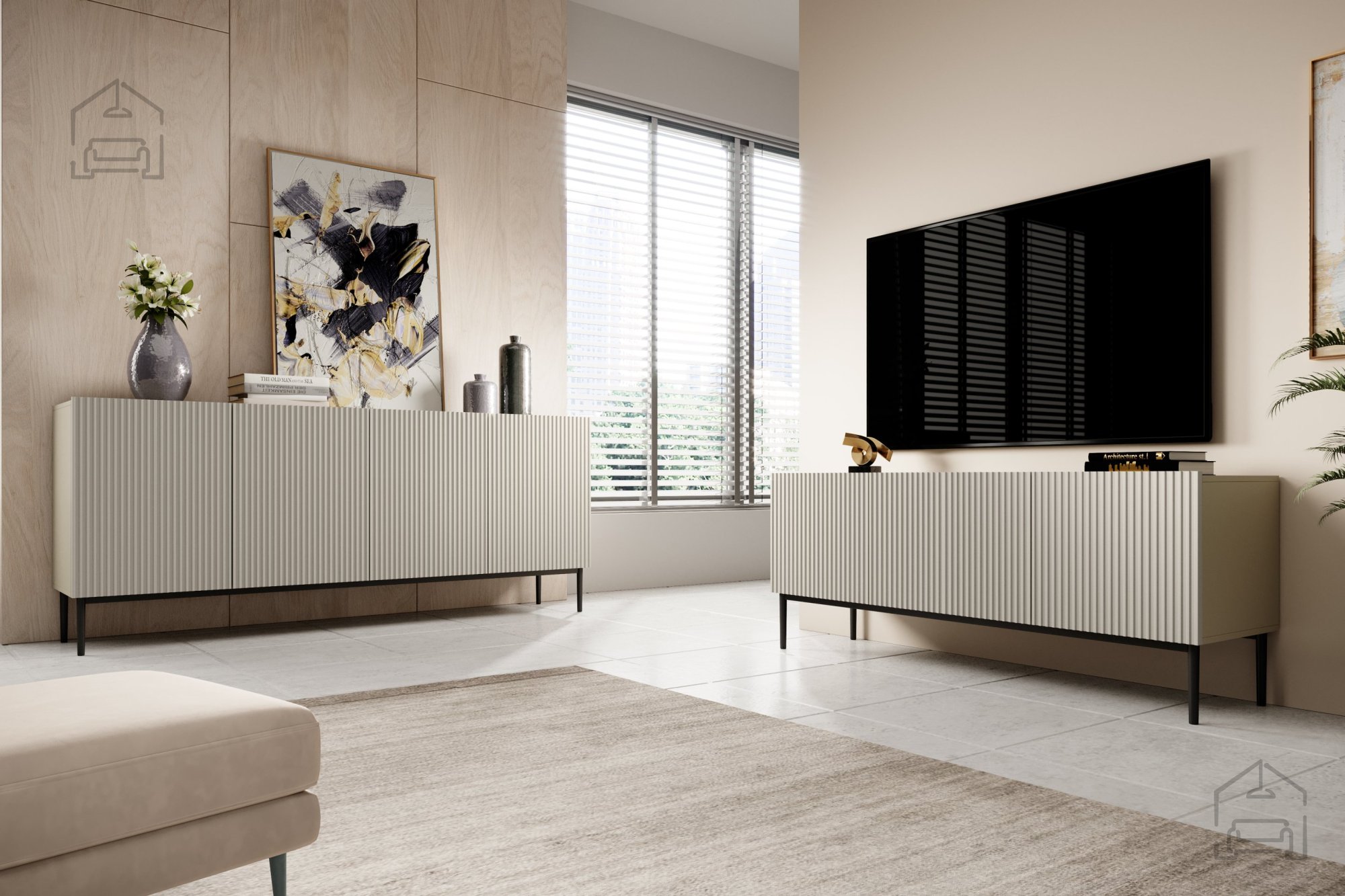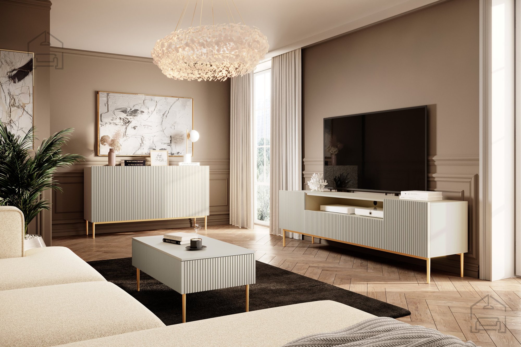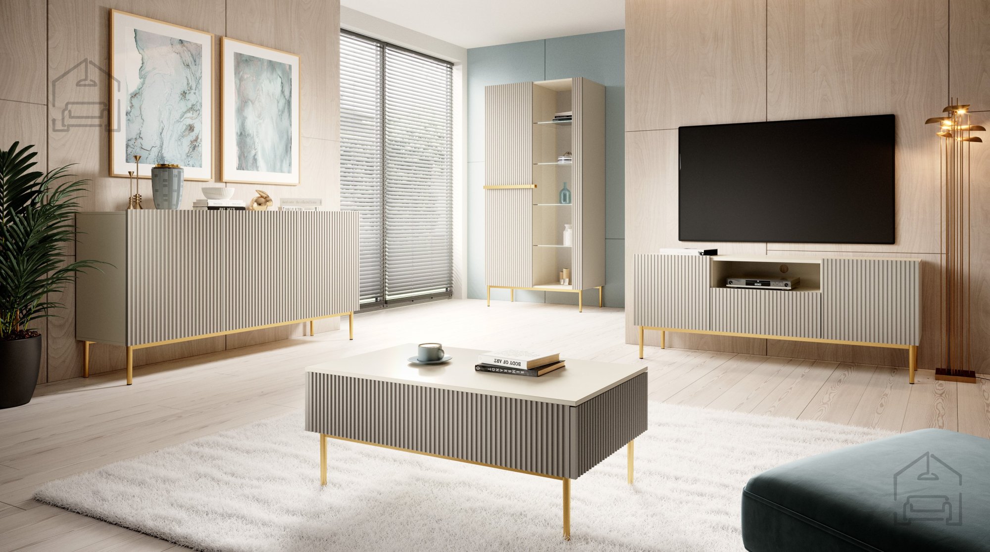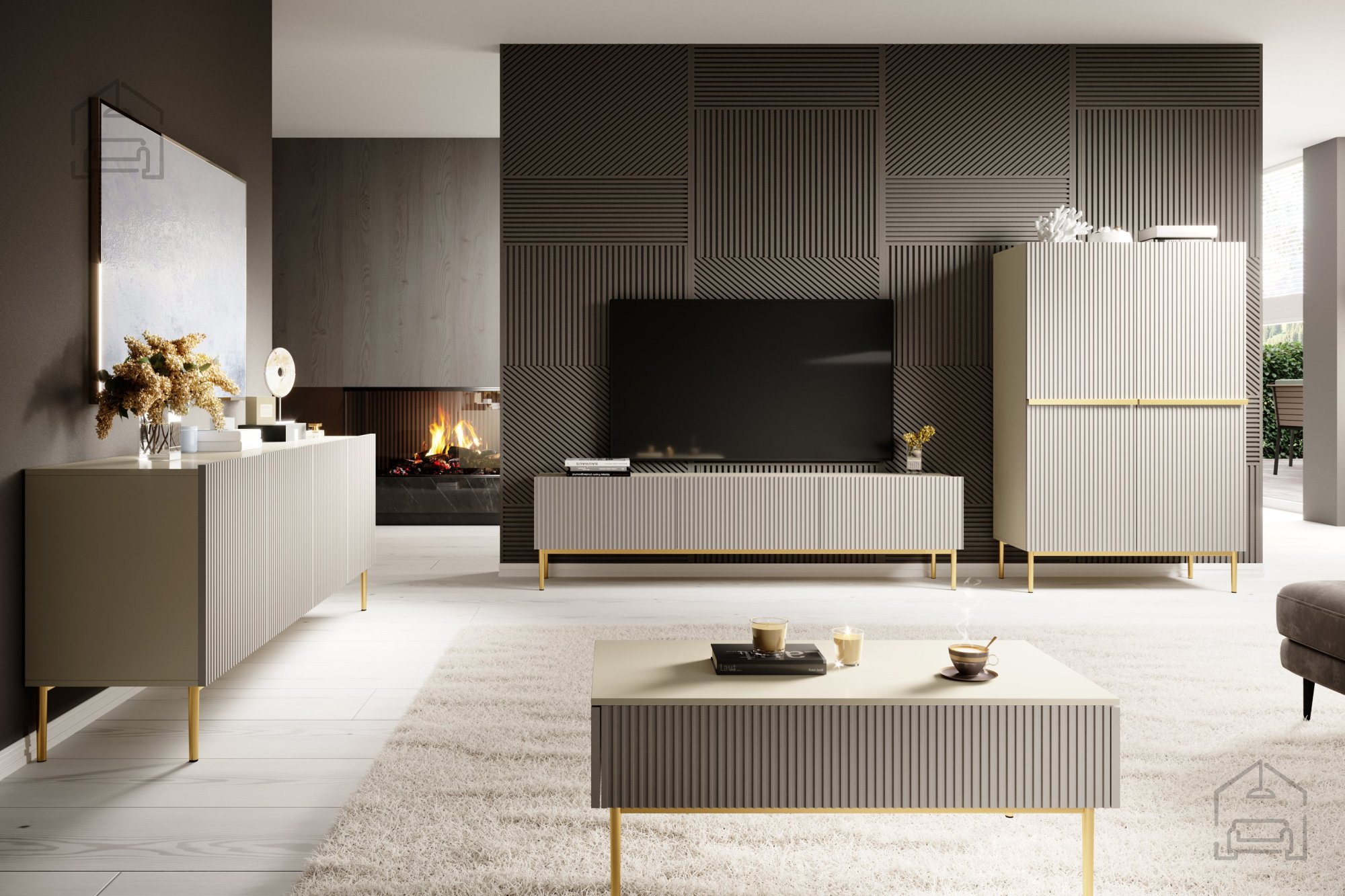 Ästhetischer Reiz: Der Kaschmir-Farbton und das gerillte Frontdesign schaffen eine stilvolle Atmosphäre, die jedes moderne Interieur bereichert.