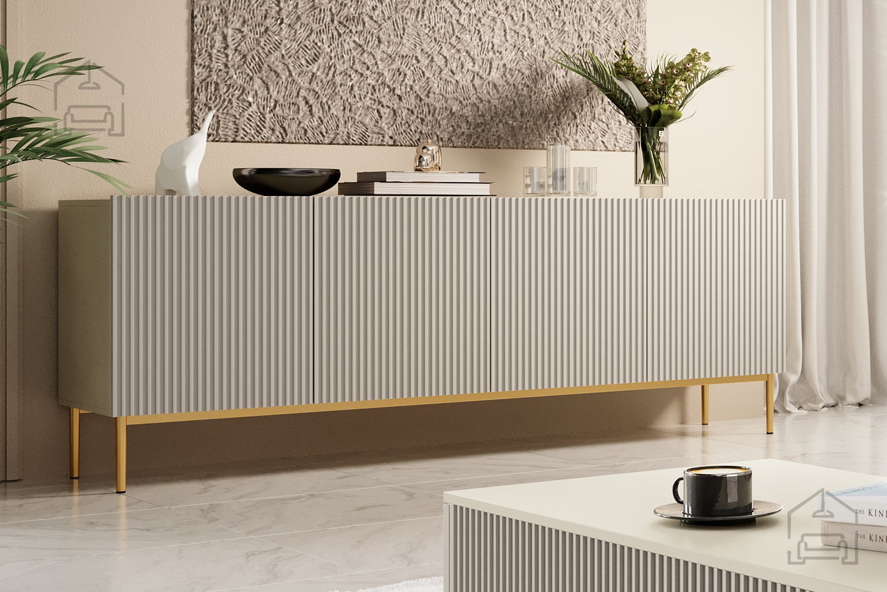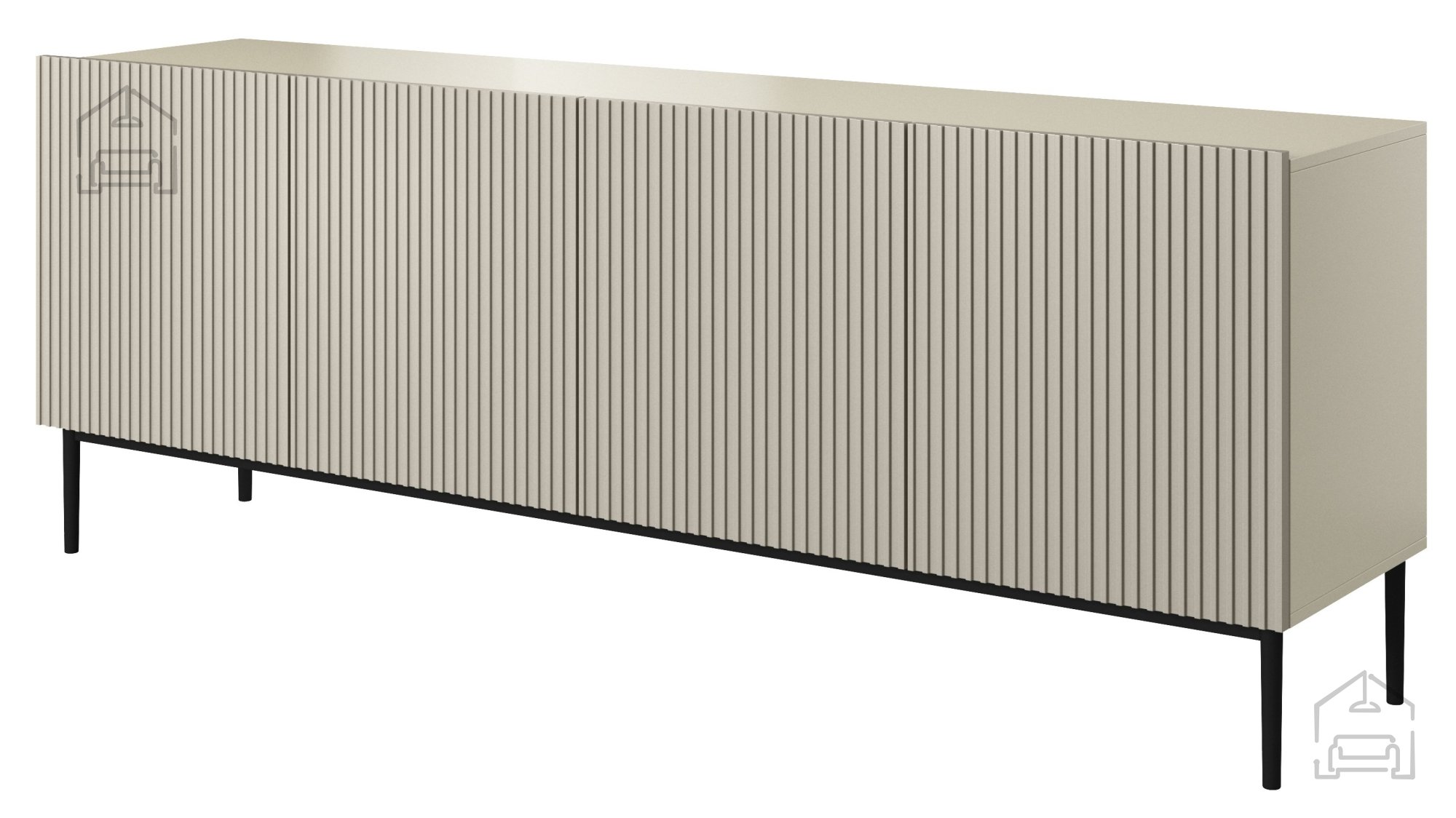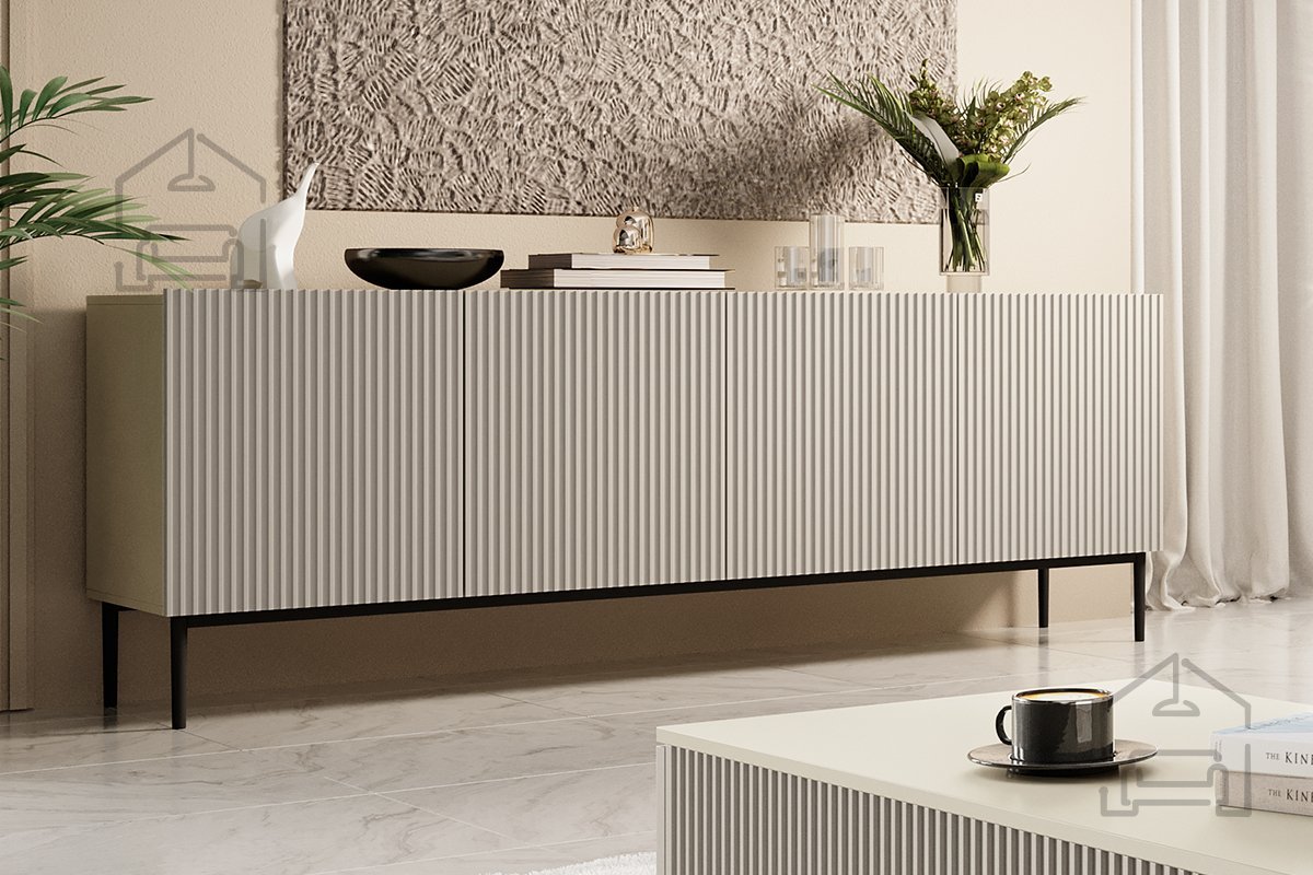 Das besondere Merkmal der Kommode Nicole 200 4D ist die markante, geriffelte Struktur der Fronten, die dem Möbelstück Tiefe und visuelle Spannung verleiht. Dank der Push-to-Open-Funktion lässt sich die Kommode bequem ohne Griffe öffnen, wodurch ihr klarer, minimalistischer Stil erhalten bleibt. Die pulverbeschichteten Metallbeine – wahlweise in Schwarz oder Gold – sorgen für Stabilität und setzen moderne Akzente. Mit einer Höhe von 20 cm erleichtern sie zudem das Reinigen unter der Kommode.