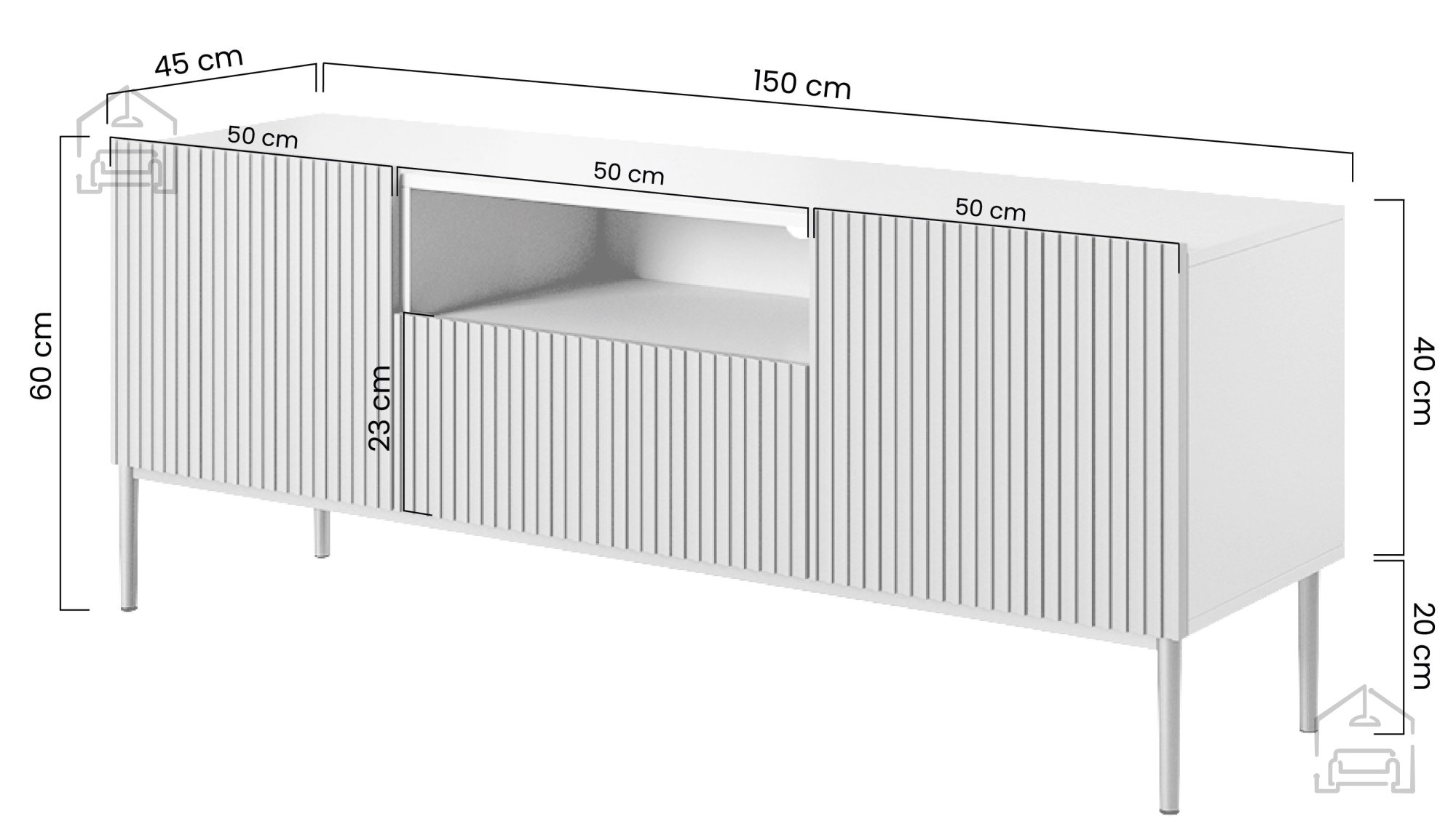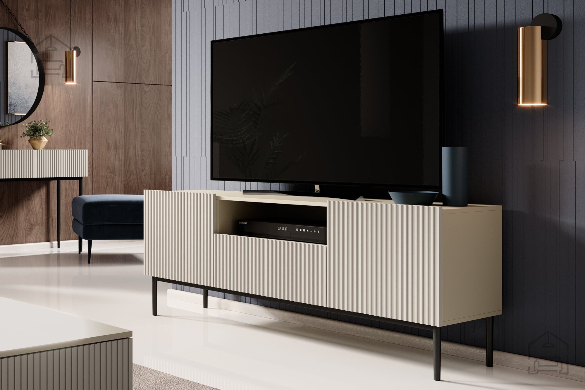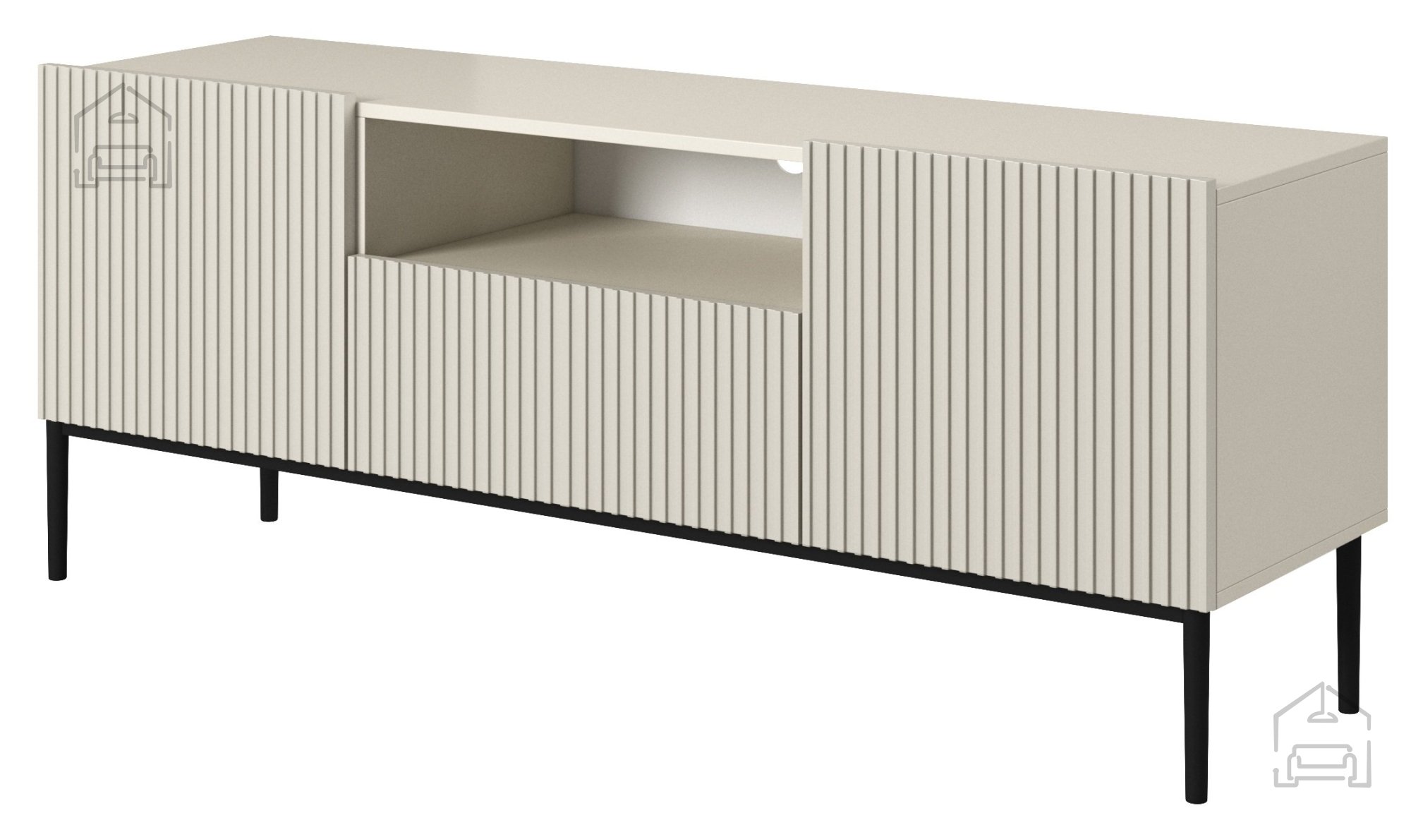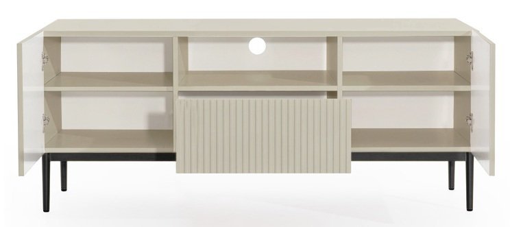 Eines der auffälligsten Designelemente der TV-Kommode Nicole ist das markante Rillenmuster auf den Fronten, das Tiefe und Struktur verleiht. Diese vertikale Gestaltung zieht die Blicke auf sich und bringt optische Dynamik in den Raum. Das Push-to-Open-System ermöglicht ein komfortables, griffloses Öffnen und Schließen – elegant und praktisch zugleich.