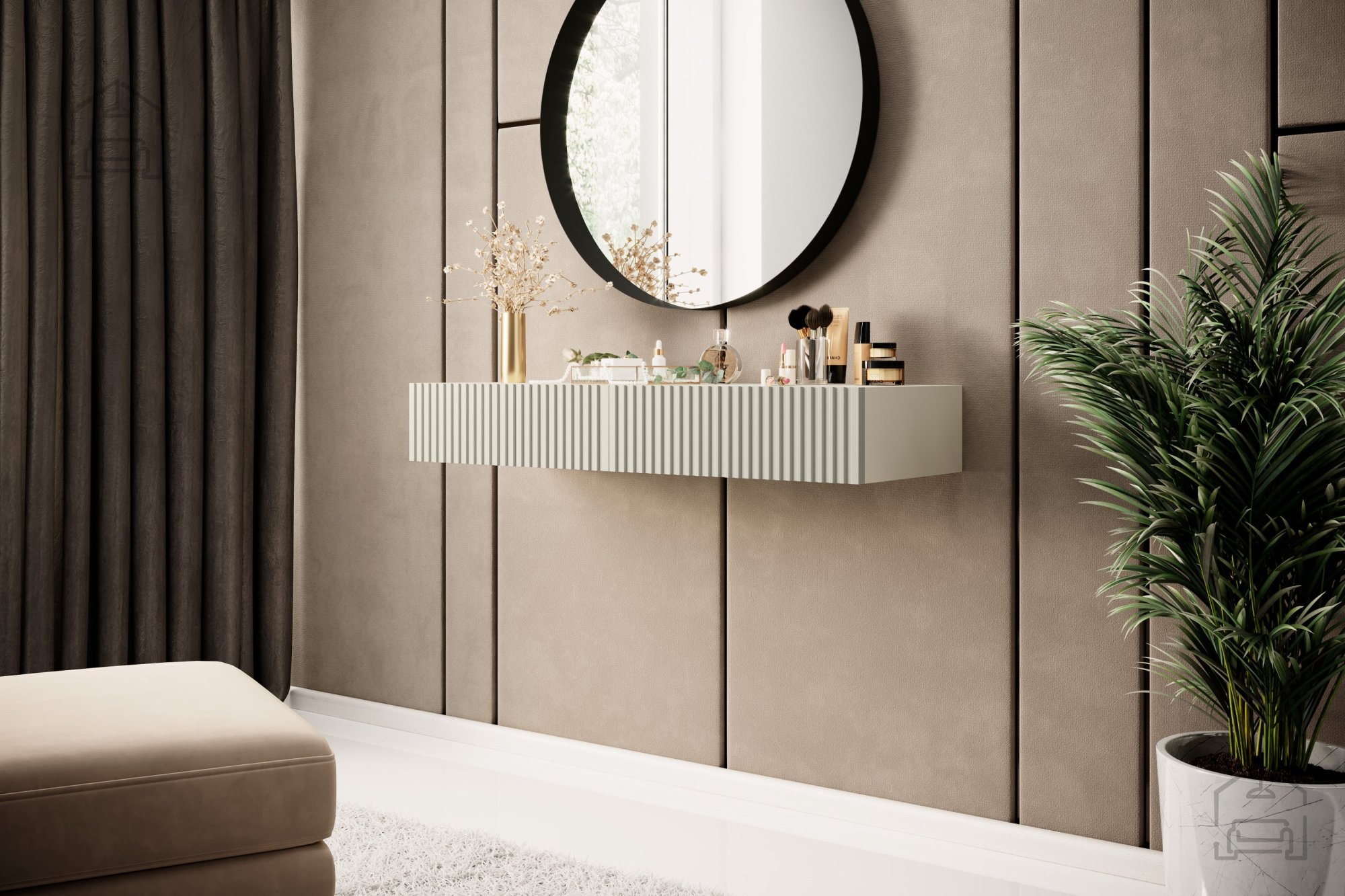 Haben Sie sich schon einmal einen Platz gewünscht, an dem Sie sich in Ruhe und Komfort Ihrer Schönheit widmen können? Wir präsentieren Ihnen den Wand-Schminktisch Nicole 100 2SZ in der edlen Farbe Kaschmir – ein Möbelstück, das Ihrem Zuhause einen Hauch von Eleganz und praktischer Raffinesse verleiht. Dieses formschöne Modell verbindet modernes Design mit hoher Funktionalität und ist damit die ideale Wahl für jedes zeitgemäße Zuhause.