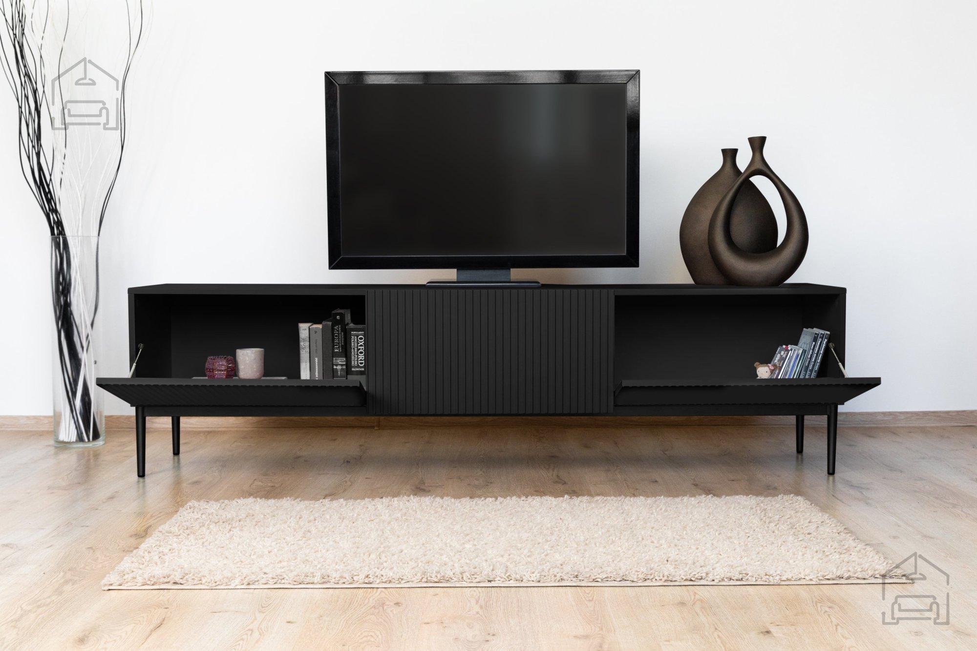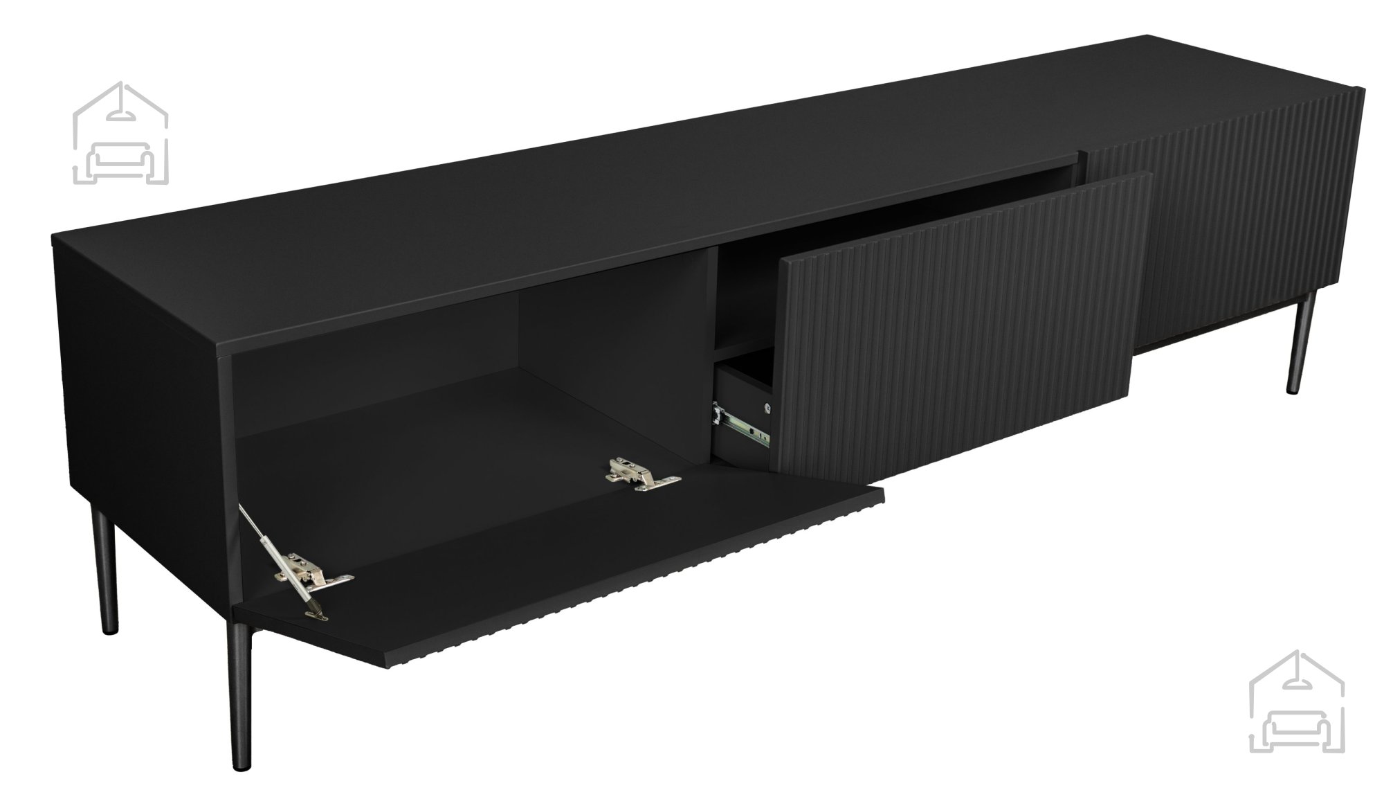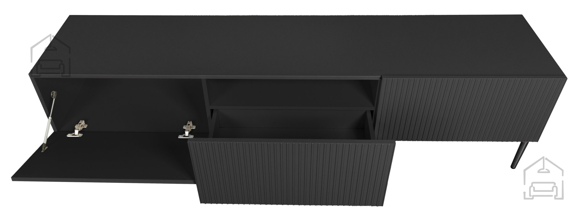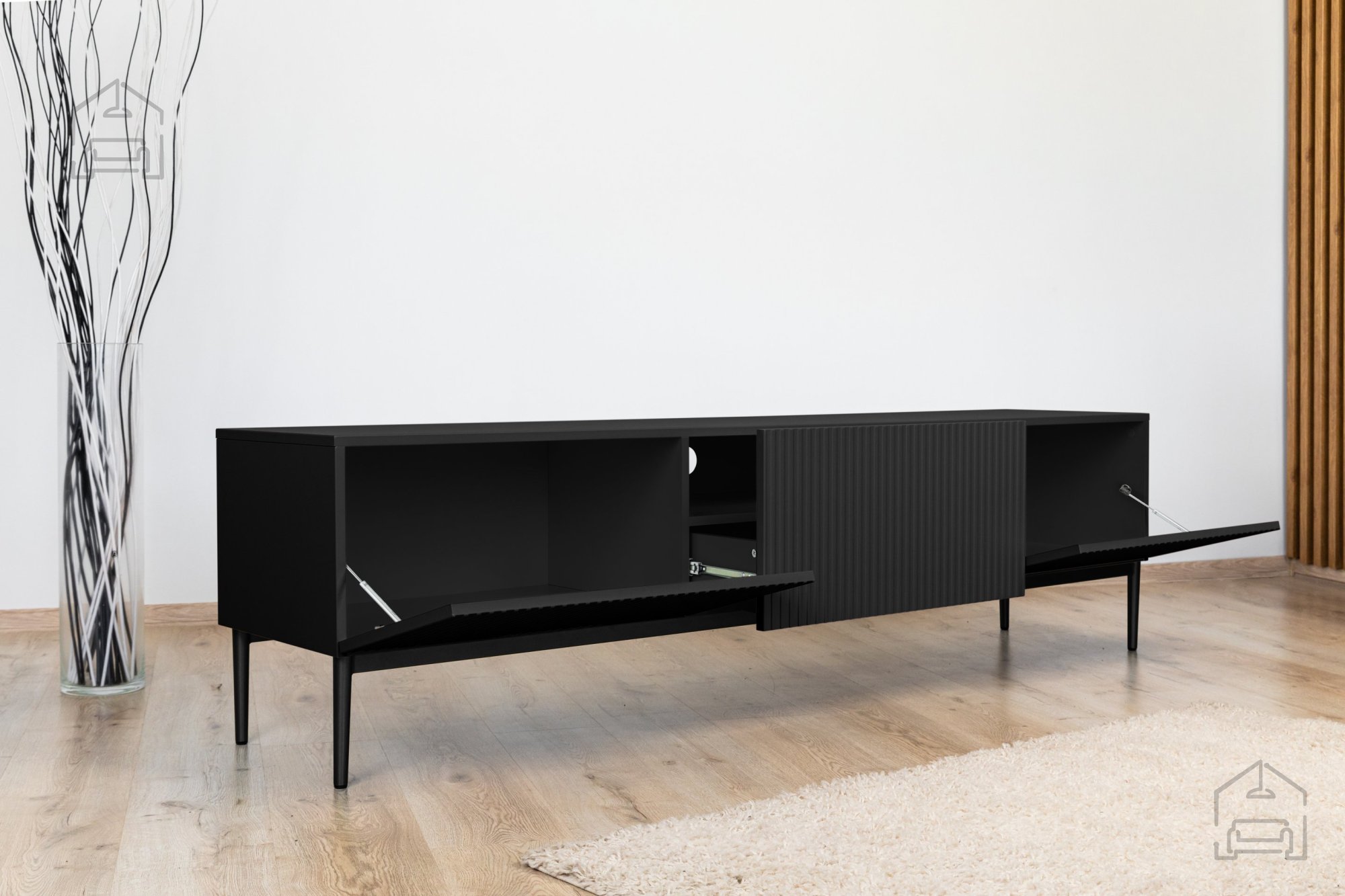 Ein besonderes Merkmal der TV-Kommode Nicole ist das vertikal strukturierte Rillenmuster auf den Fronten, das dem Möbel Tiefe und Raffinesse verleiht. Das Push-to-Open-System ermöglicht ein bequemes Öffnen ohne Griffe – für eine klare, moderne Linienführung. Warum sollten Sie sich für die TV-Kommode Nicole 200 2K1SZ entscheiden? Hier sind einige ihrer wichtigsten Vorteile: