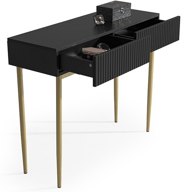 Der Schminktisch Nicole 100 2SZ in Schwarz ist die perfekte Wahl für alle, die eine gelungene Kombination aus Stil, Funktionalität und Qualität suchen. Dieser Tisch überzeugt nicht nur durch sein ansprechendes Design, sondern auch durch seine hohe Alltagstauglichkeit – er bietet reichlich Platz für Ihre Kosmetika und Accessoires.