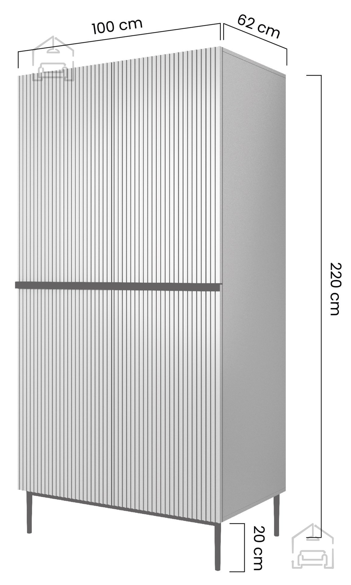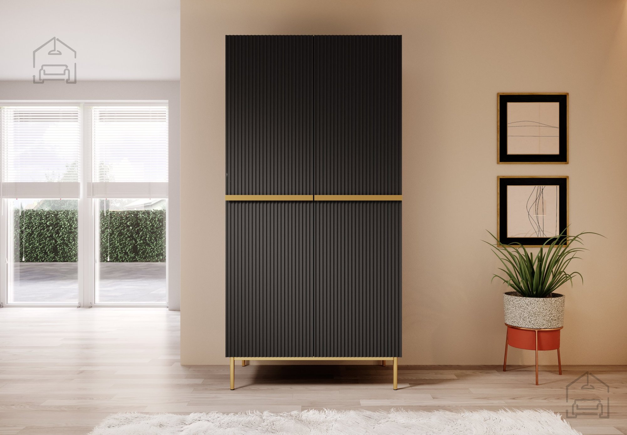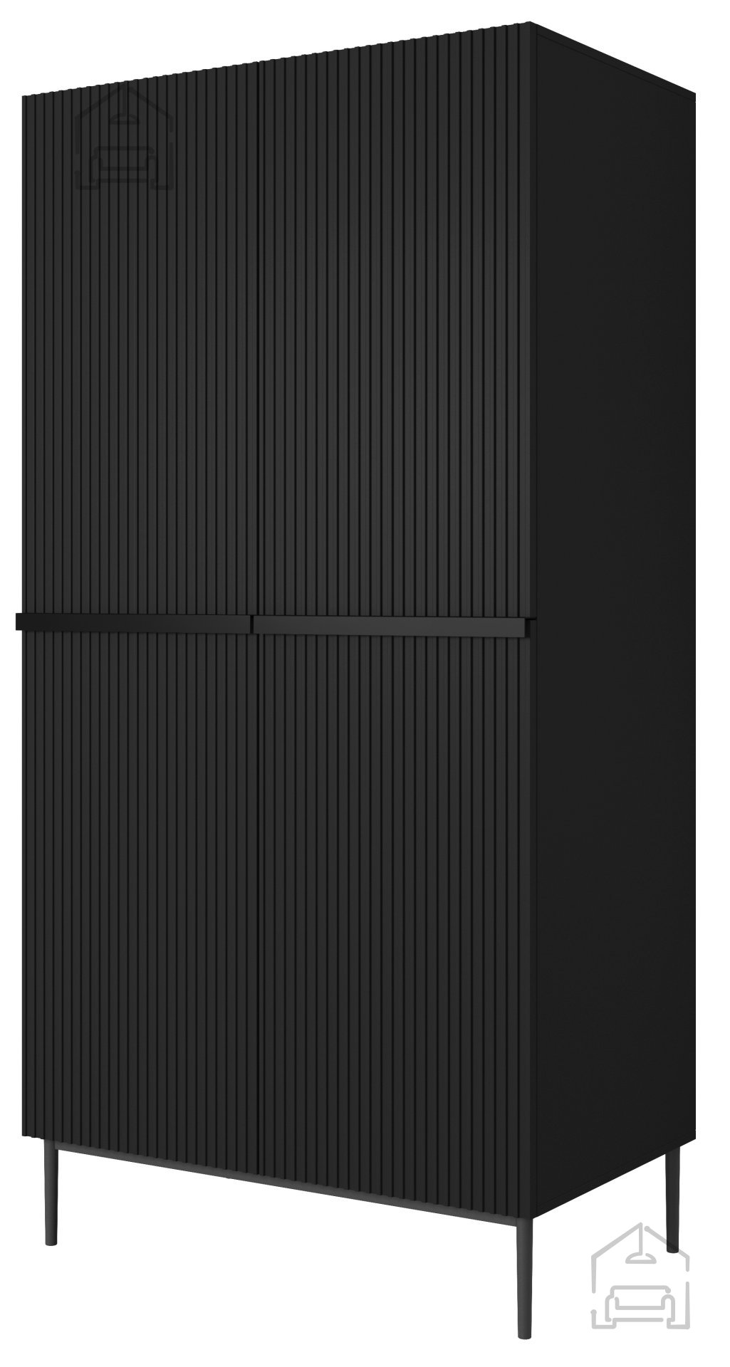 Nicole 100 2DP besticht durch ihr charakteristisches, vertikal strukturiertes Rillenmuster auf den Fronten, das dem Möbelstück eine edle und individuelle Note verleiht. Das schwarze Finish harmoniert perfekt mit modernen Wohnräumen, während die Metallfüße – wahlweise in Schwarz oder Gold – einen Hauch von Luxus hinzufügen. Die pulverbeschichteten Beine mit einer Höhe von 20 cm erleichtern das Reinigen unter dem Schrank und unterstreichen zugleich den minimalistischen Stil.