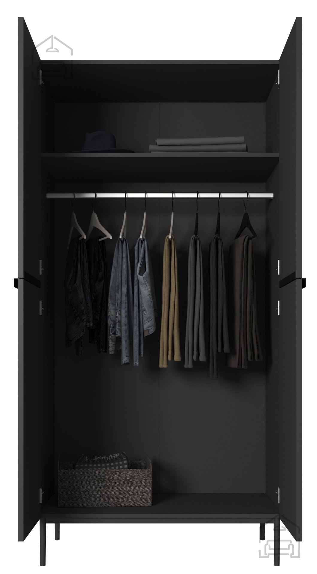 Wenn Sie ein harmonisches Zusammenspiel von modernem Design und praktischer Alltagstauglichkeit suchen, ist der Kleiderschrank Nicole 100 2DP in Schwarz genau das Richtige für Sie. Dieses Modell wurde mit Blick auf Ihre Bedürfnisse und Ihren Geschmack entworfen – es vereint Stil, hochwertige Materialien und Funktionalität in einem.